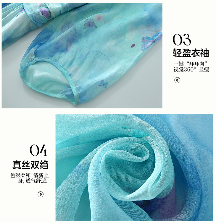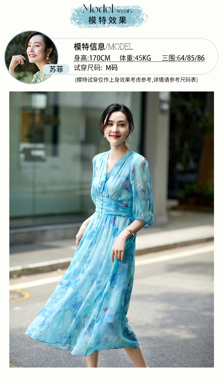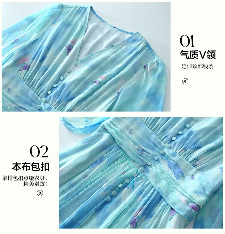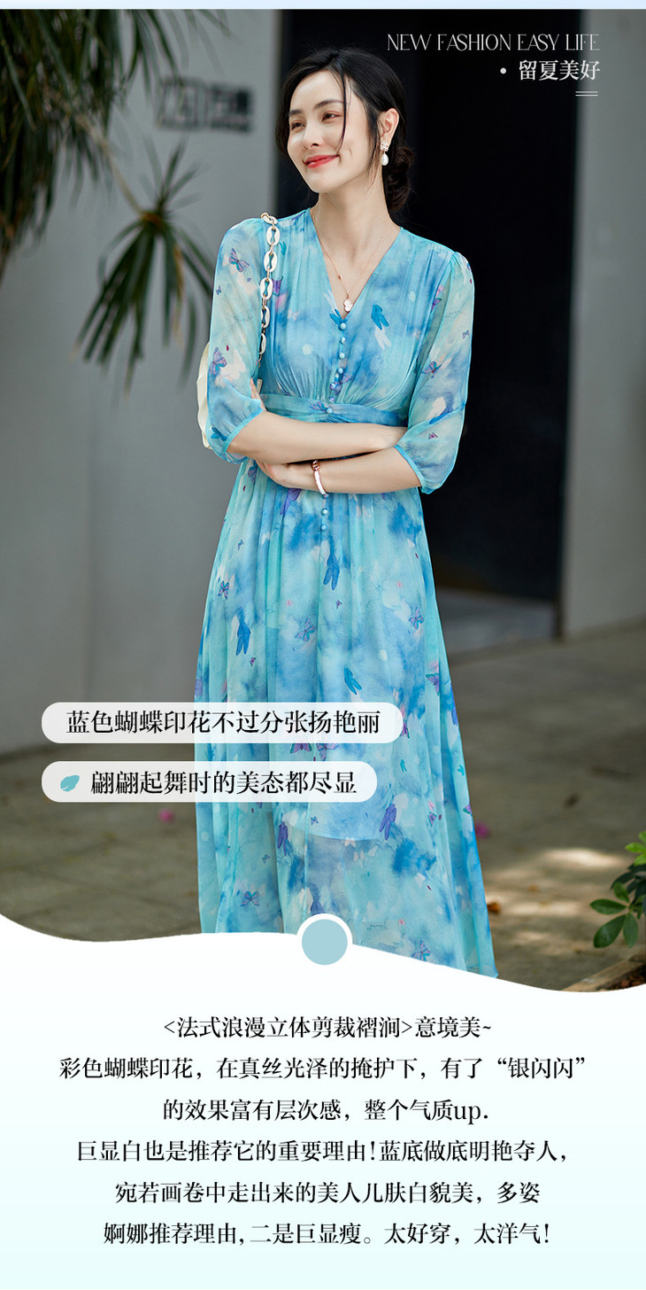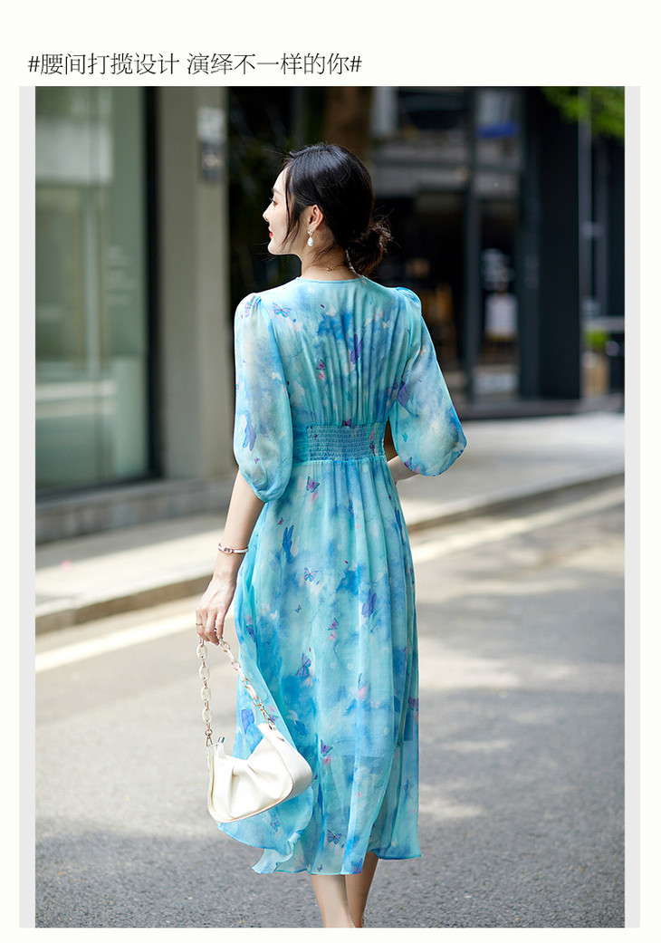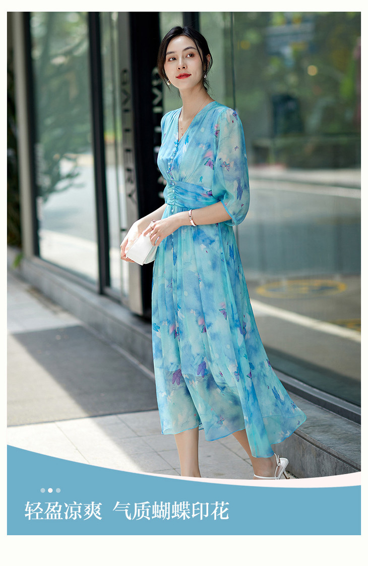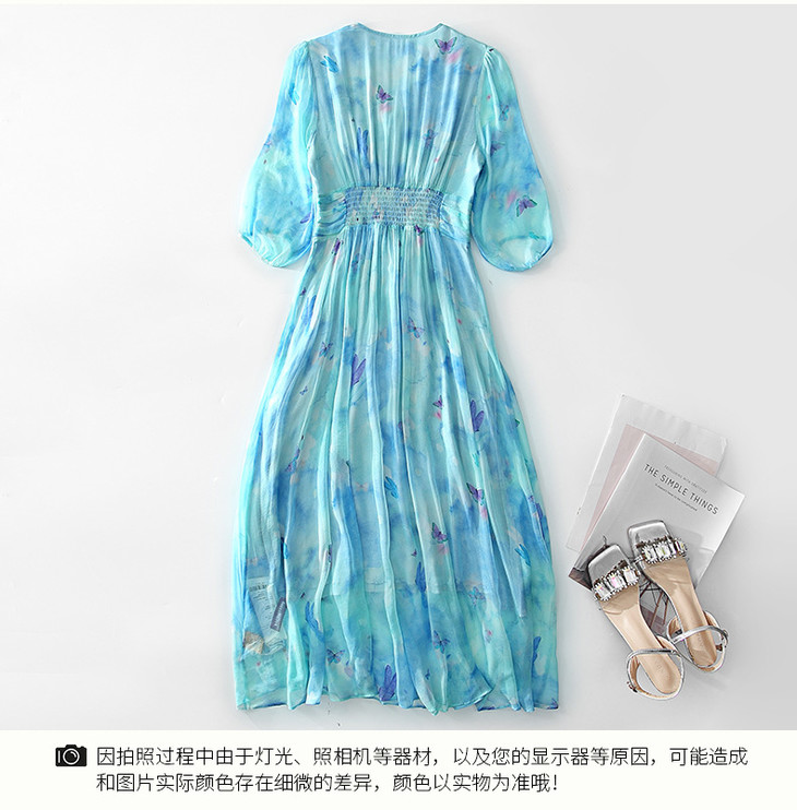 彩蝶印花松紧腰双绉真丝连衣裙CS90433