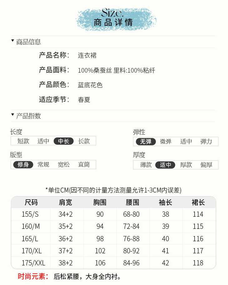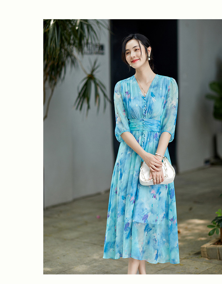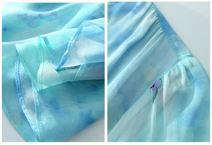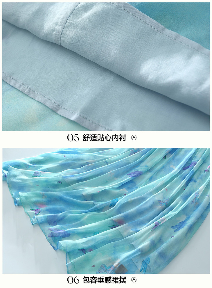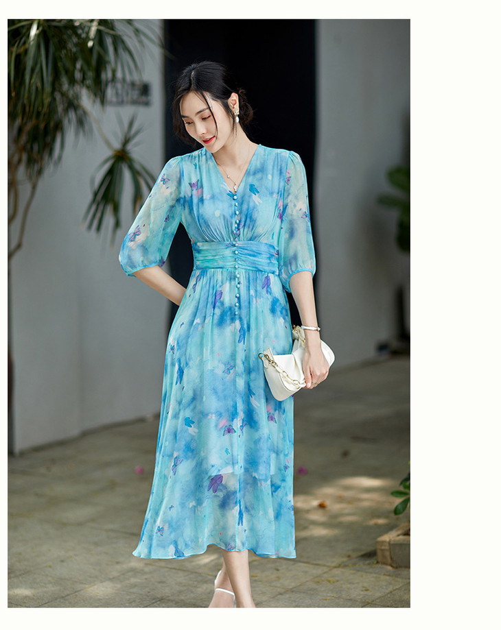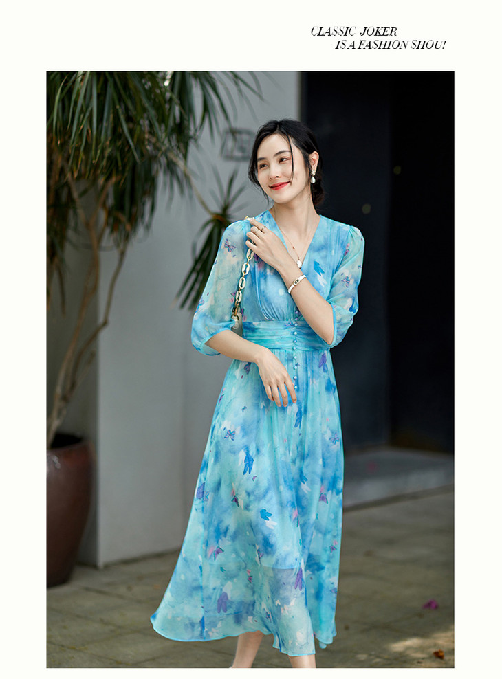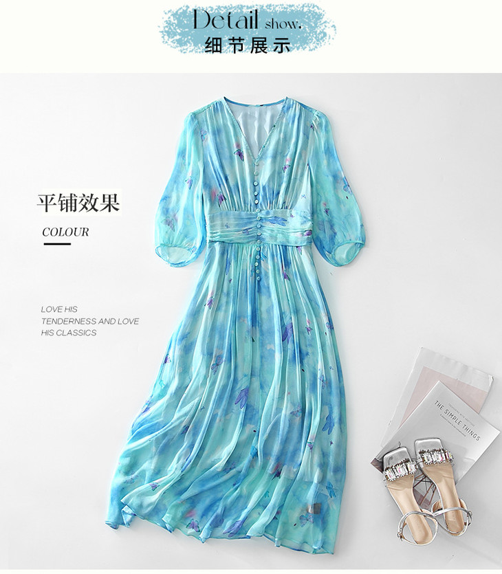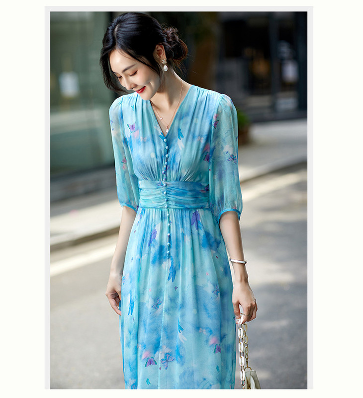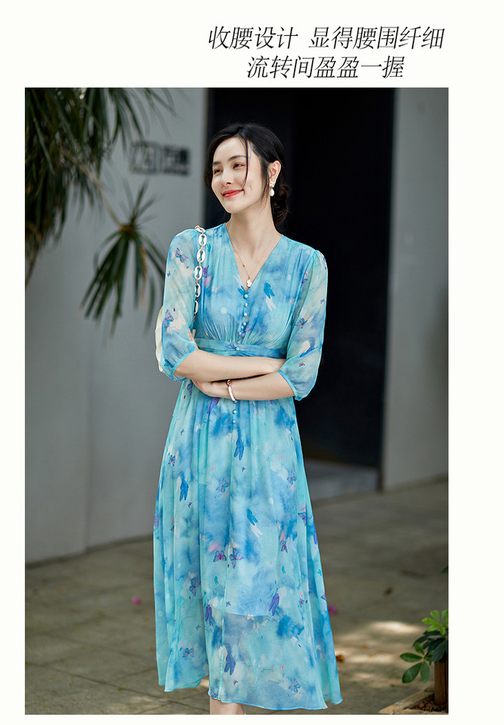彩蝶印花松紧腰双绉真丝连衣裙CS90433