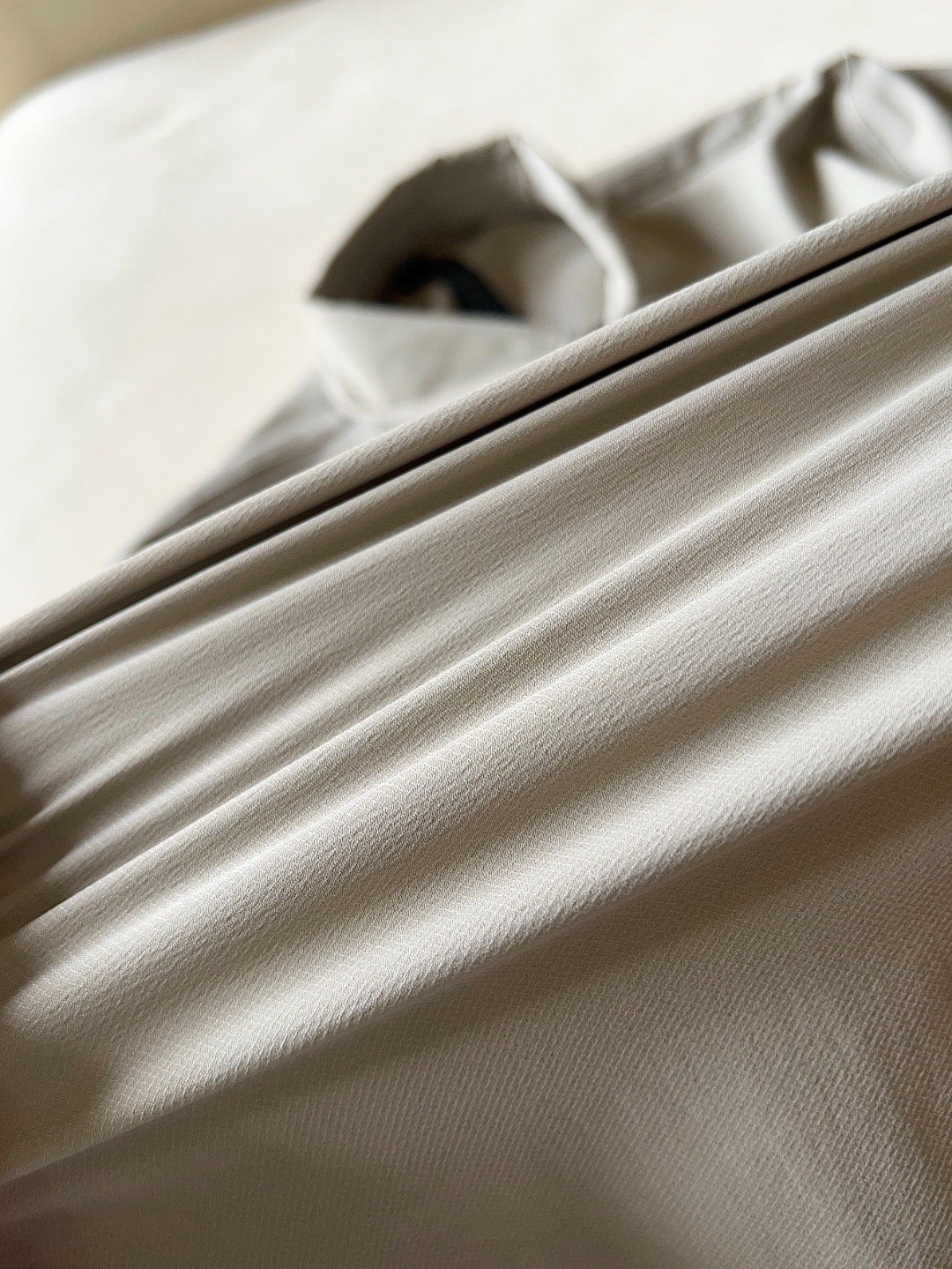 它的触感偏向柔软 长绒梭织工艺 能保持一定挺括筋骨 同时又比较亲肤
