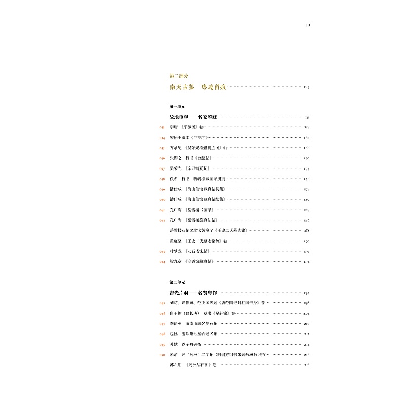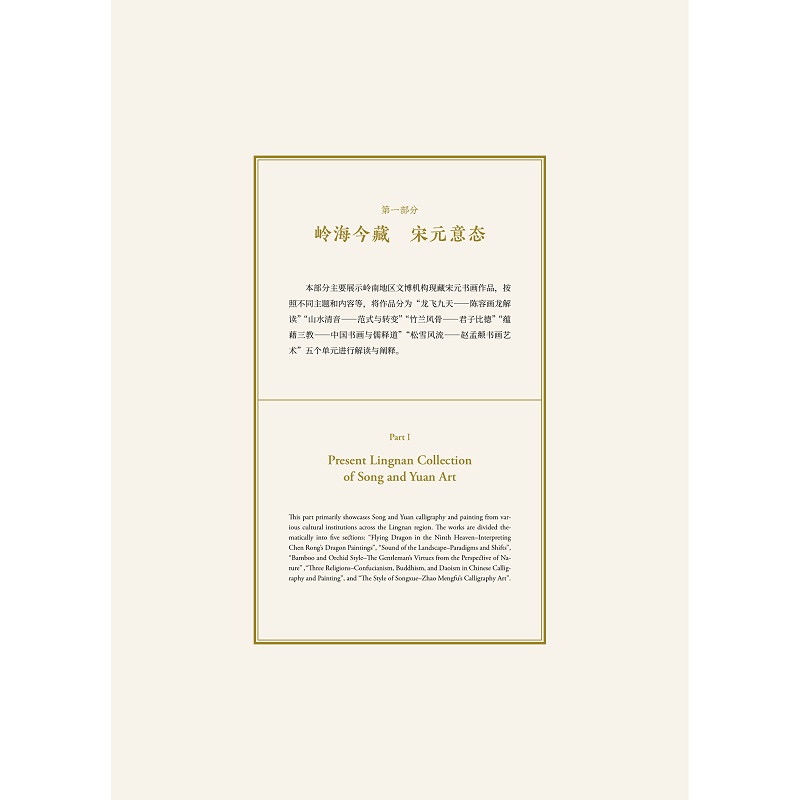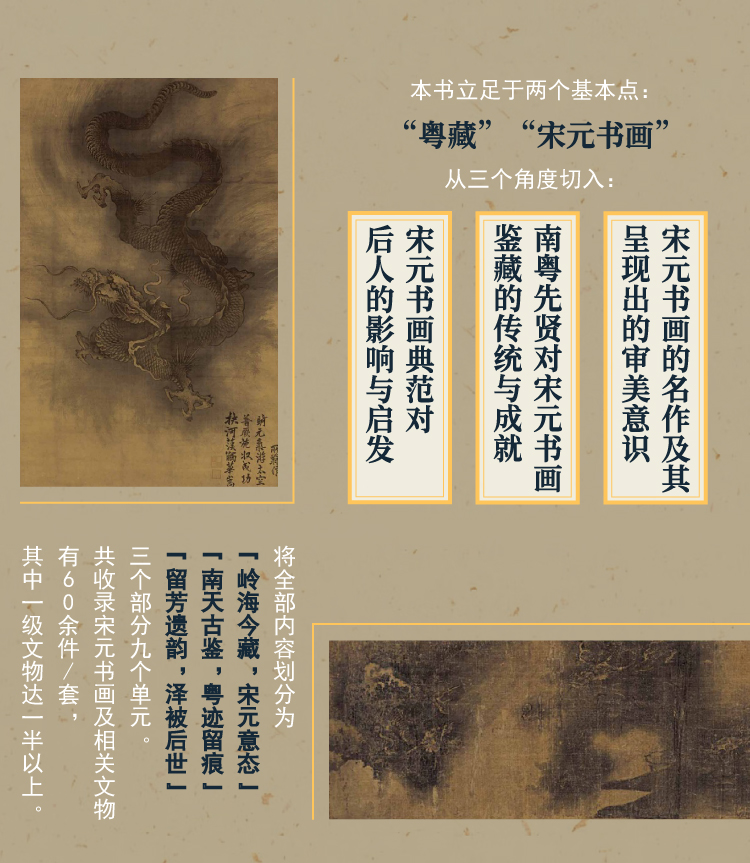 本书立足于“粤藏”和“宋元书画”两个基本点,从宋元书画的名作及其呈现出的审美意识、南粤先贤对宋元书画鉴藏的传统与成就、宋元书画典范对后人的影响与启发三个角度切入,将全部内容划分为“岭海今藏,宋元意态”“南天古鉴,粤迹留痕”“留芳遗韵,泽被后世”三个部分九个单元。共收录宋元书画及相关文物有60余件/套,其中一级文物达一半以上。代表性作品有广东省博物馆藏陈容《墨龙图》、赵孟頫行书《陋室铭》等宋元书画珍品以及清代吴荣光、孔广陶收藏过的宋拓王沇本兰亭序,潘仕成收藏过的南宋张即之行书《台慈帖》等;广东人最早的两件传世书法作品刘昉题跋、白玉蟾草书《足轩铭》、吴南生捐赠的《群峰晴雪图》《平沙落雁图》卷以及恽寿平题跋、容庚检点珍藏最得意者的“黄公望山水半幅”《溪山图》等。