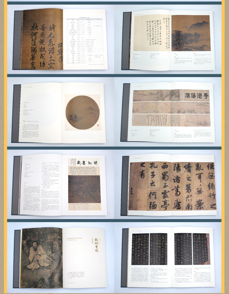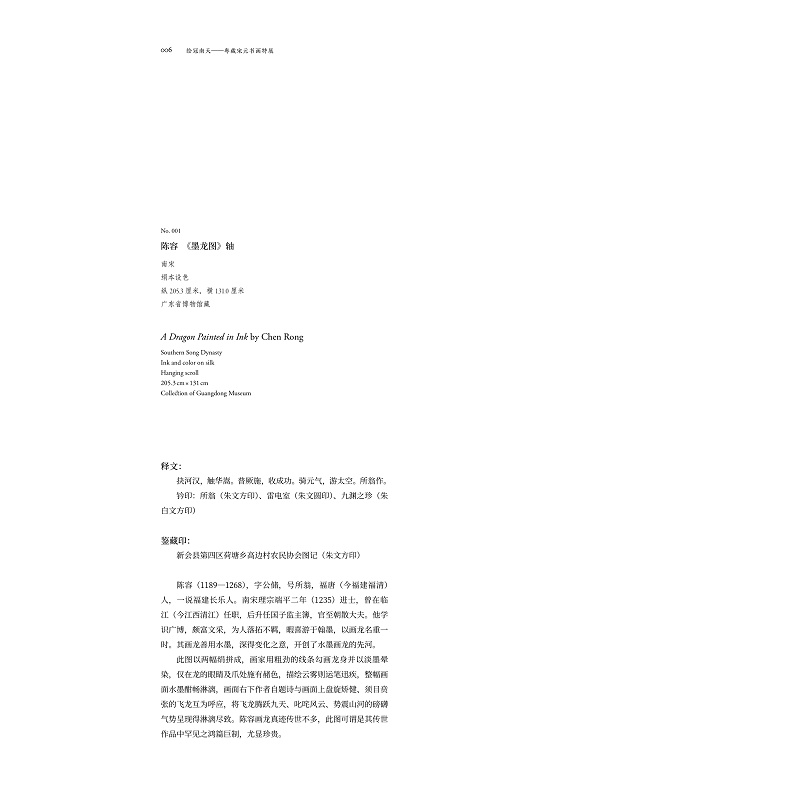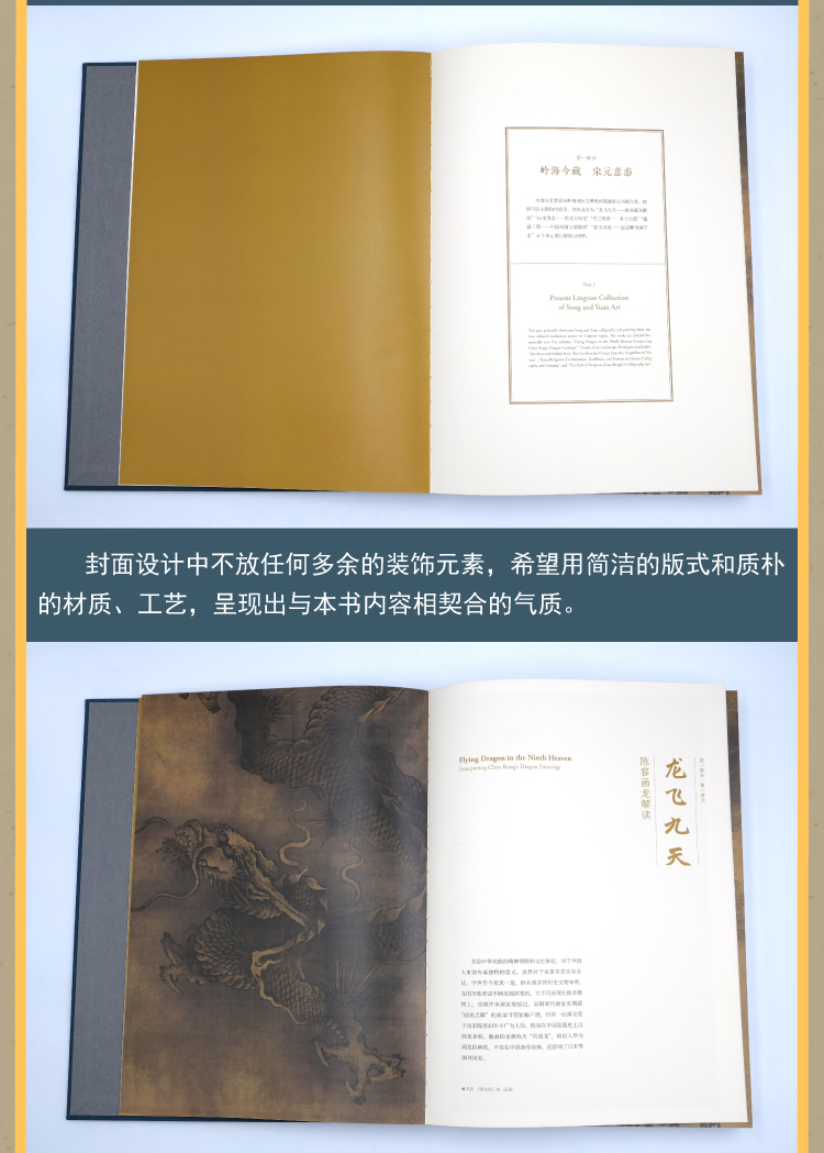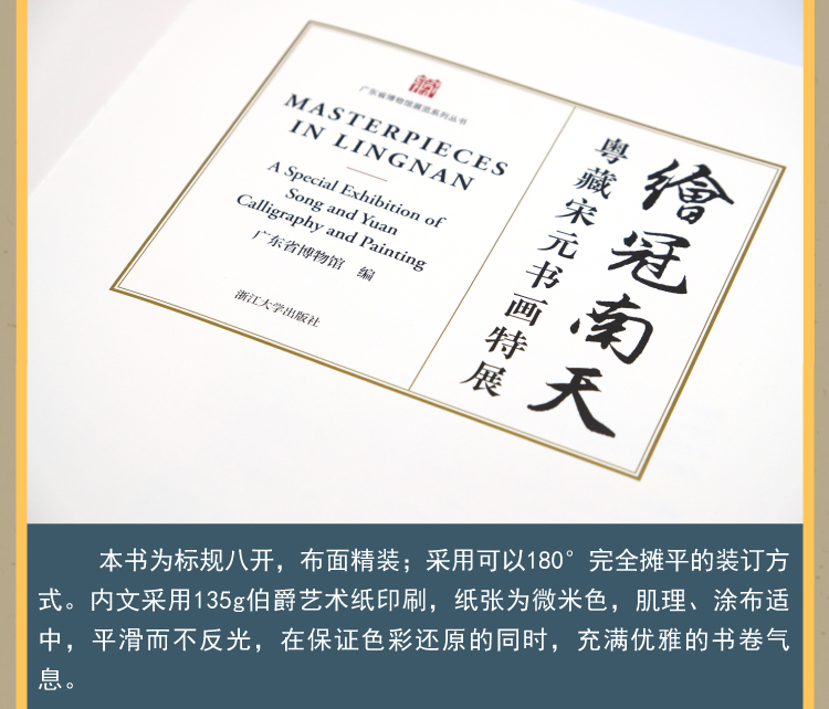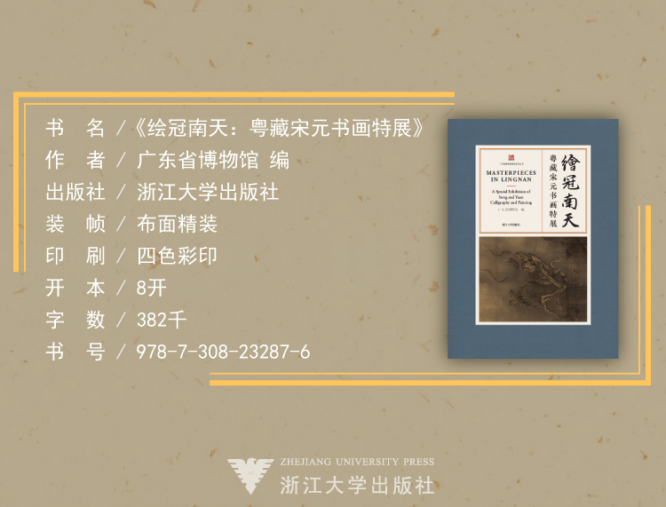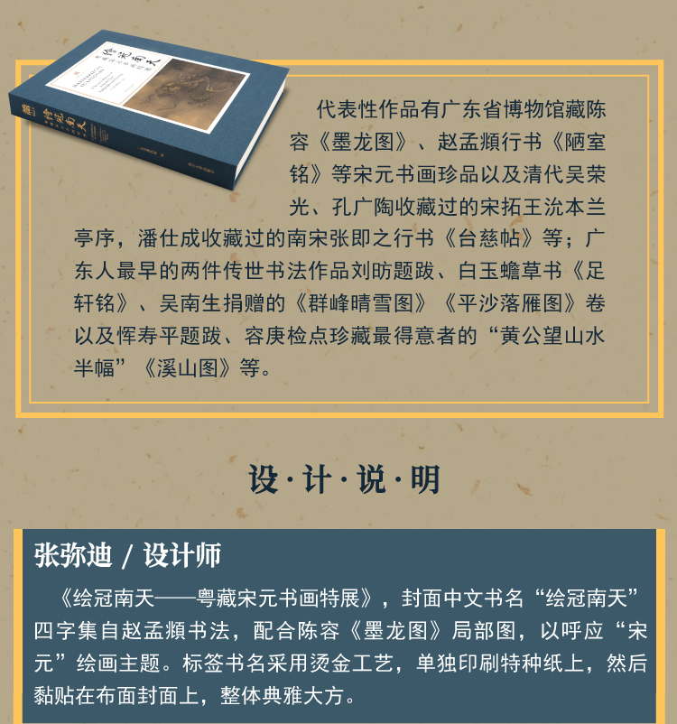 《绘冠南天——粤藏宋元书画特展》,封面中文书名“绘冠南天”四字集自赵孟頫书法,配合陈容《墨龙图》局部图,以呼应“宋元”绘画主题。标签书名采用烫金工艺,单独印刷特种纸上,然后黏贴在布面封面上,整体典雅大方。
