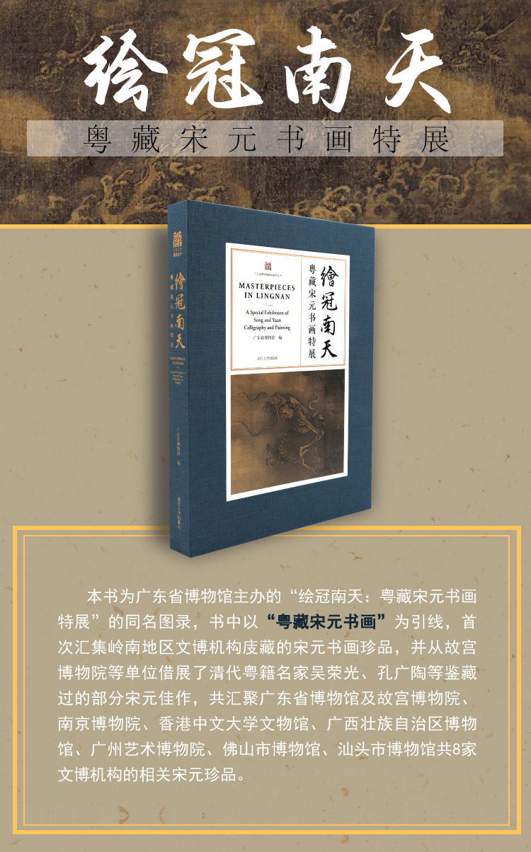本书为广东省博物馆主办的“绘冠南天:粤藏宋元书画特展”的同名图录,书中以“粤藏宋元书画”为引线,首次汇集岭南地区文博机构庋藏的宋元书画珍品,并从故宫博物院等单位借展了清代粤籍名家吴荣光、孔广陶等鉴藏过的部分宋元佳作,共汇聚广东省博物馆及故宫博物院、南京博物院、香港中文大学文物馆、广西壮族自治区博物馆、广州艺术博物院、佛山市博物馆、汕头市博物馆共 8 家文博机构的相关宋元珍品。