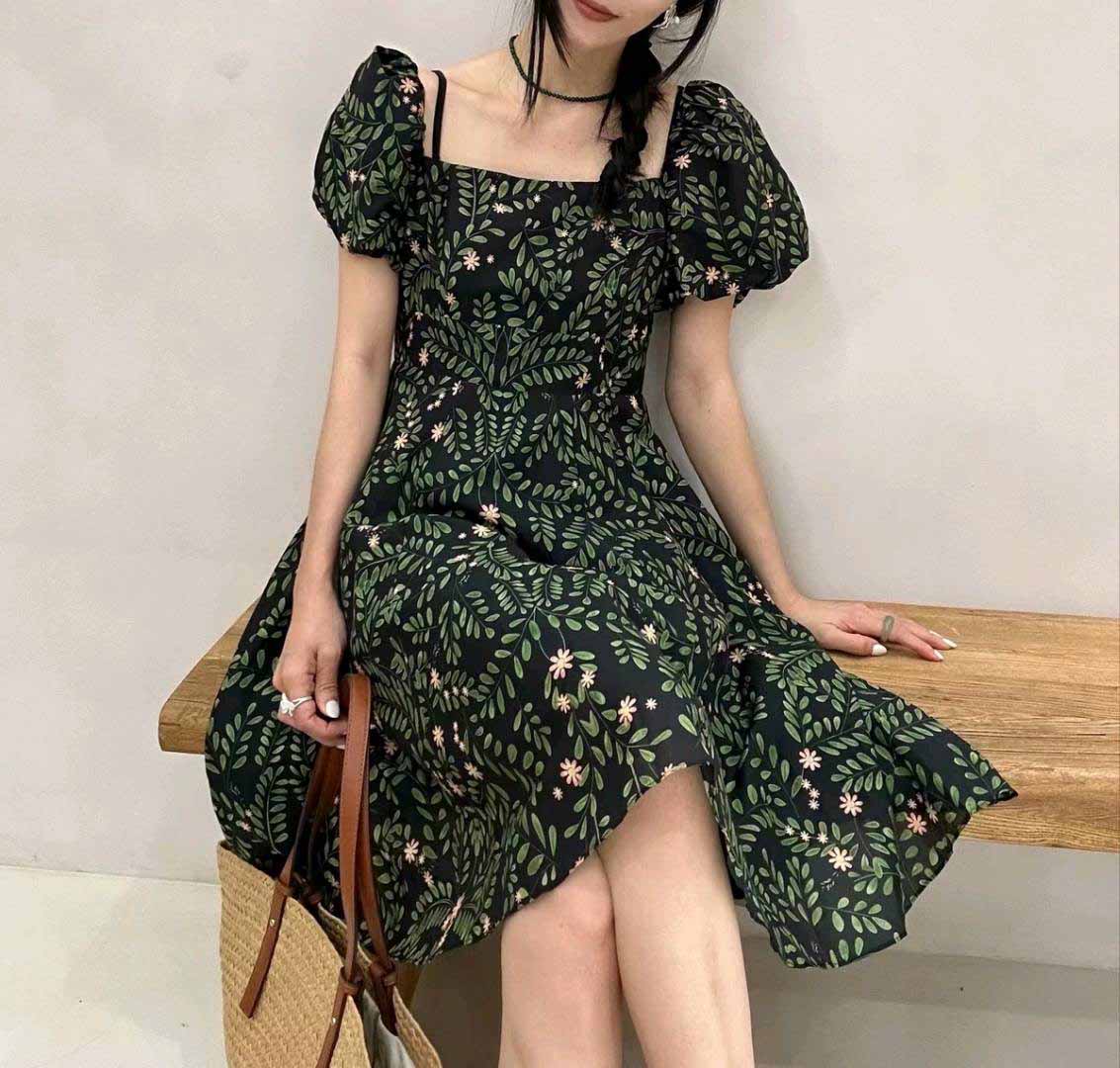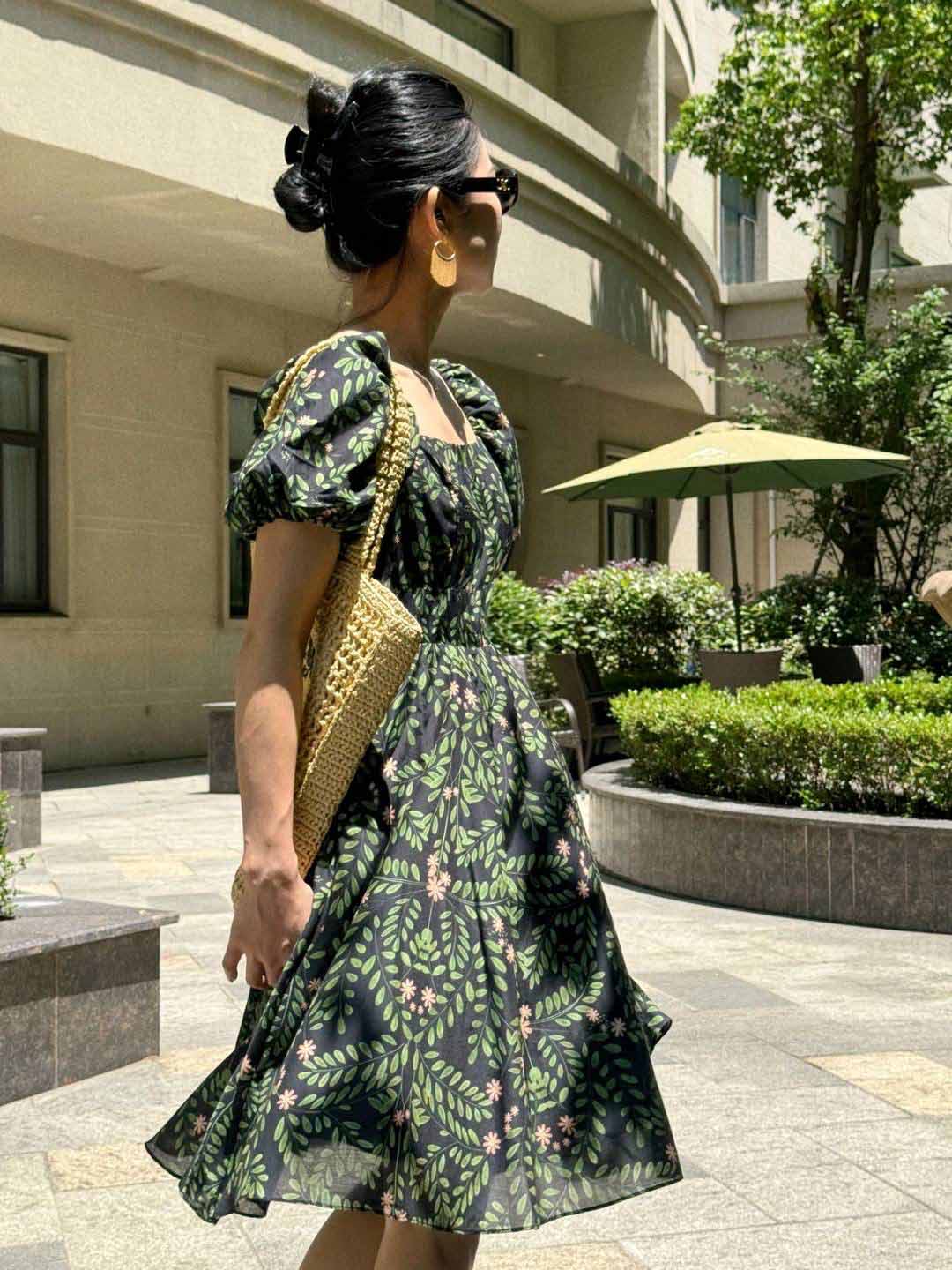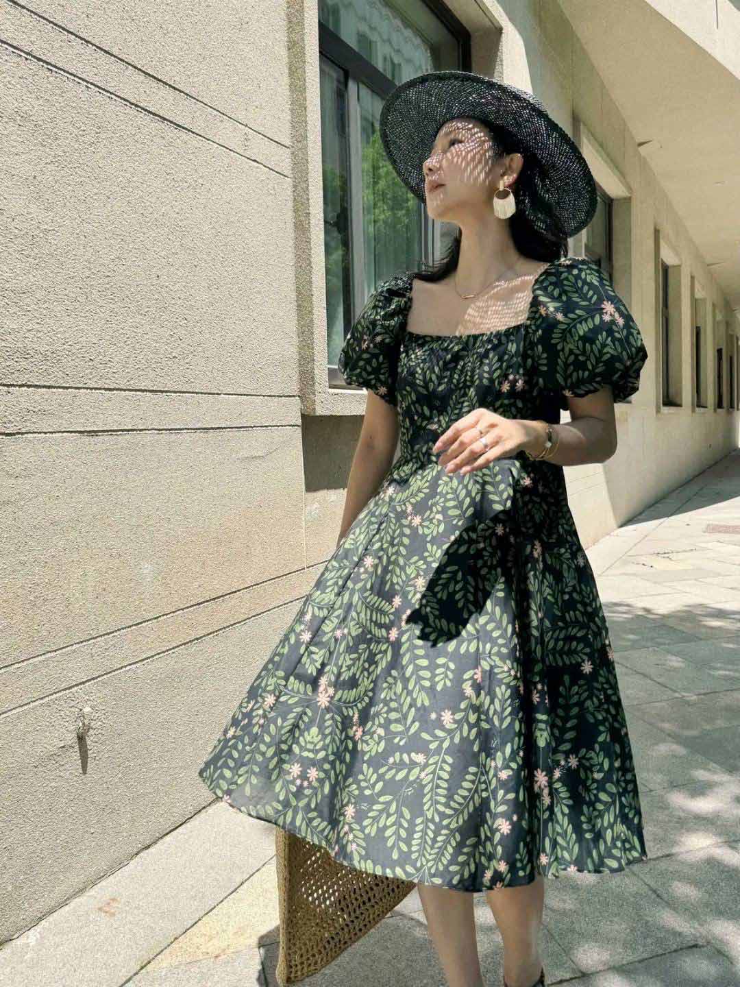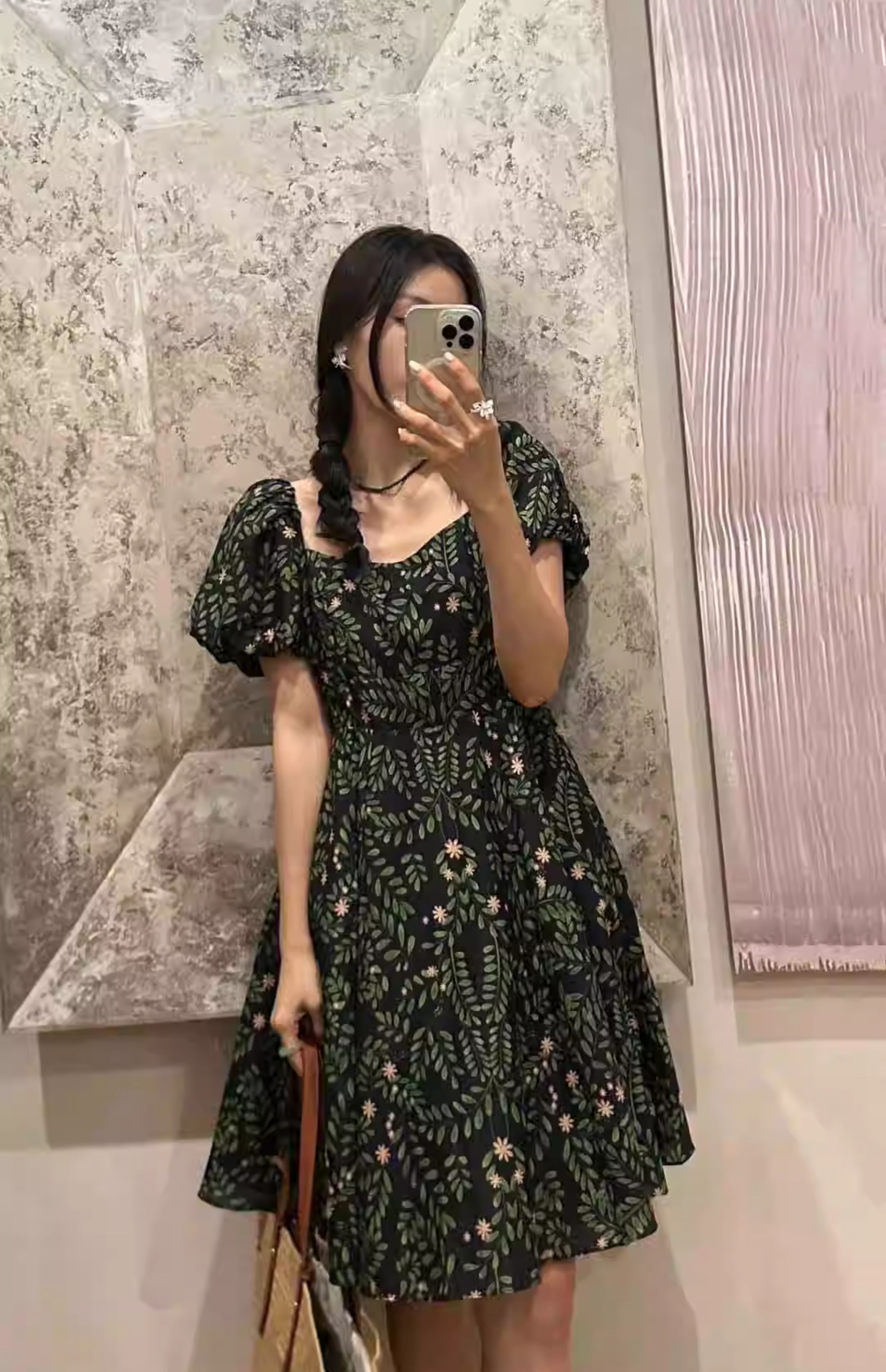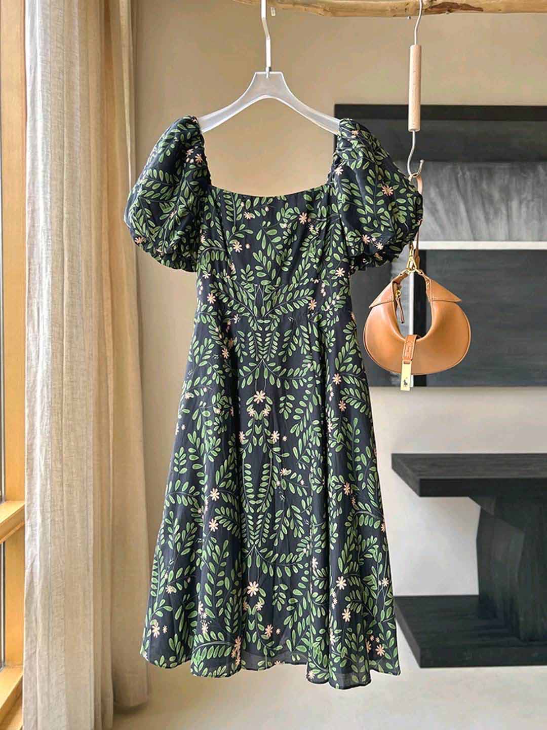 顺丰包邮洛诗琳15517蚕丝混纺碎花减龄泡泡袖显瘦方领连衣裙0768