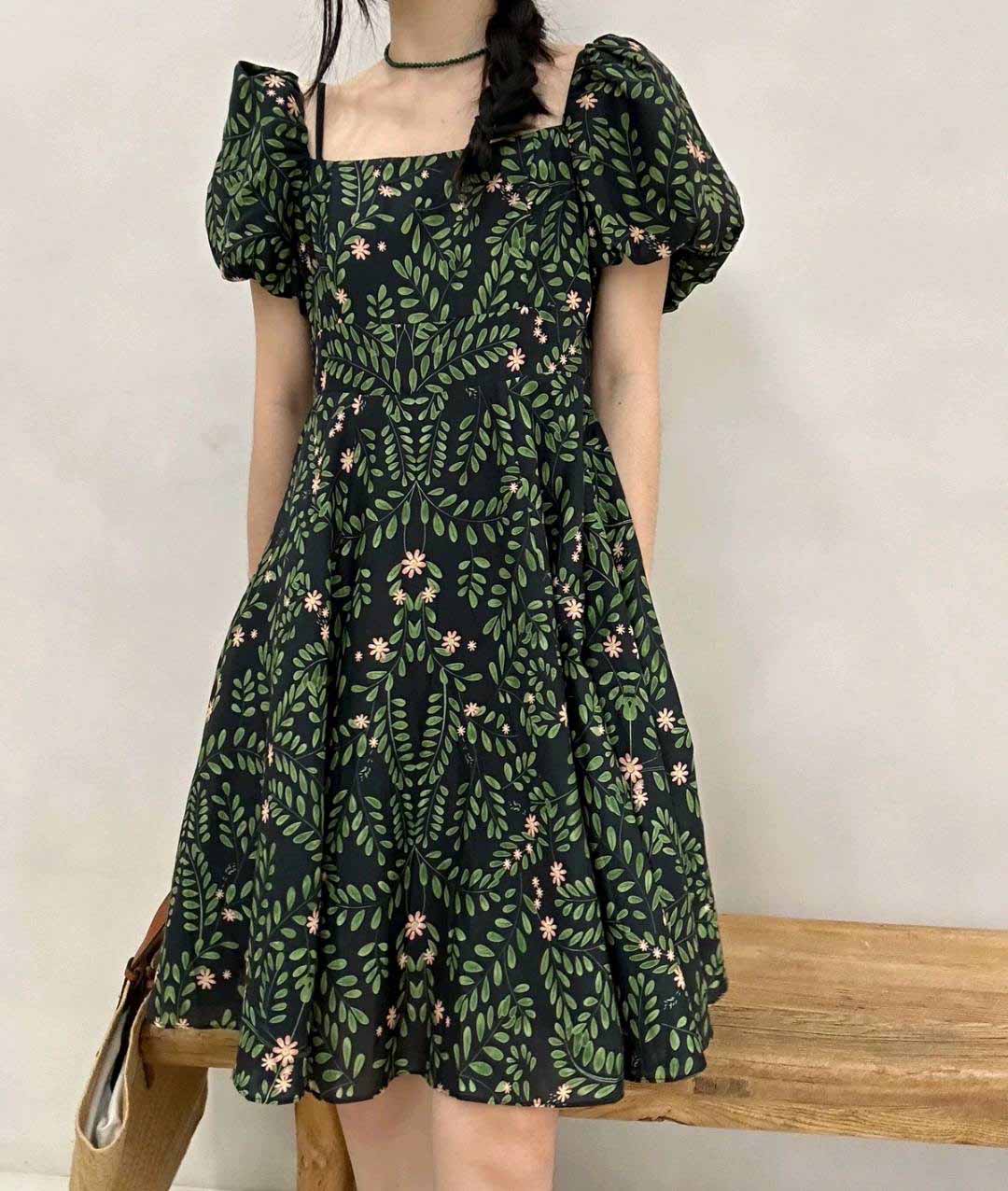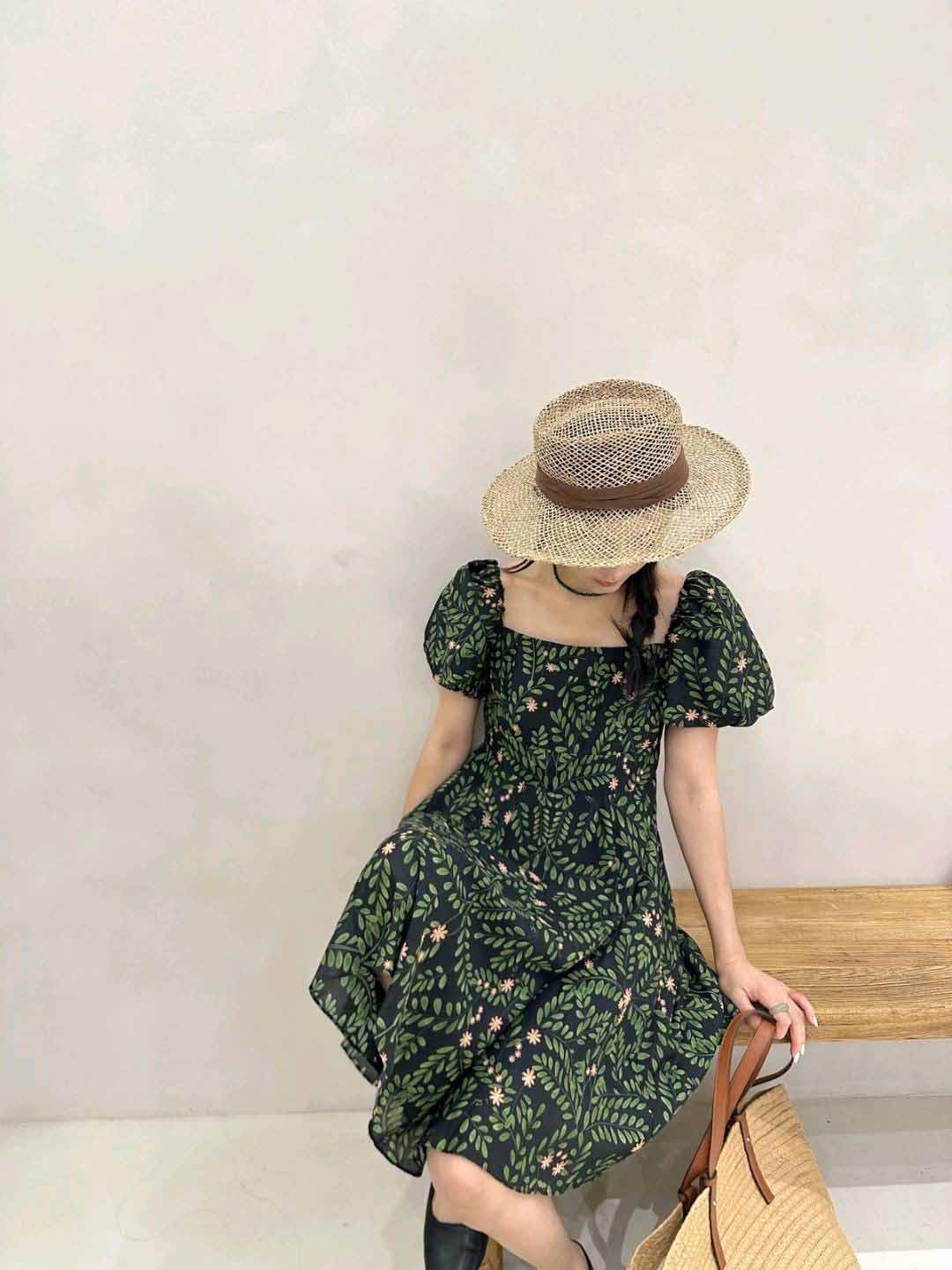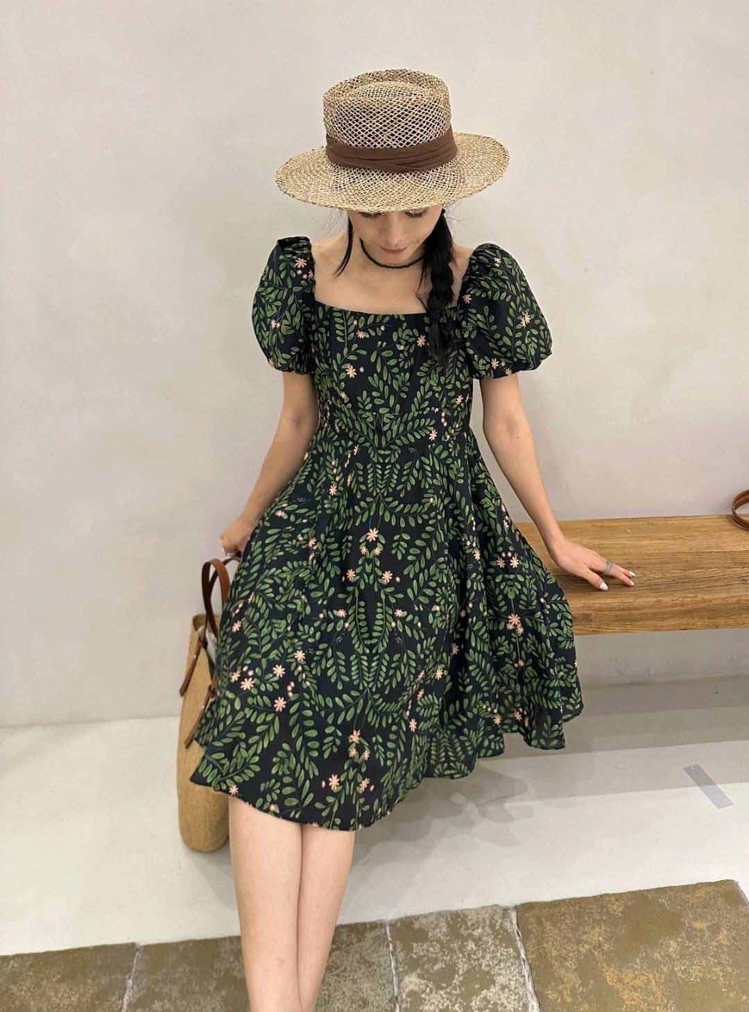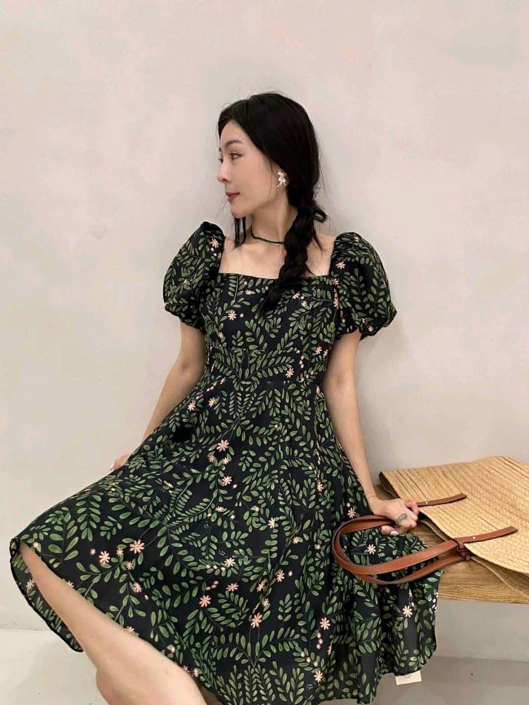 顺丰包邮洛诗琳15517蚕丝混纺碎花减龄泡泡袖显瘦方领连衣裙0768