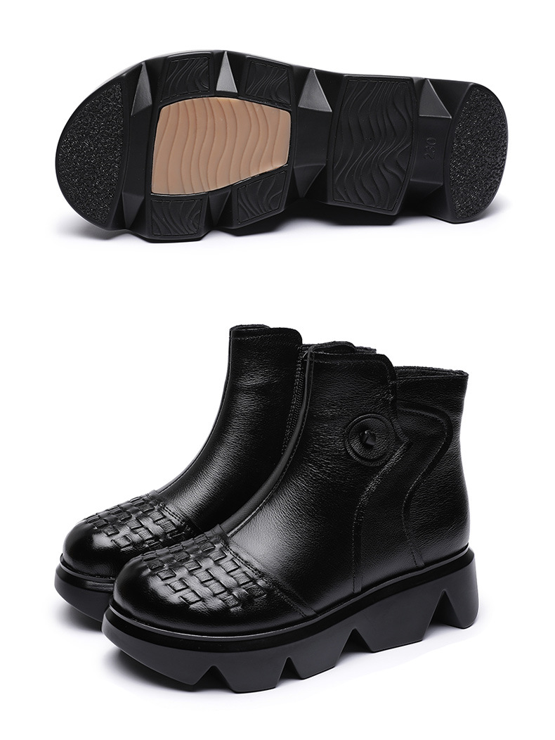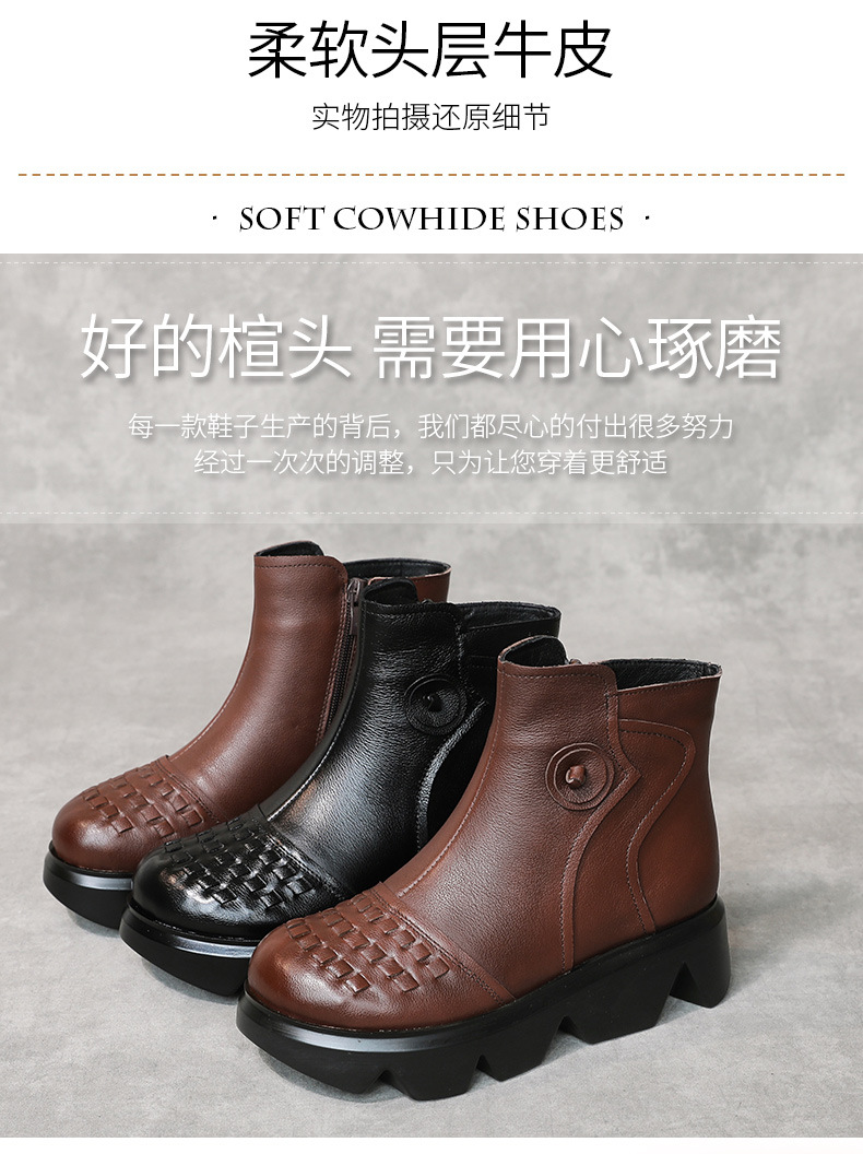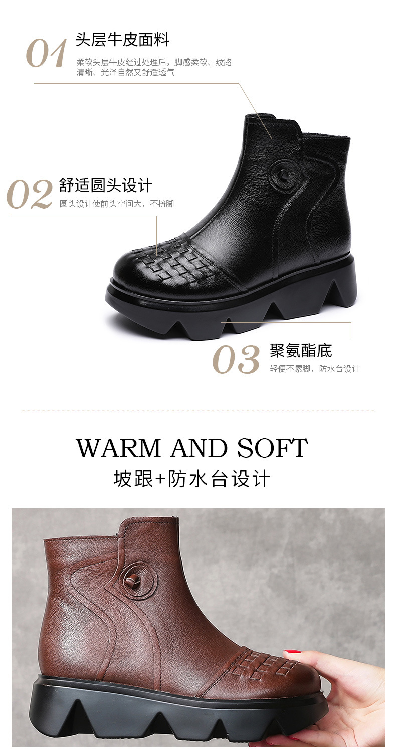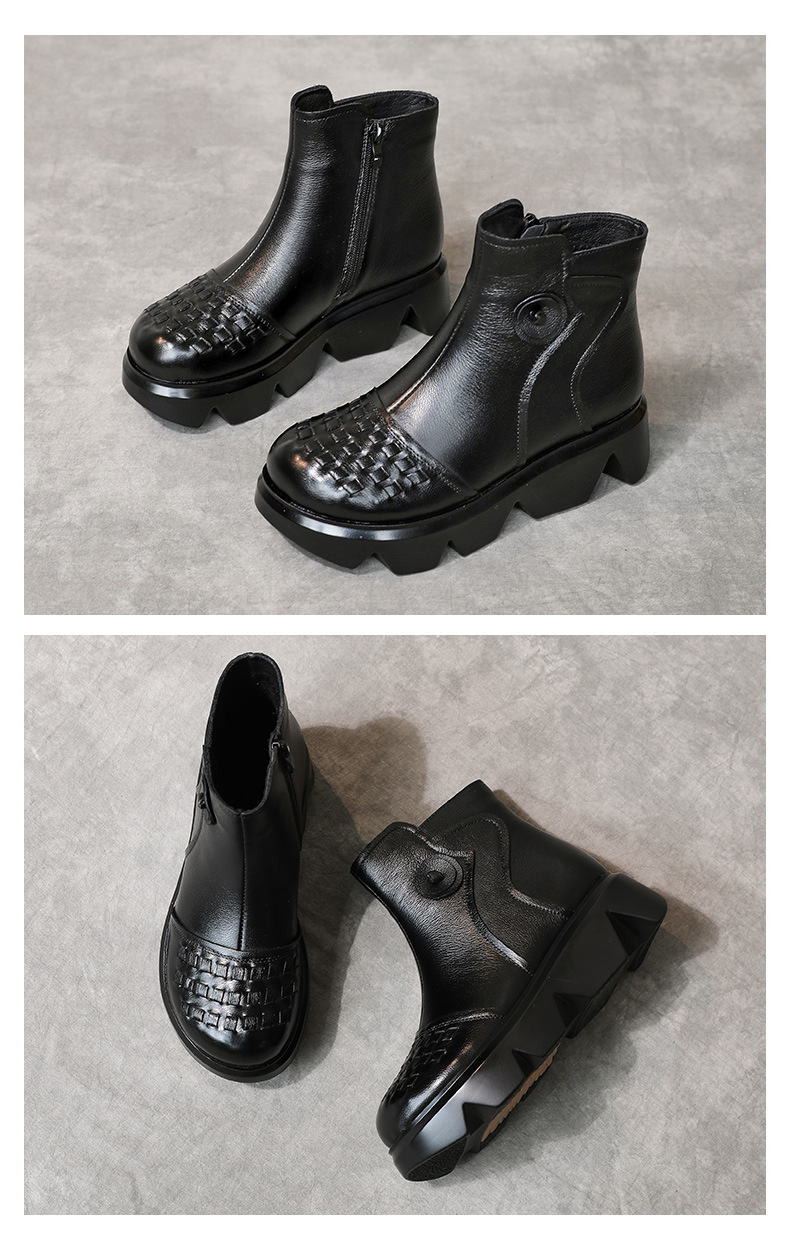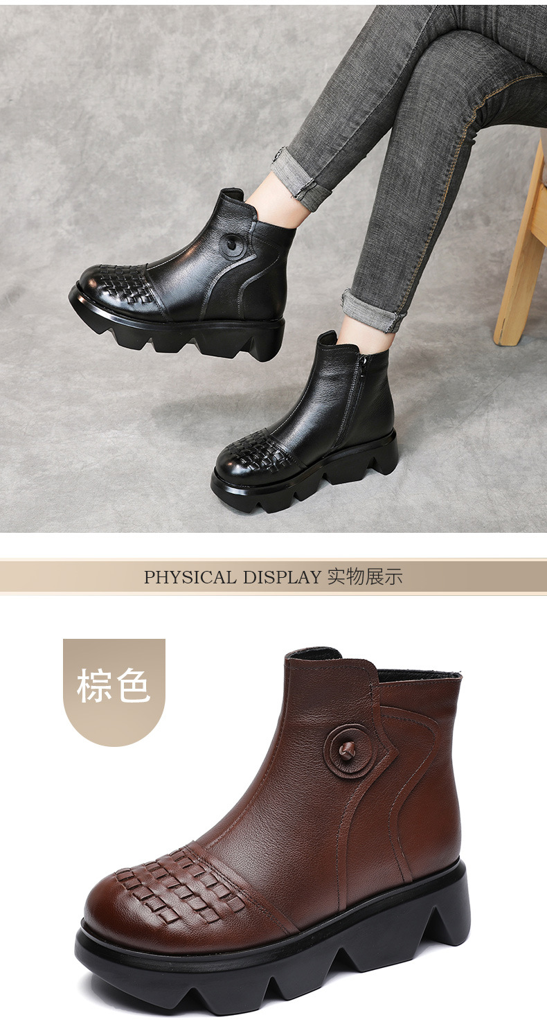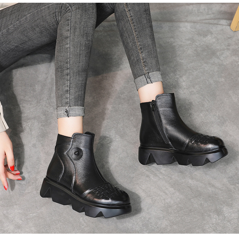 冬季头层牛皮女士加绒圆头松糕厚底保暖低筒编织复古马丁靴MLD-2581