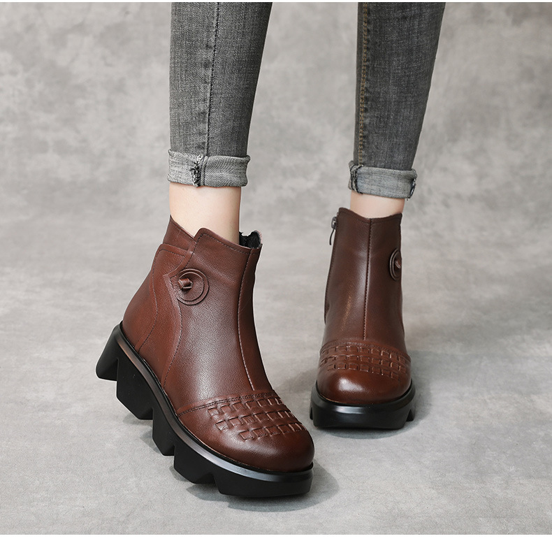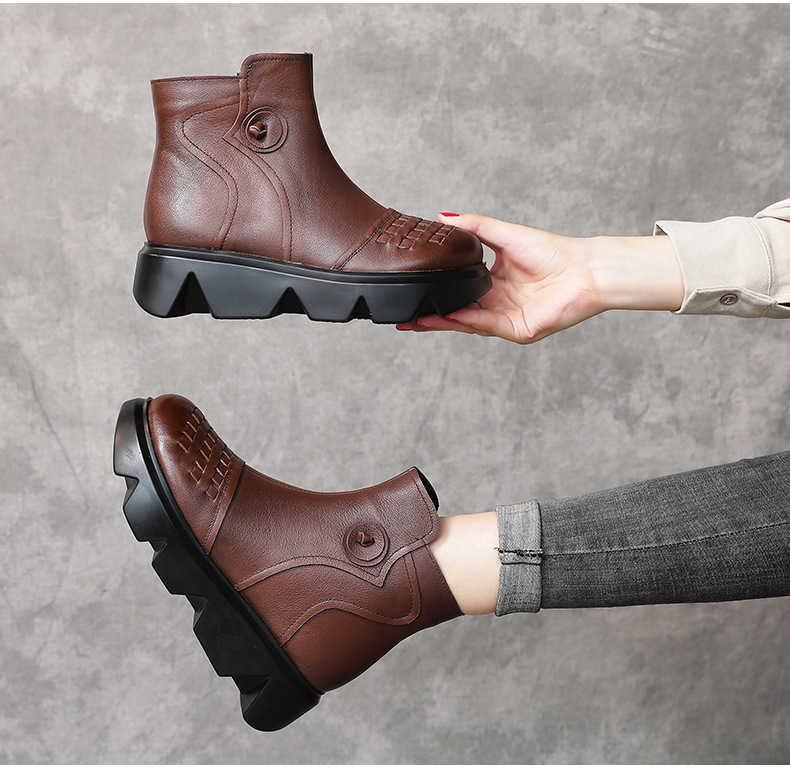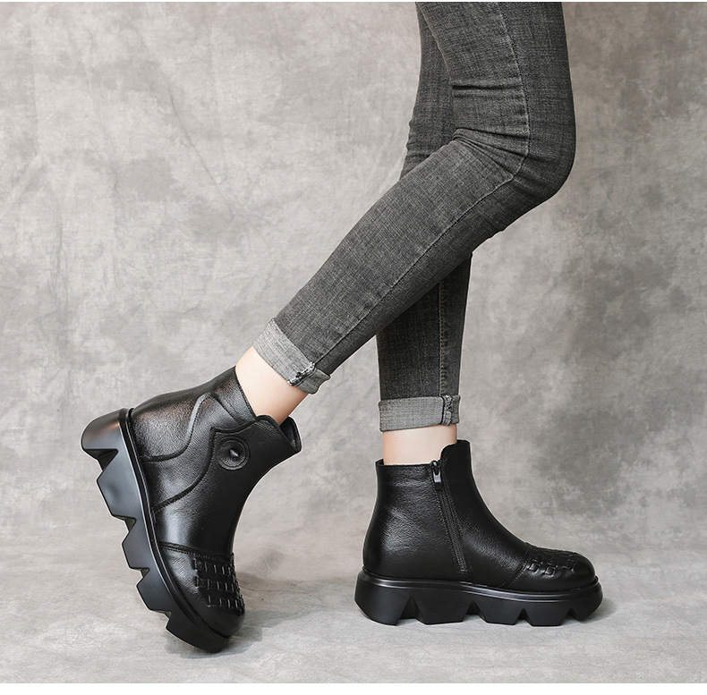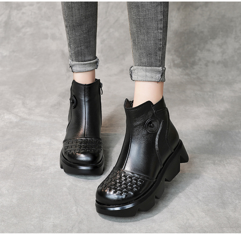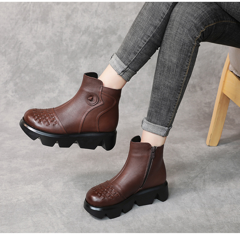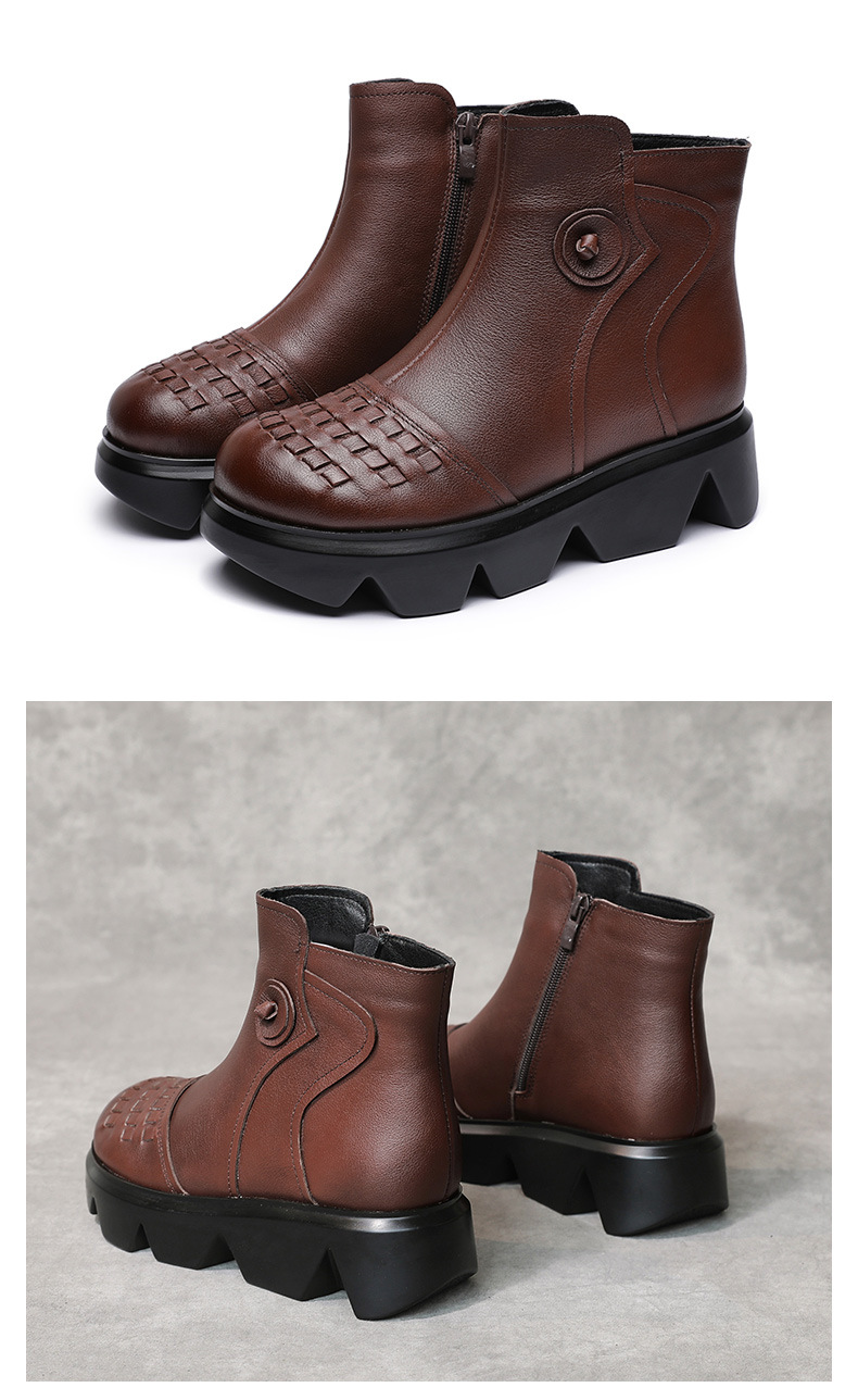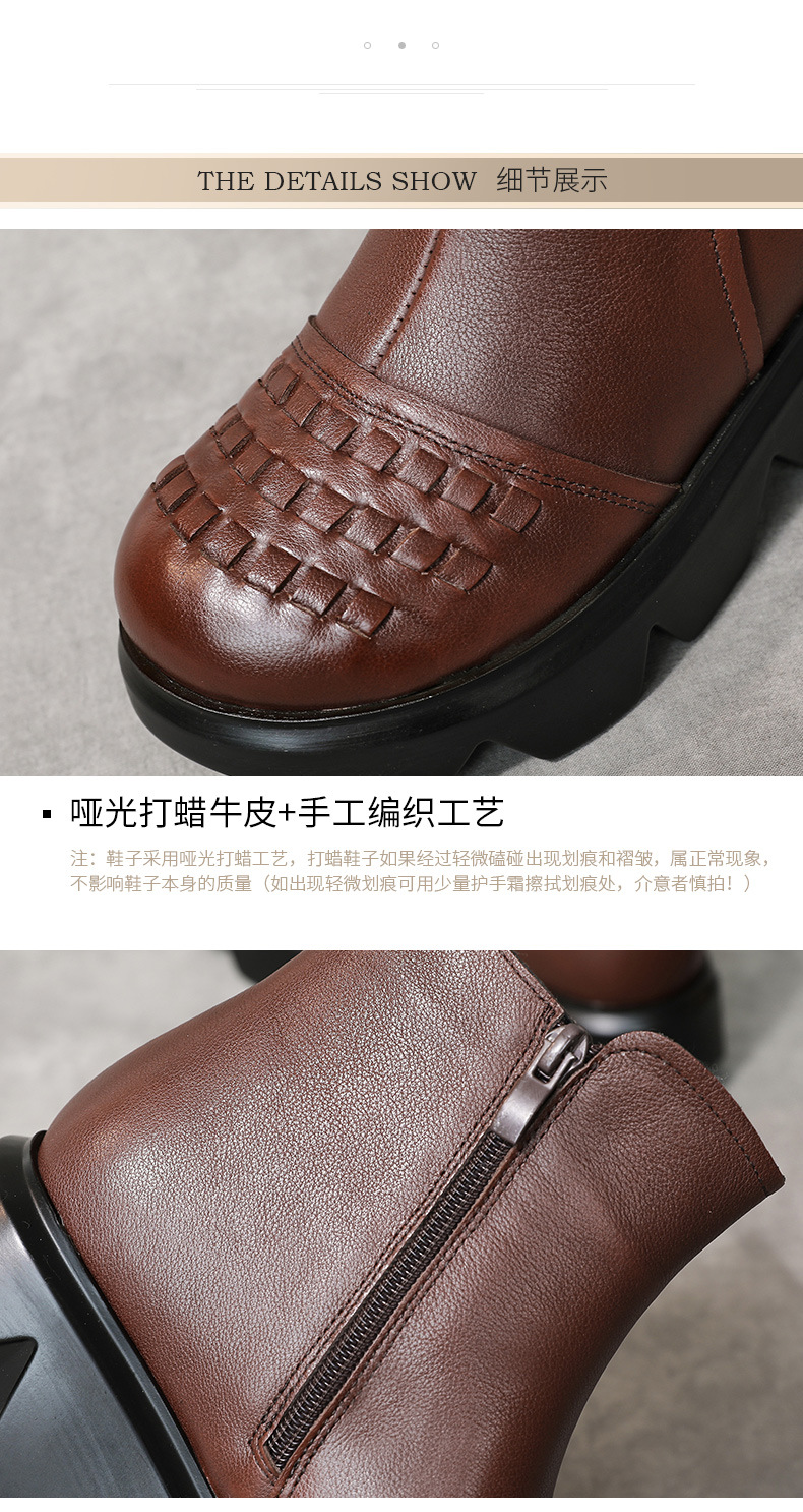 冬季头层牛皮女士加绒圆头松糕厚底保暖低筒编织复古马丁靴MLD-2581