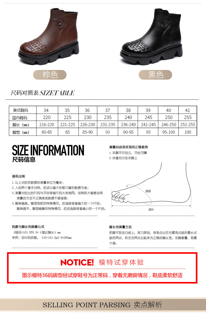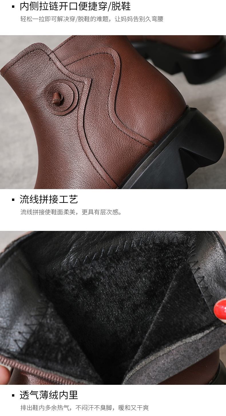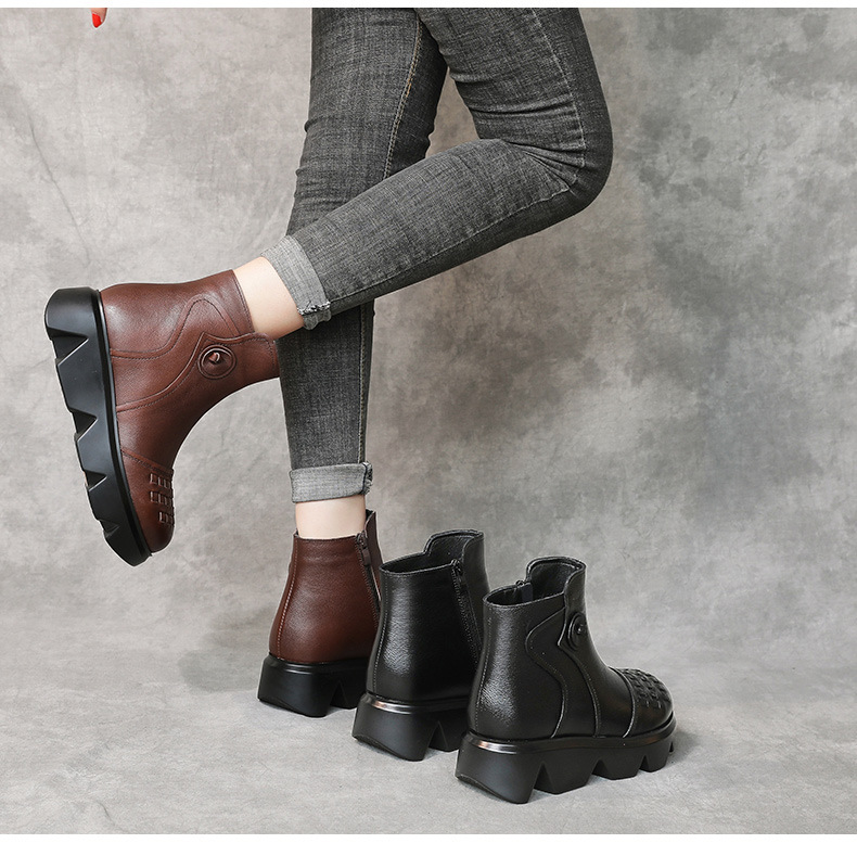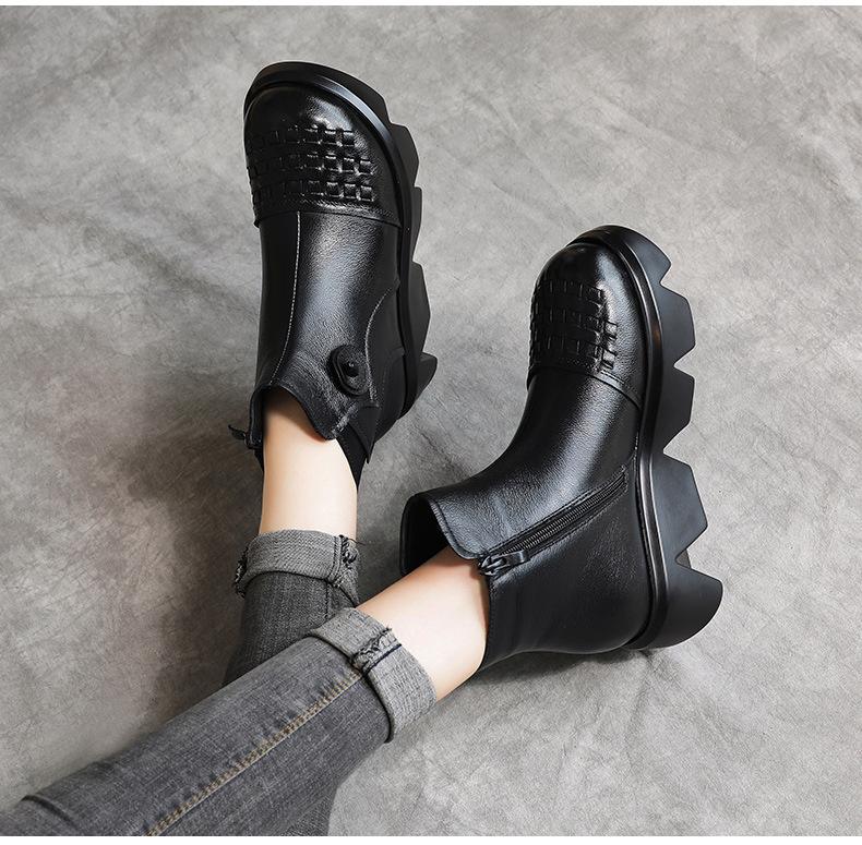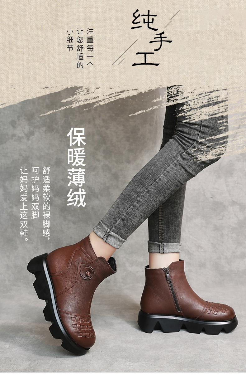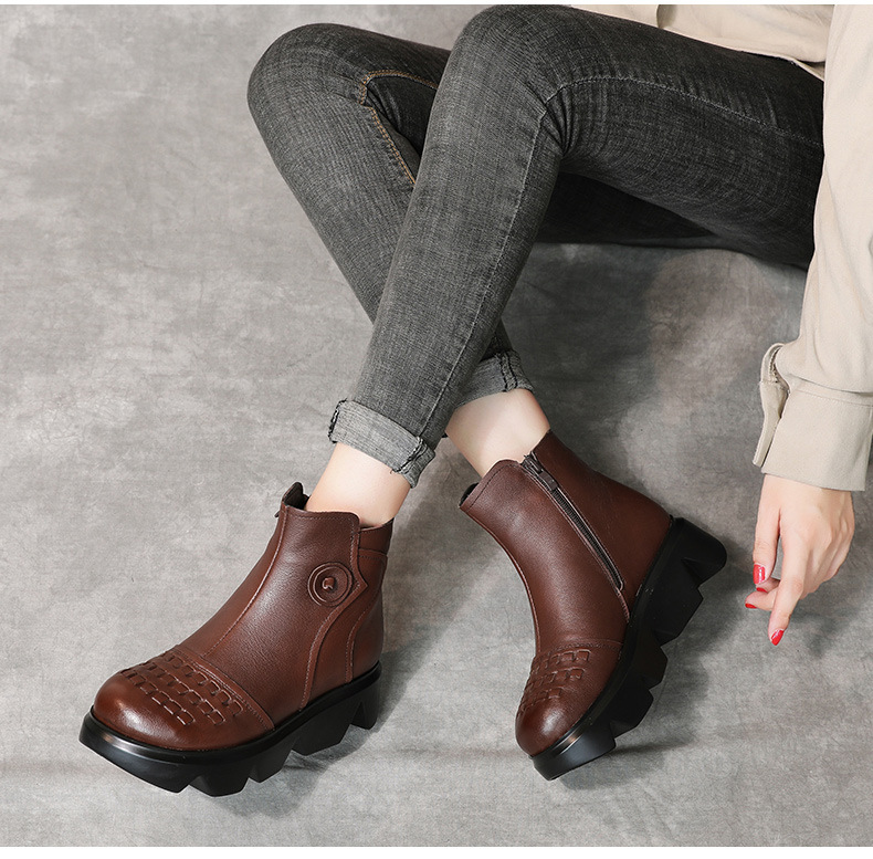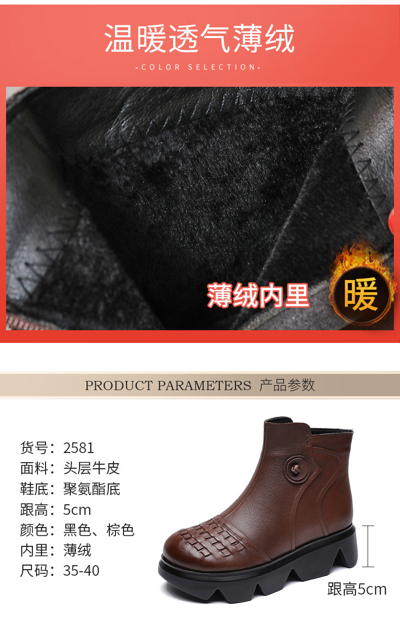 冬季头层牛皮女士加绒圆头松糕厚底保暖低筒编织复古马丁靴MLD-2581