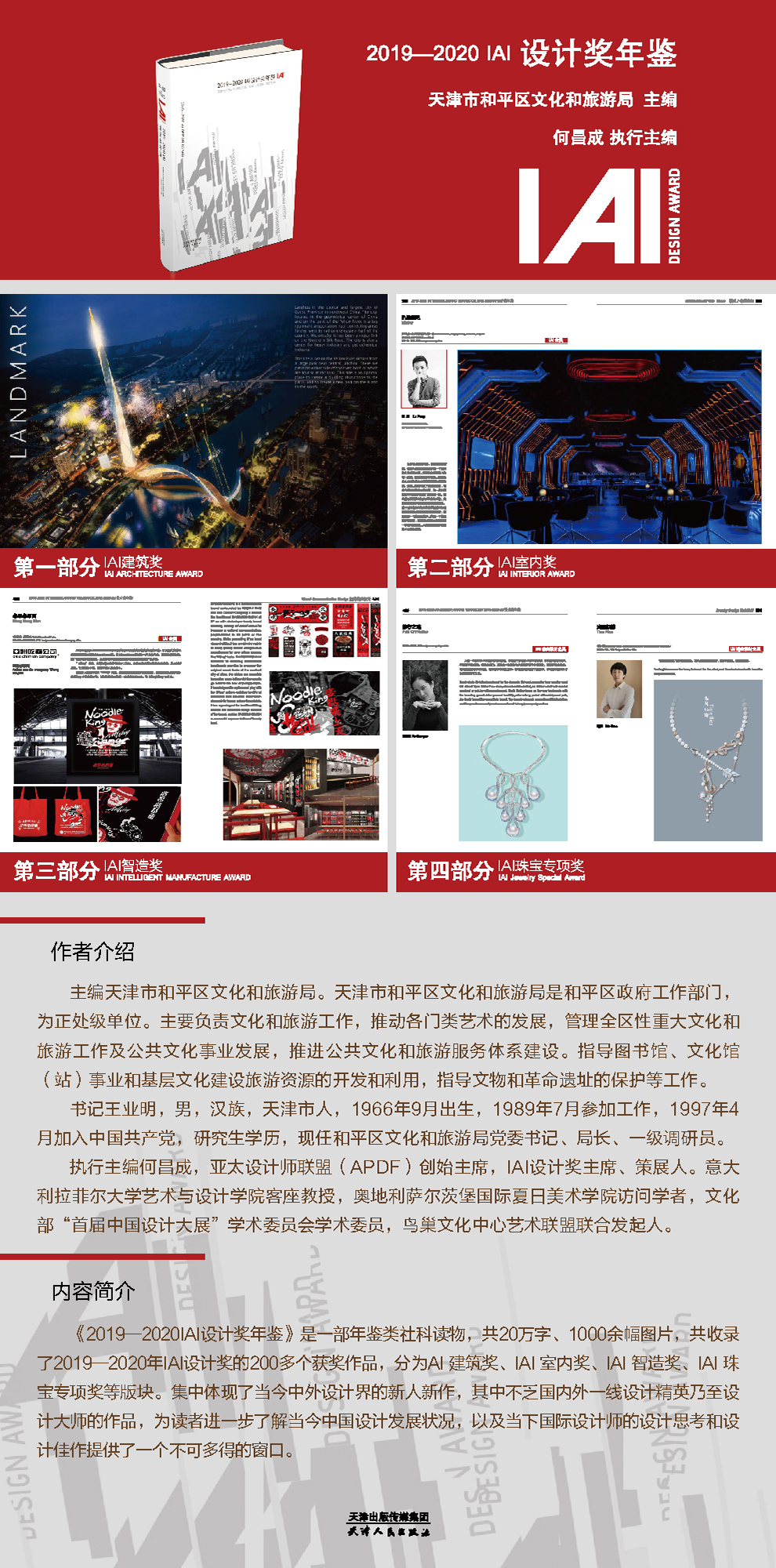 《2019—2020 IAI设计奖年鉴》是一部年鉴类社科读物,共20万字、1000余幅图片,共收录了2019—2020年IAI设计奖的200多个获奖作品,分为AI 建筑奖、IAI 室内奖、IAI 智造奖、IAI 珠宝专项奖等版块。集中体现了当今中外设计界的新人新作,其中不乏国内外一线设计精英乃至设计大师的作品,为读者进一步了解当今中国设计发展状况,以及当下国际设计师的设计思考和设计佳作提供了一个不可多得的窗口。