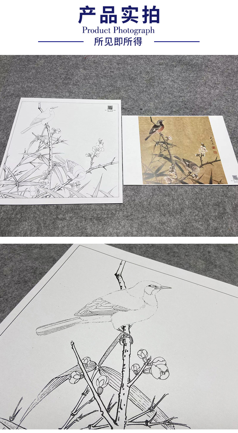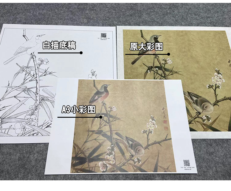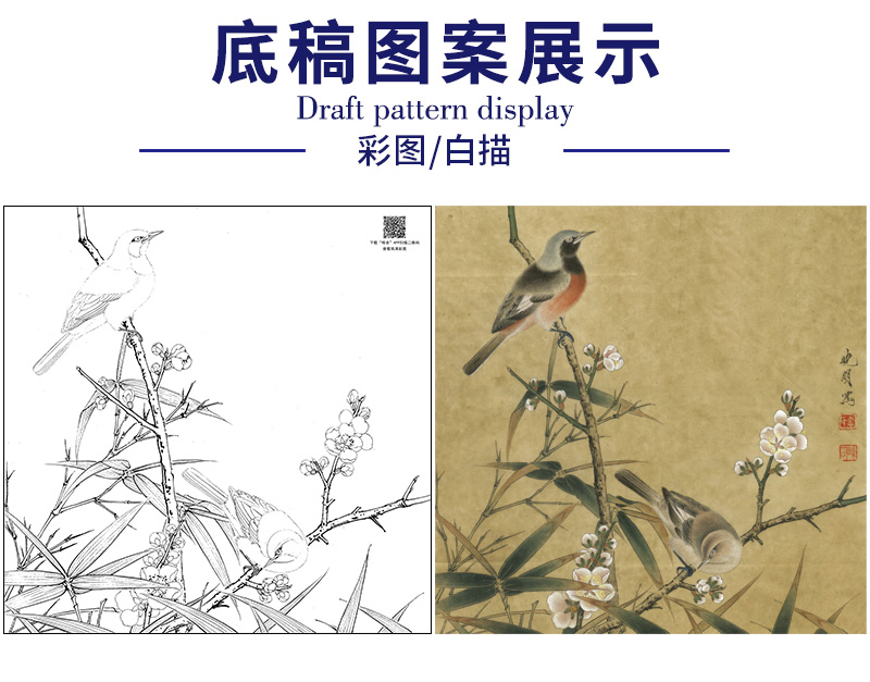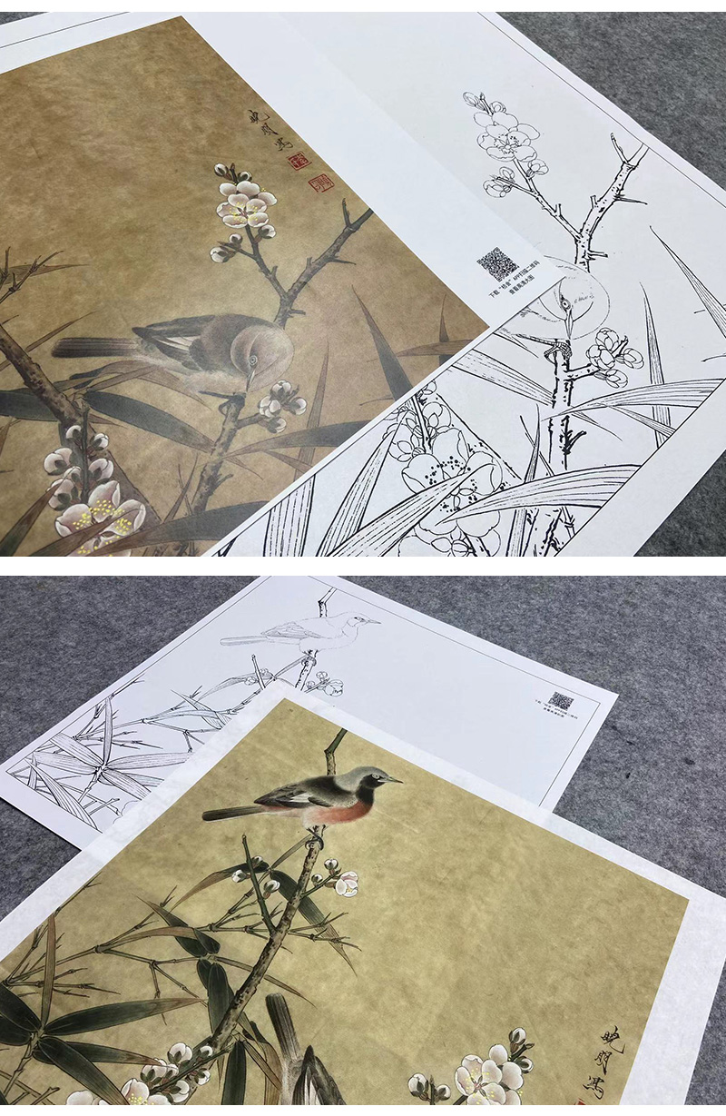 【大彩图】李晓明工笔画白描底稿小品《梅竹双雀图》临摹勾线花鸟线稿K063