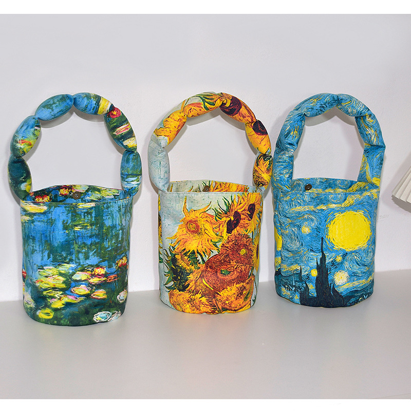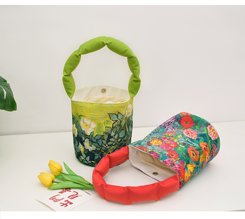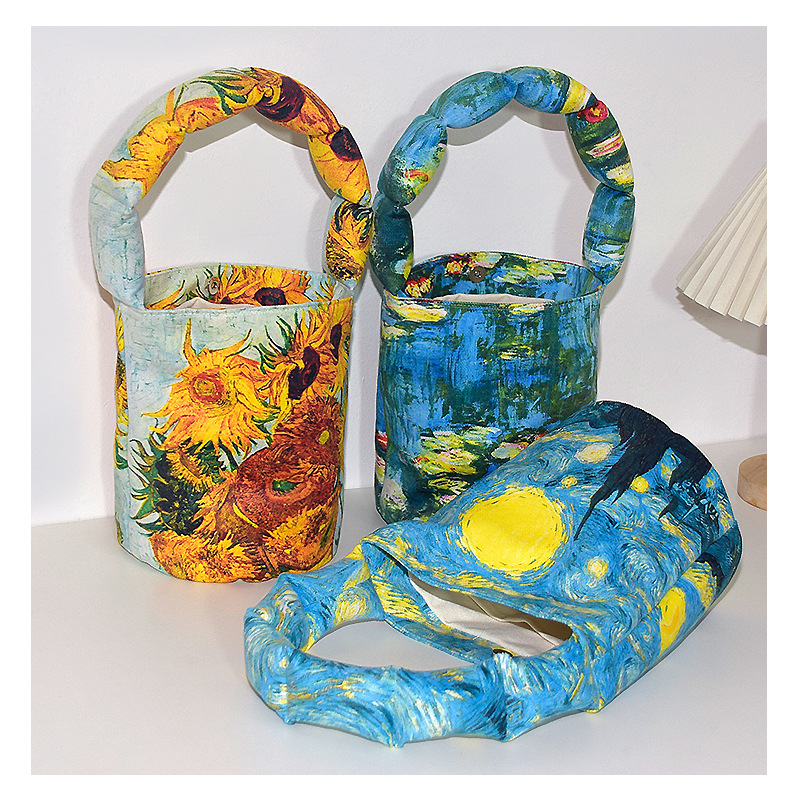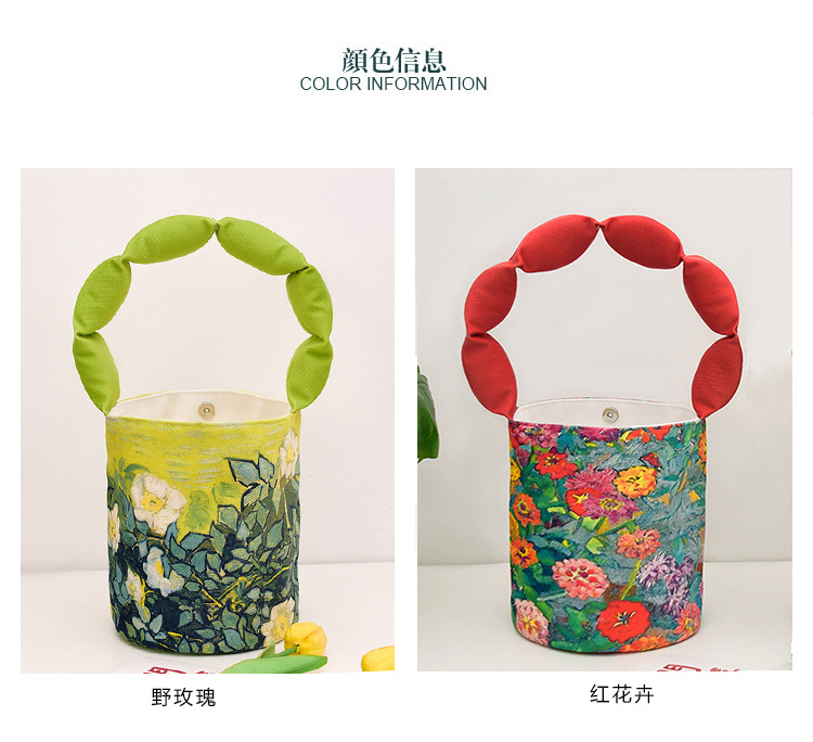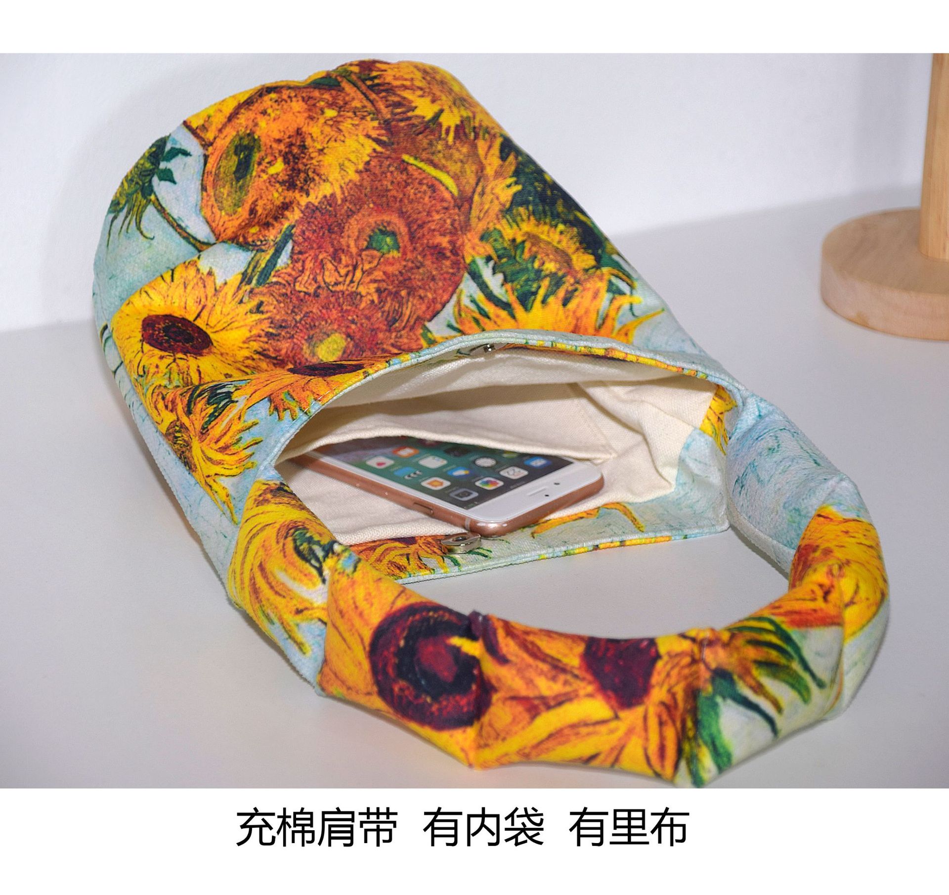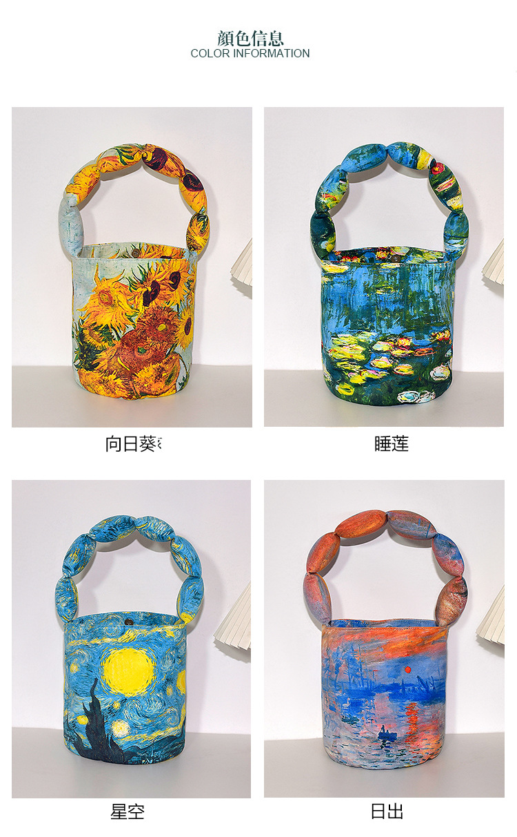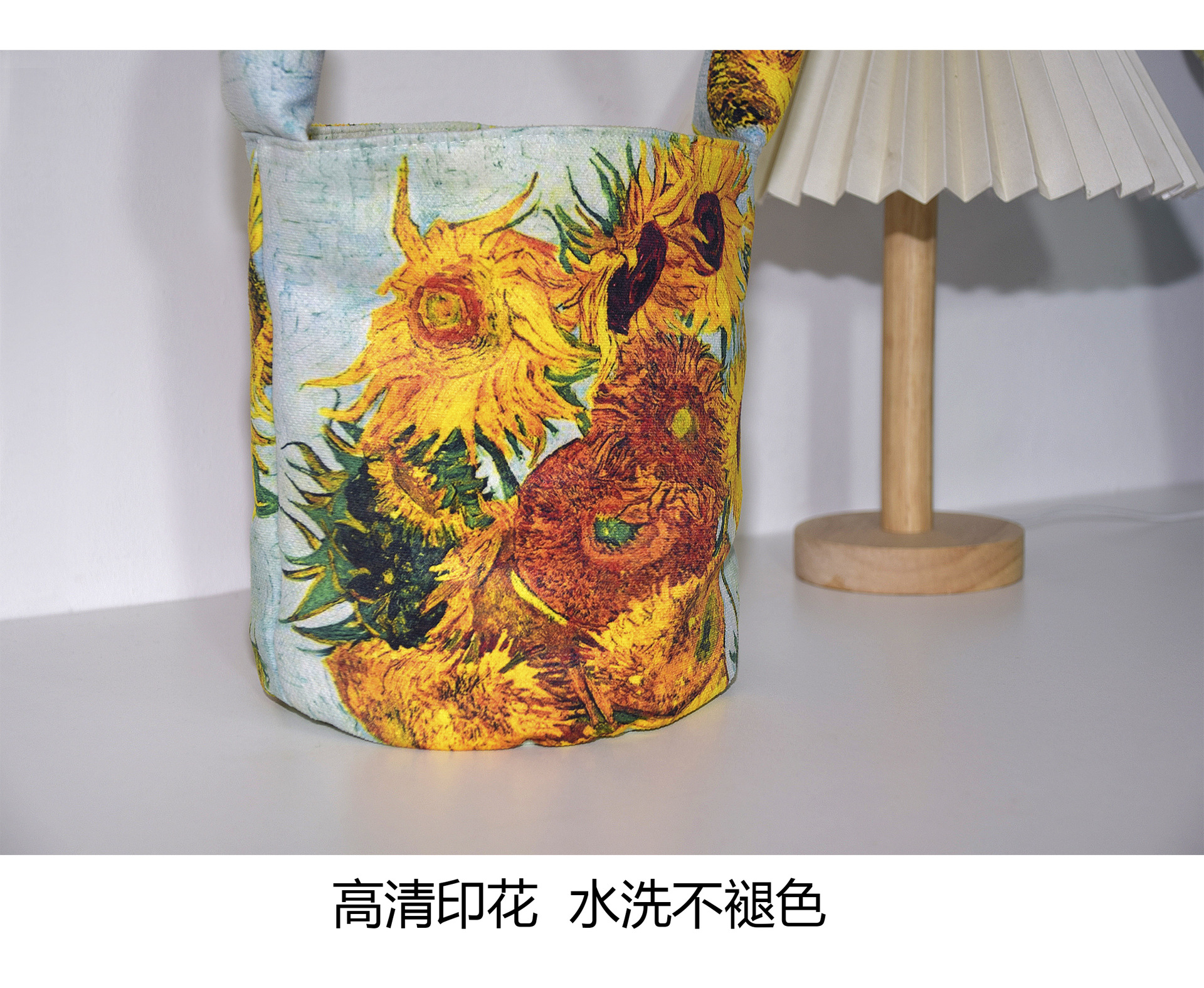 梵高莫奈油画复古野玫瑰向日葵充棉肩带水桶包 小号女便当袋饭盒手提包