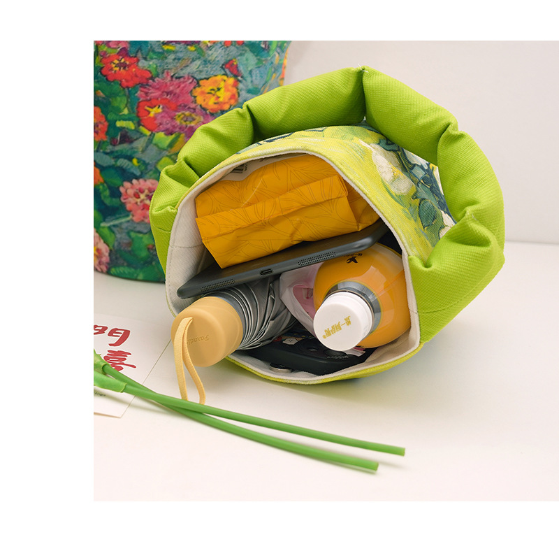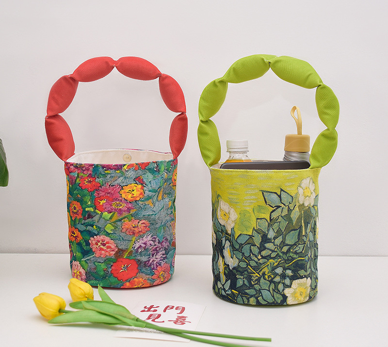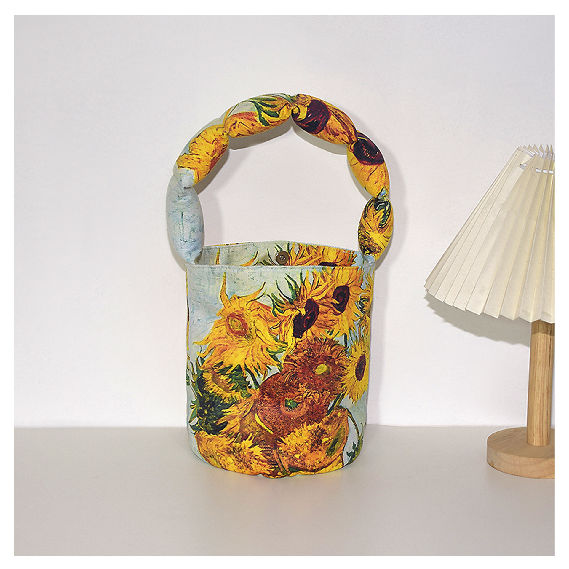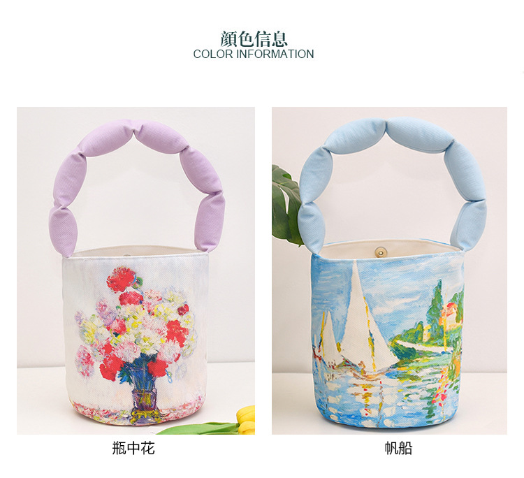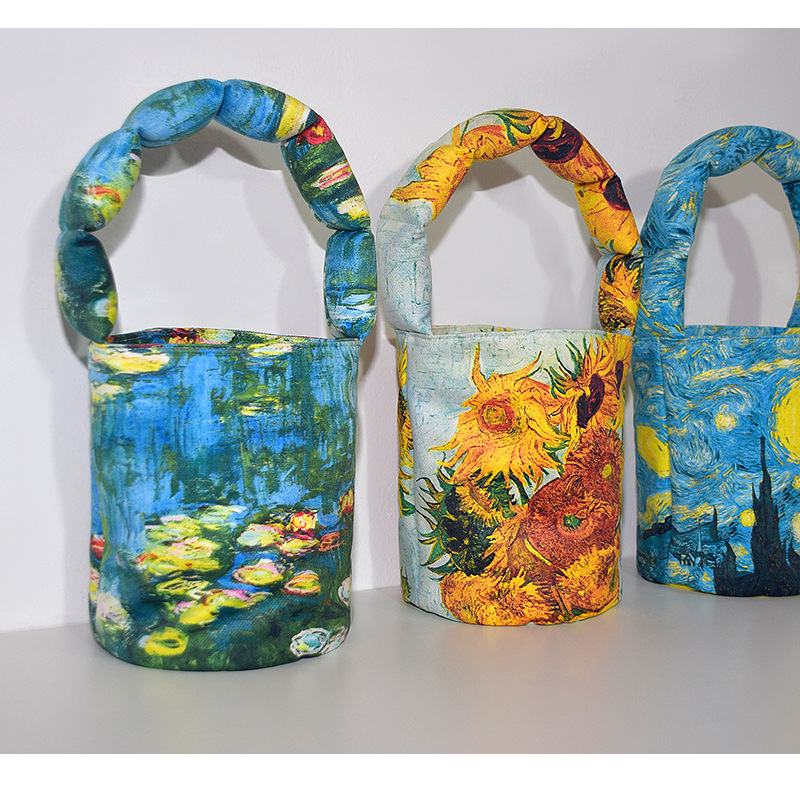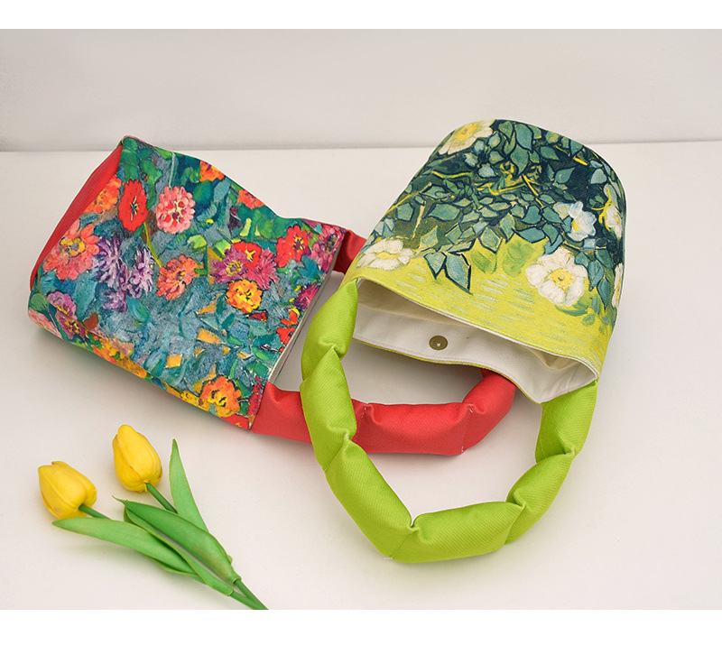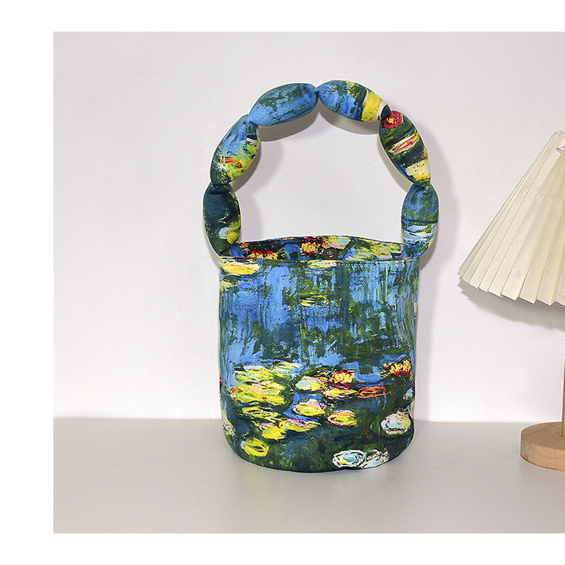 梵高莫奈油画复古野玫瑰向日葵充棉肩带水桶包 小号女便当袋饭盒手提包