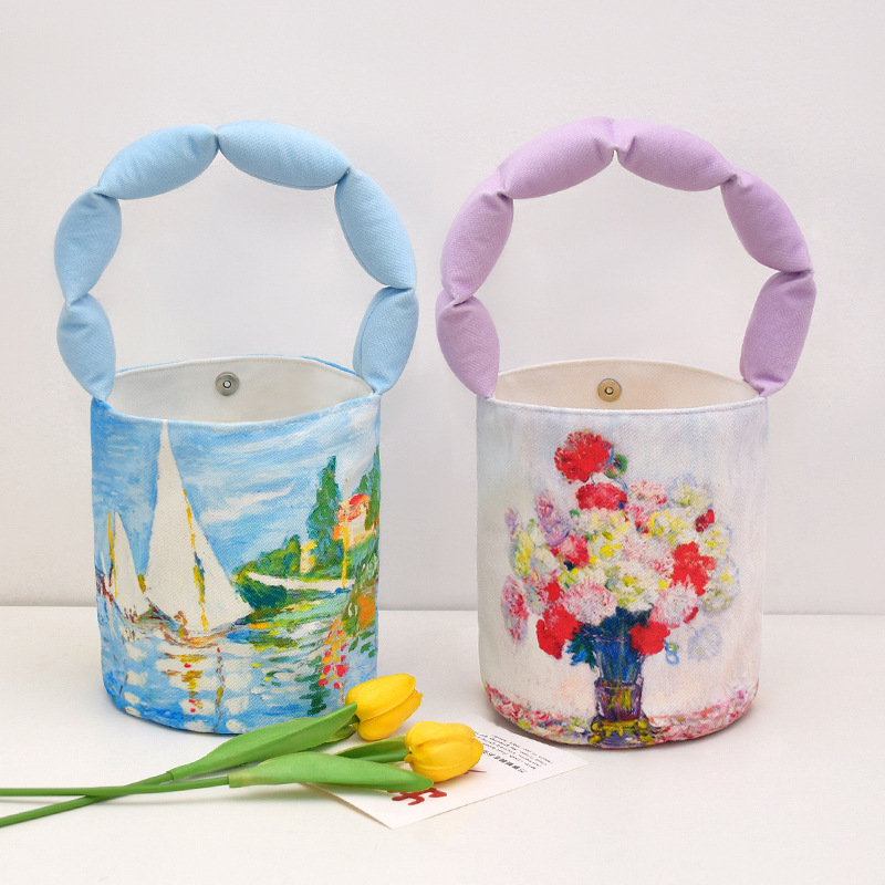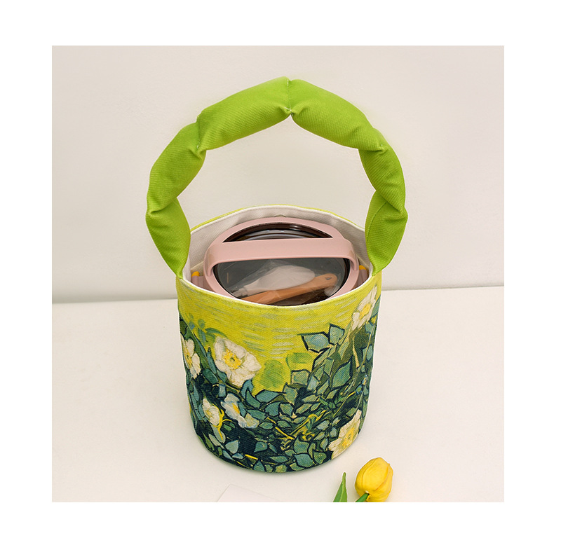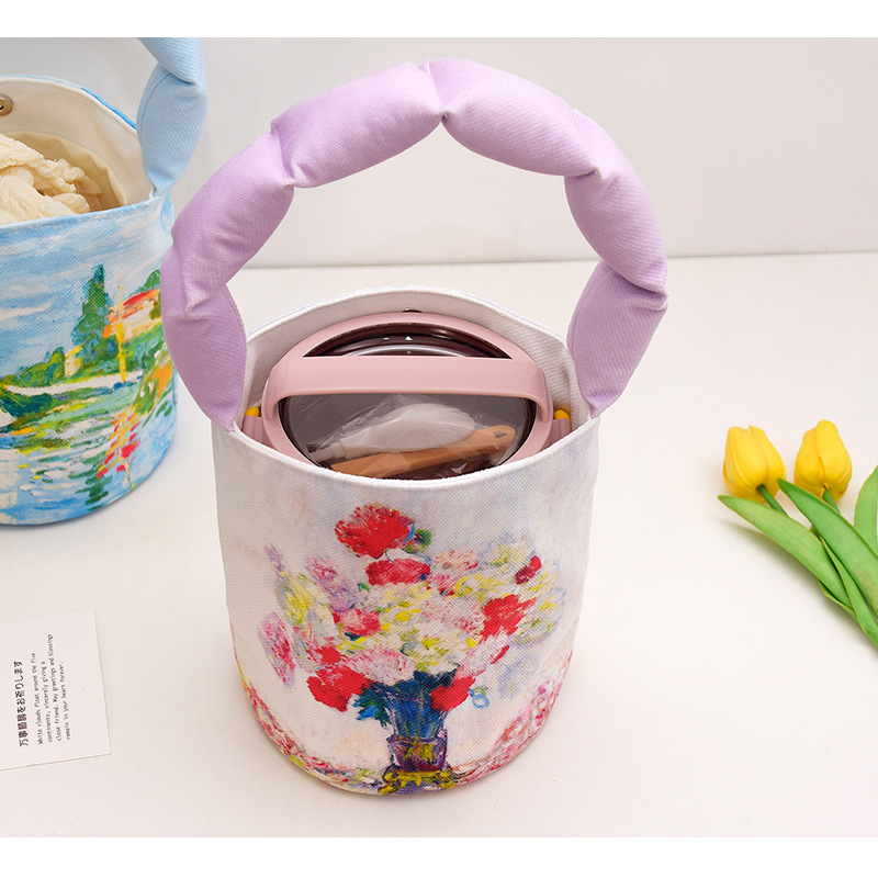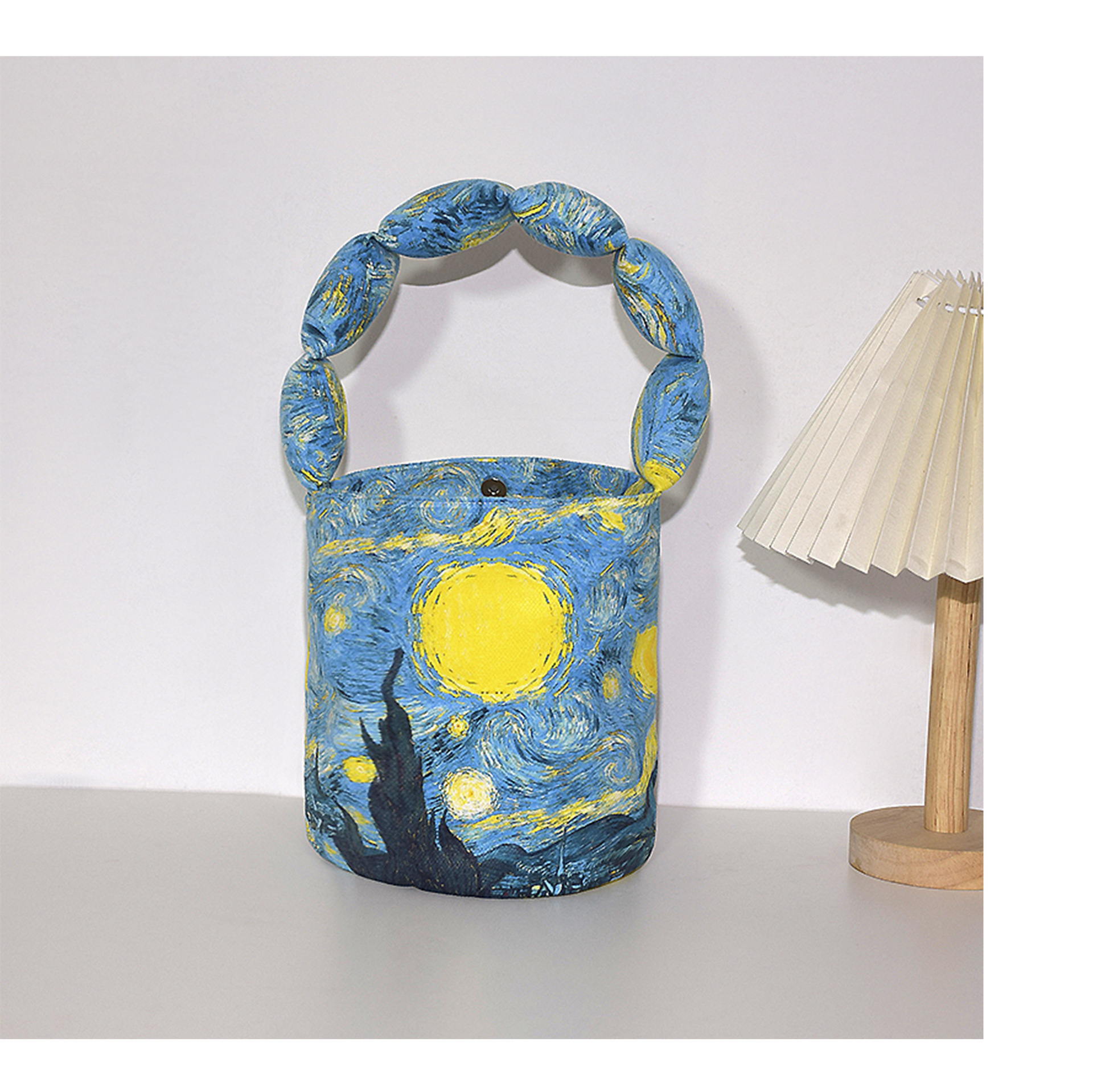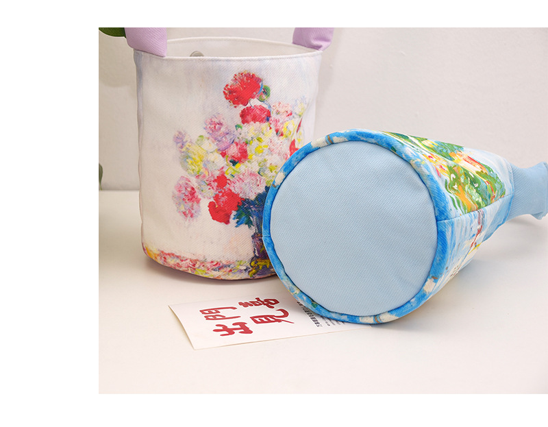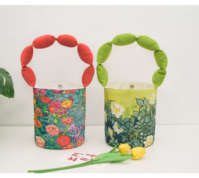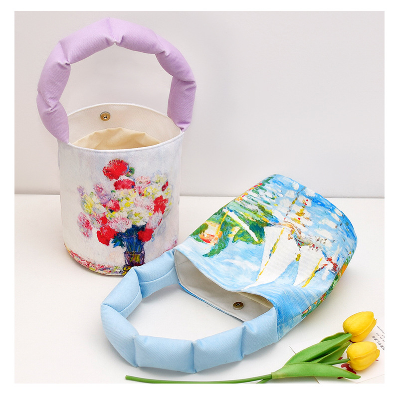 梵高莫奈油画复古野玫瑰向日葵充棉肩带水桶包 小号女便当袋饭盒手提包