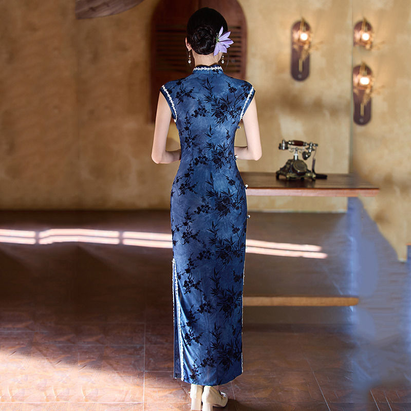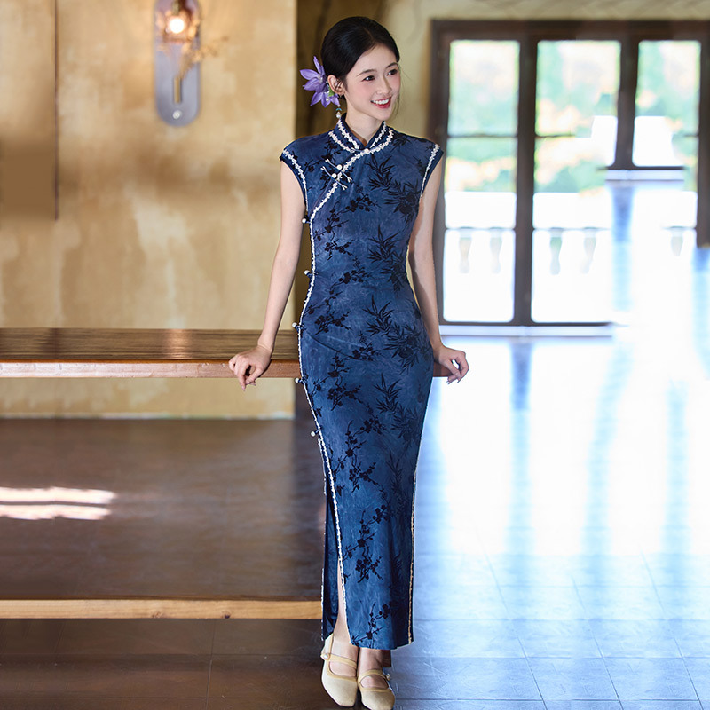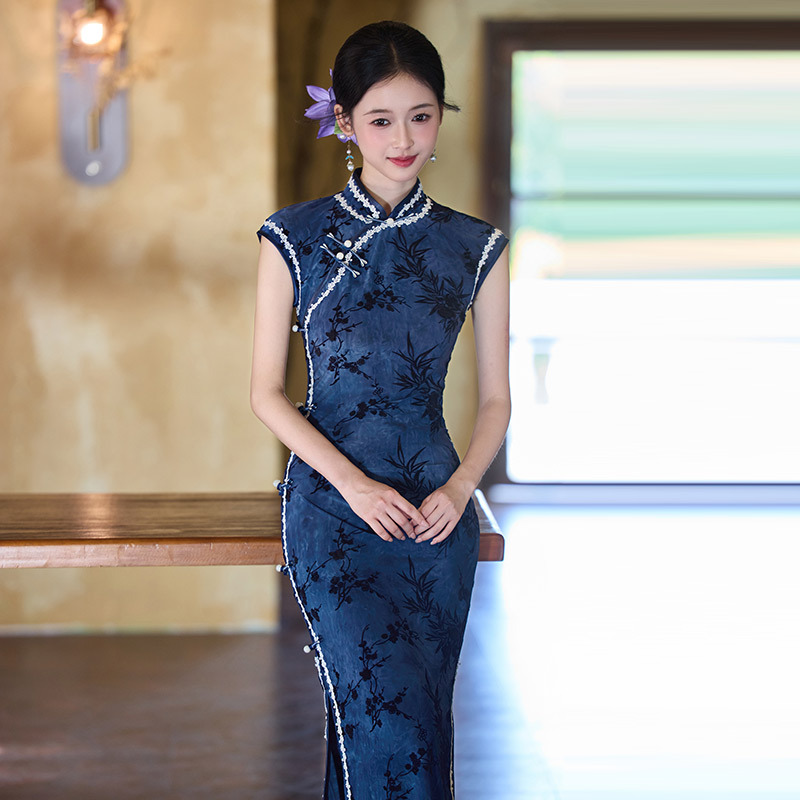 SC21751蓝色无袖国风中式长款旗袍改良年轻款2025新款女复古修身弹力收腰