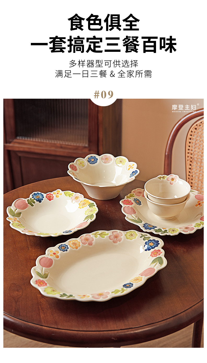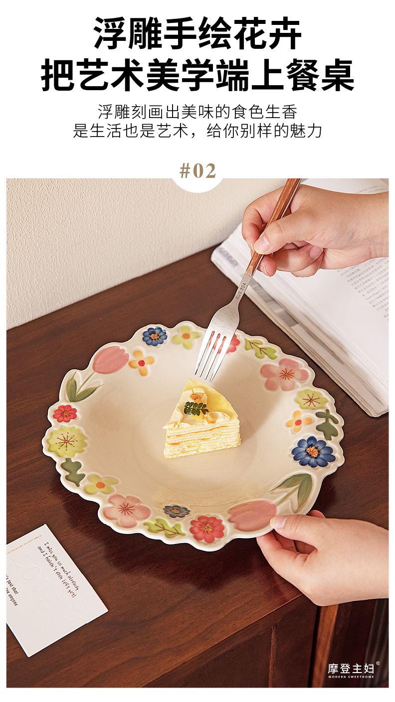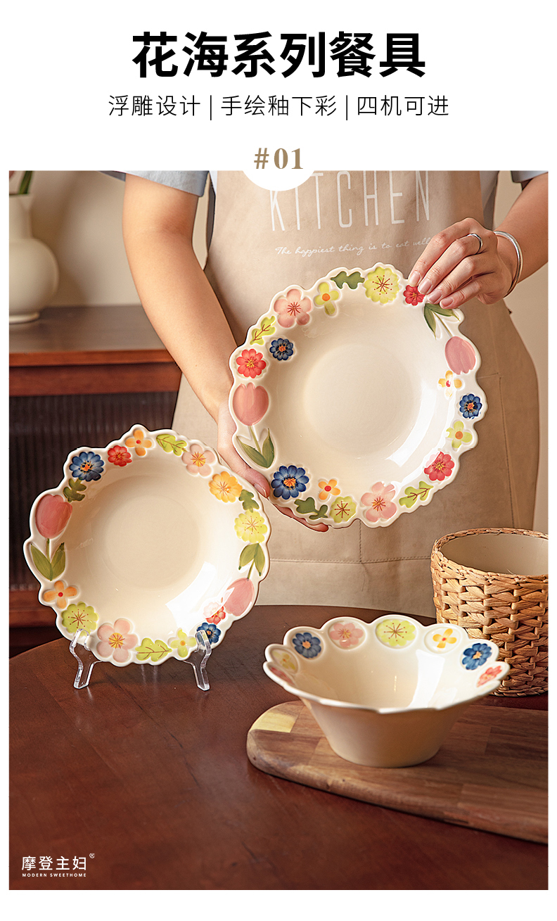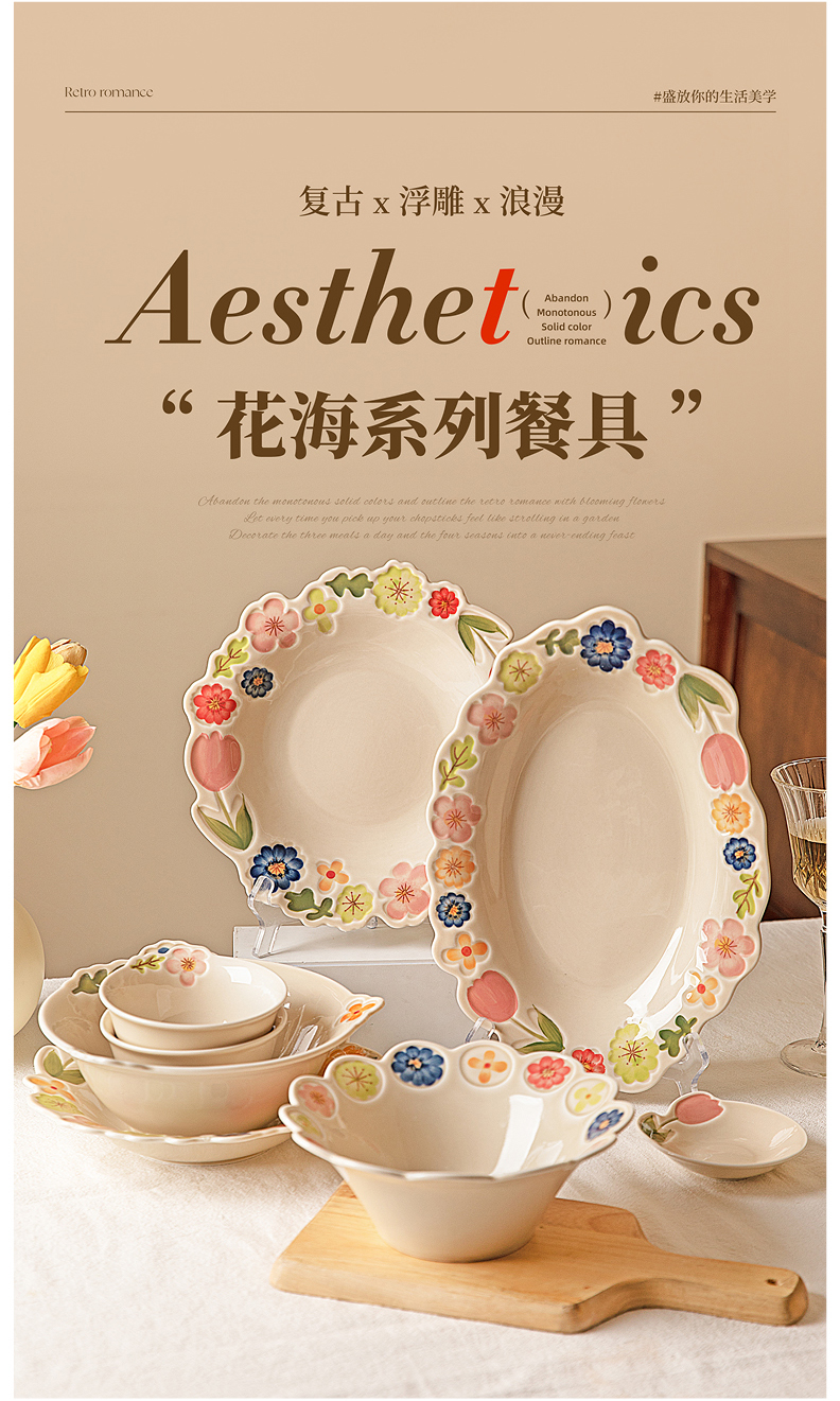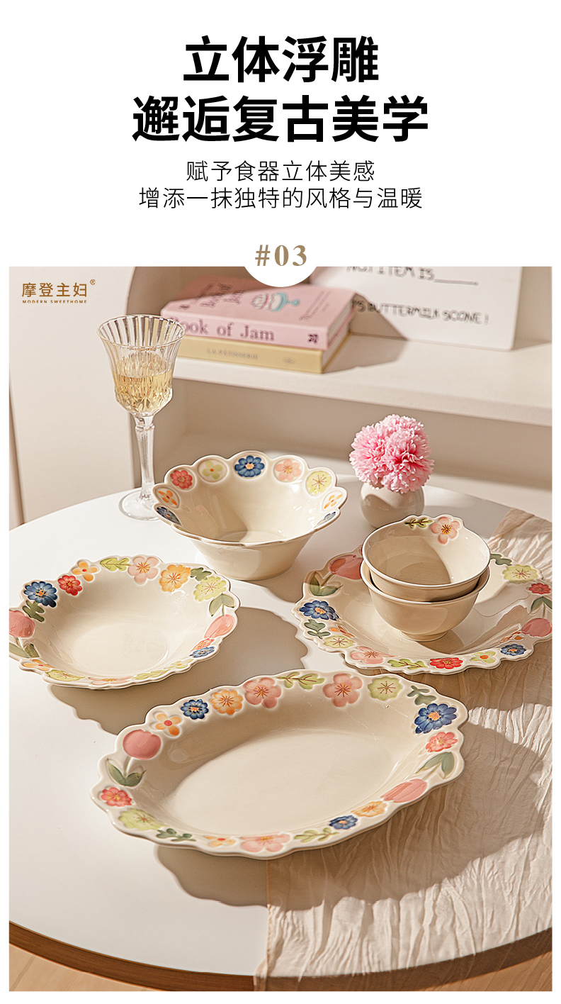 摩登主妇漂亮餐具盘子家用碗具高颜值饭碗草帽盘浮雕花卉餐盘汤碗
