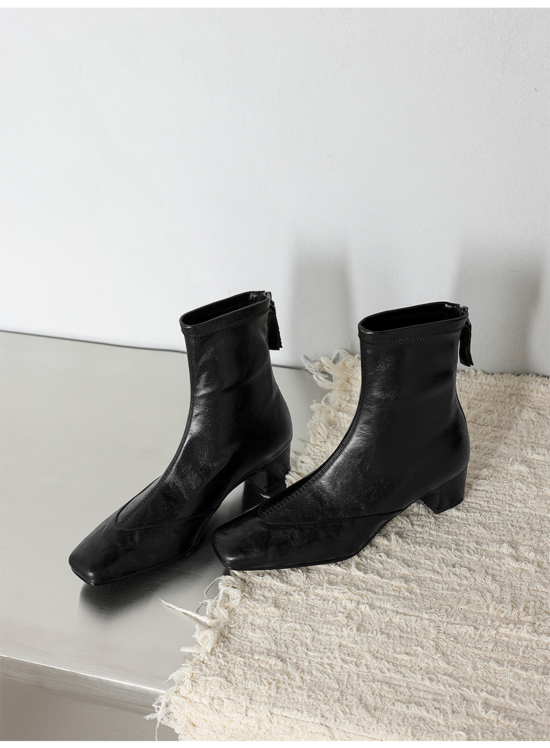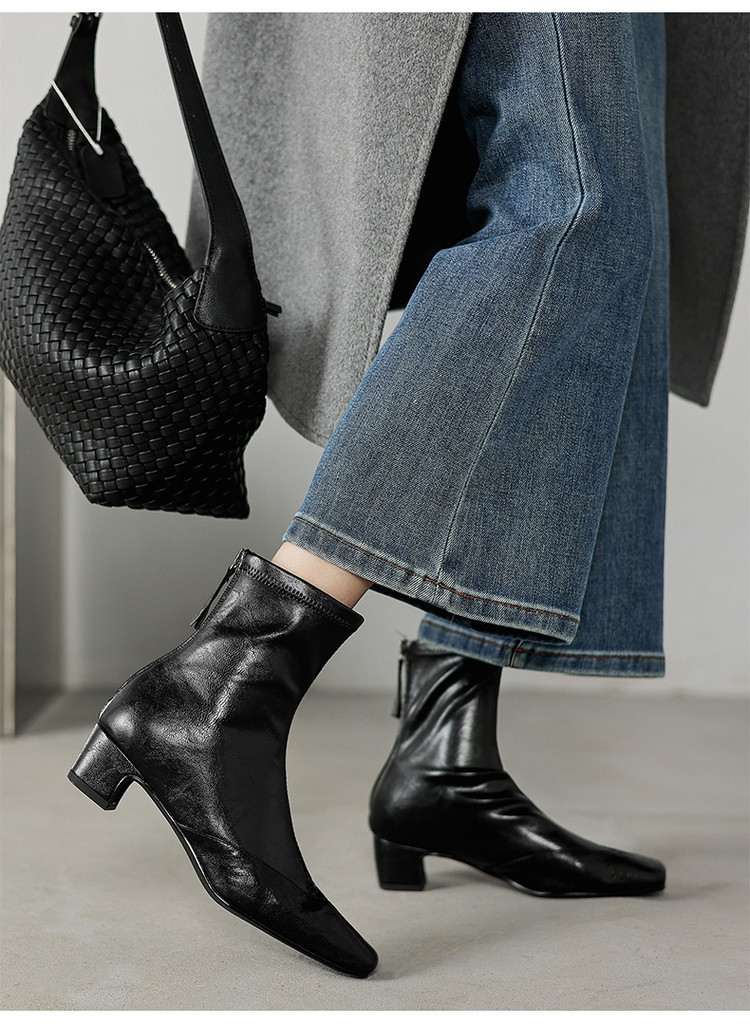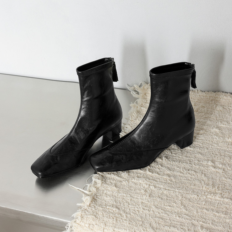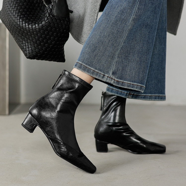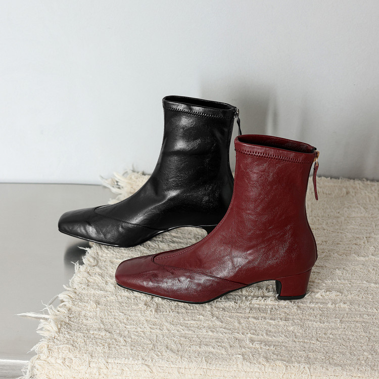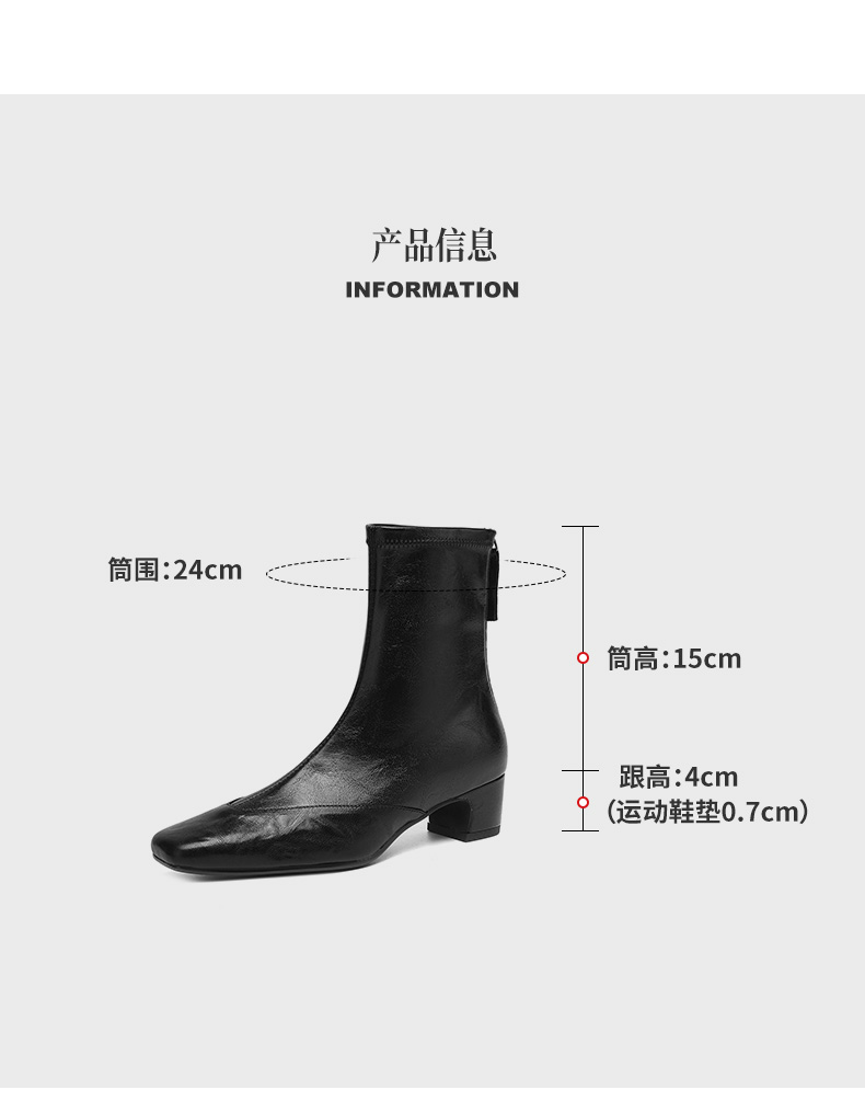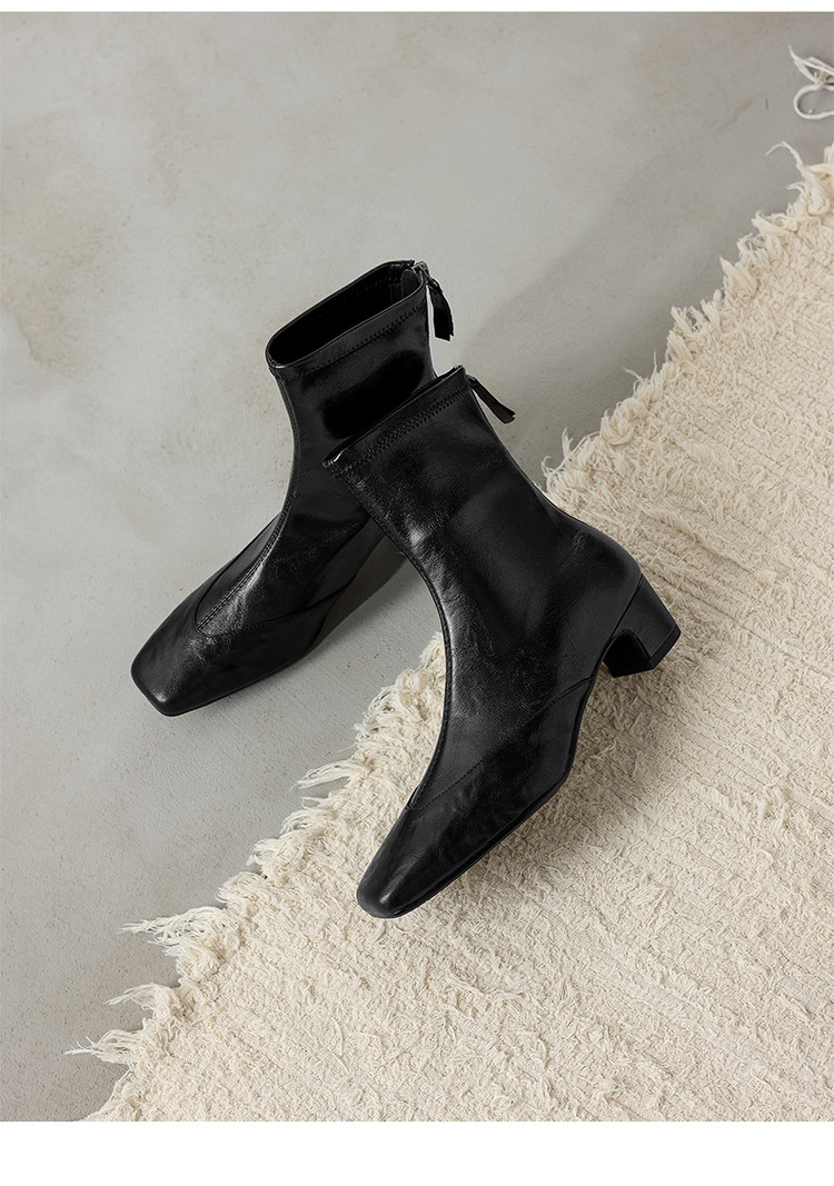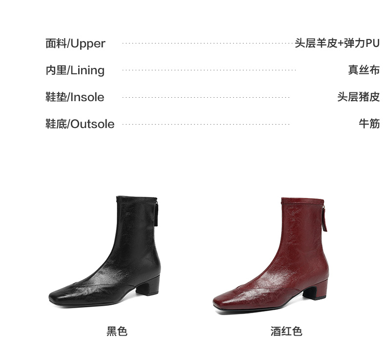 【预售5天】法式气质小踝靴秋冬方头粗跟拼接弹力短筒真皮瘦瘦靴WC&M3600