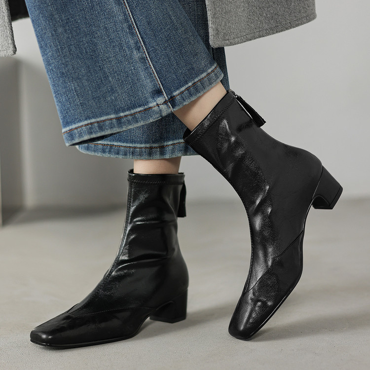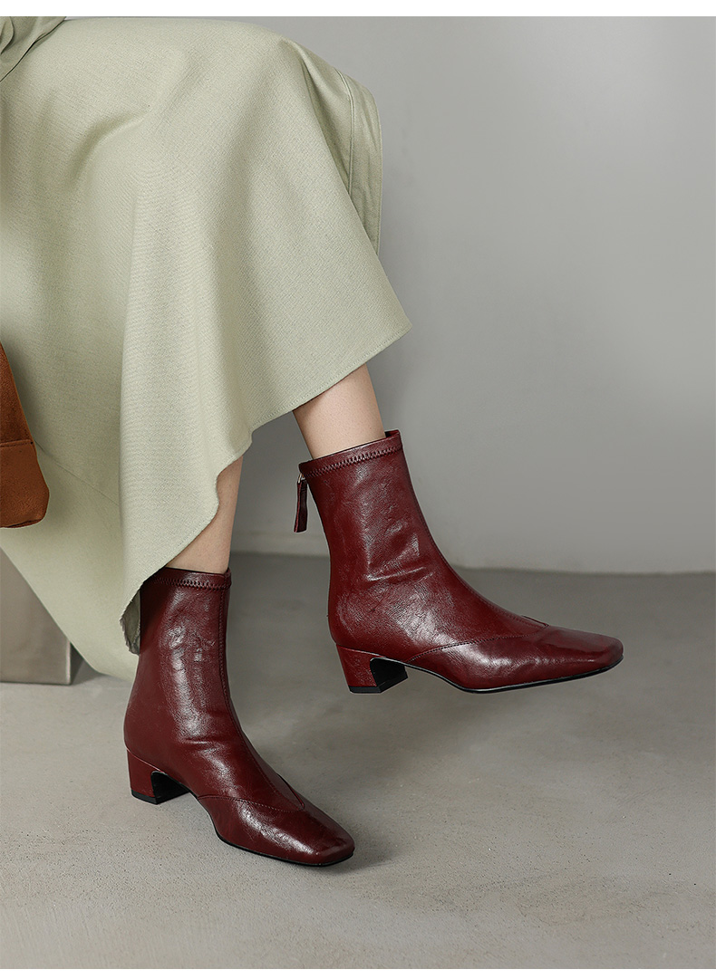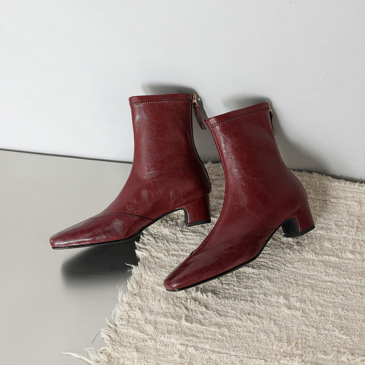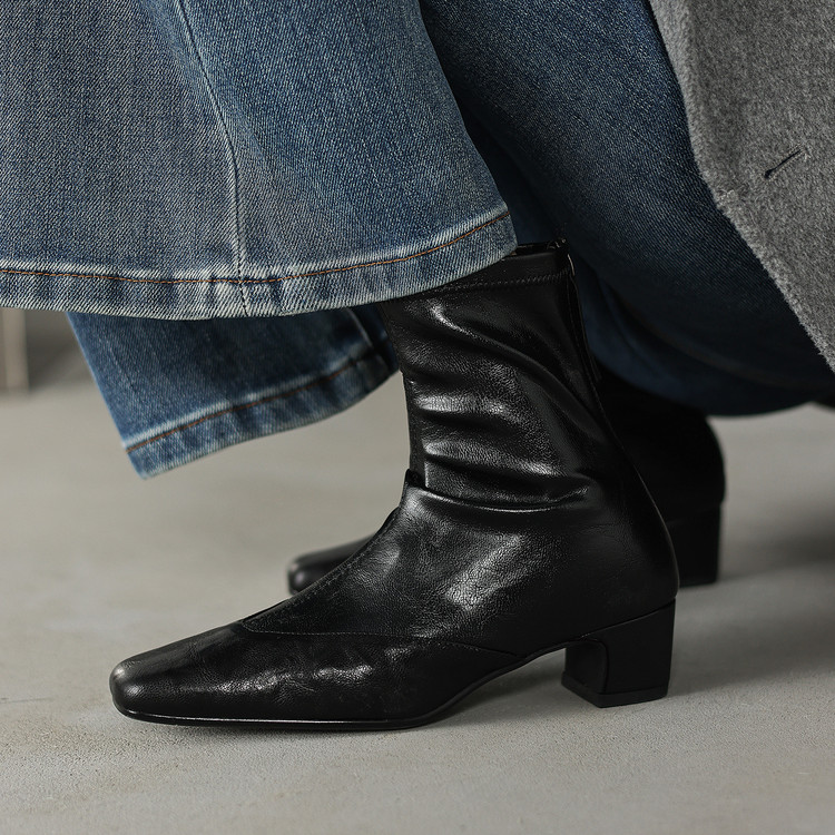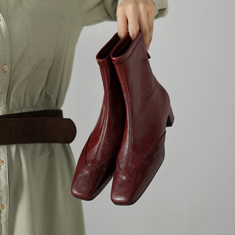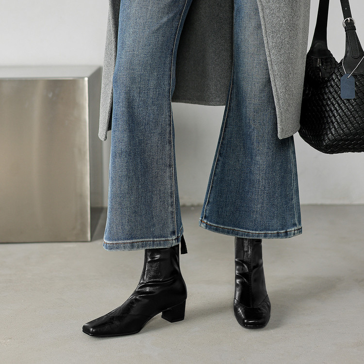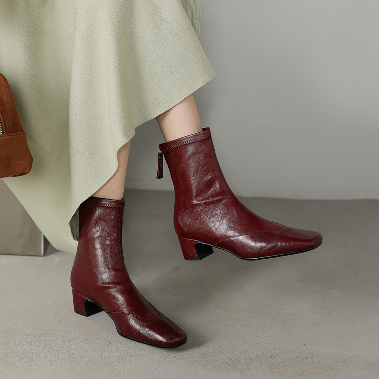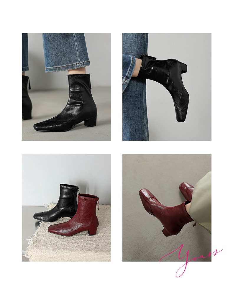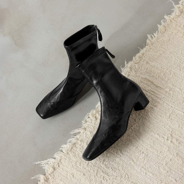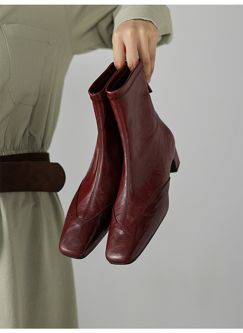 【预售5天】法式气质小踝靴秋冬方头粗跟拼接弹力短筒真皮瘦瘦靴WC&M3600