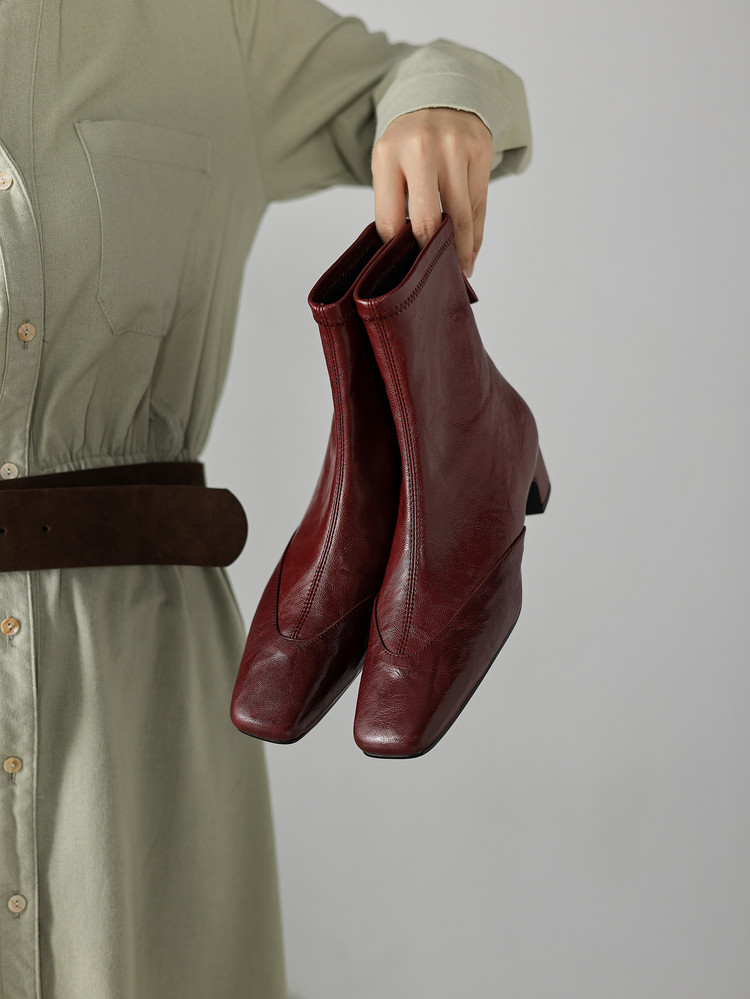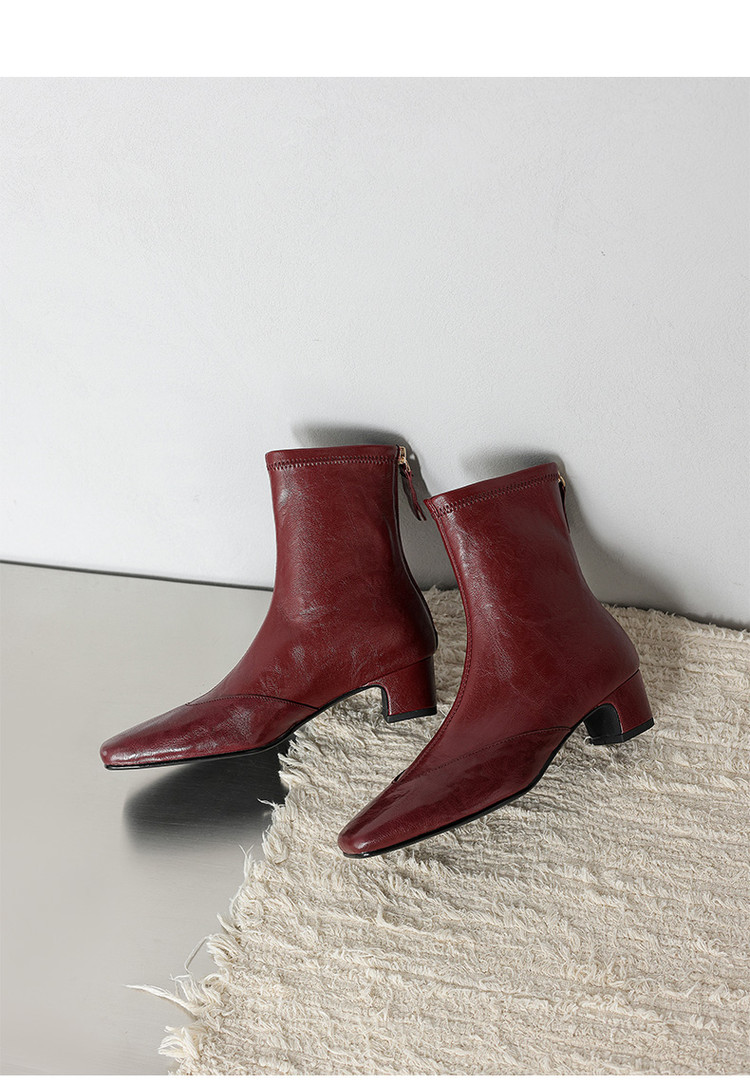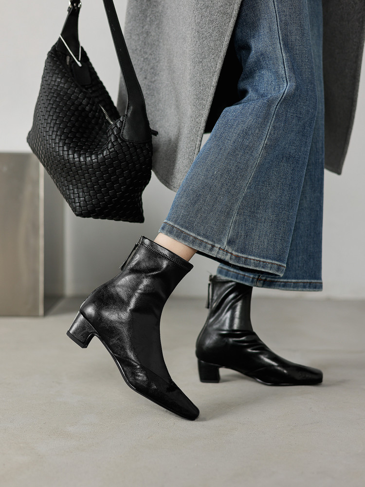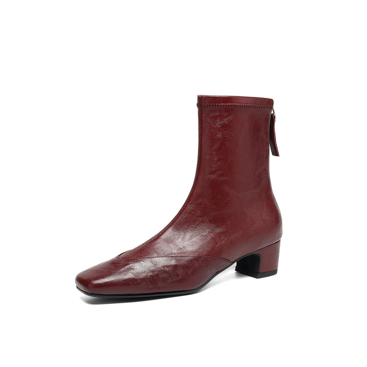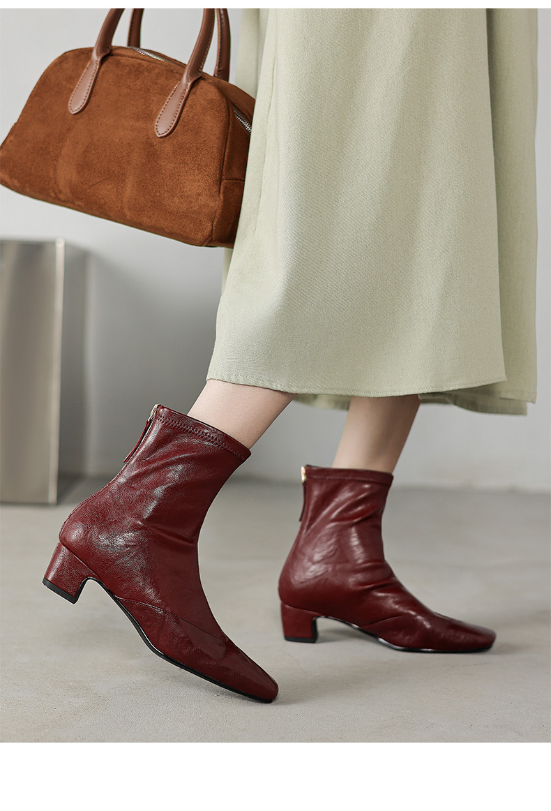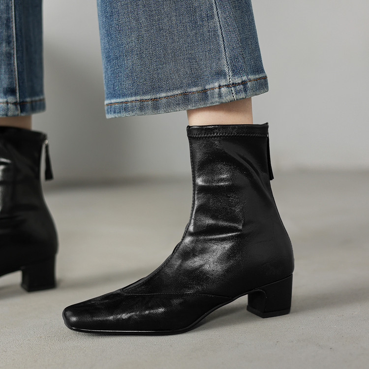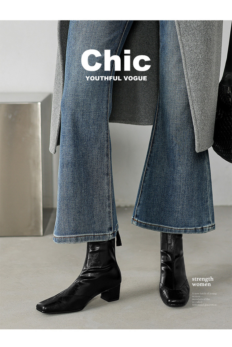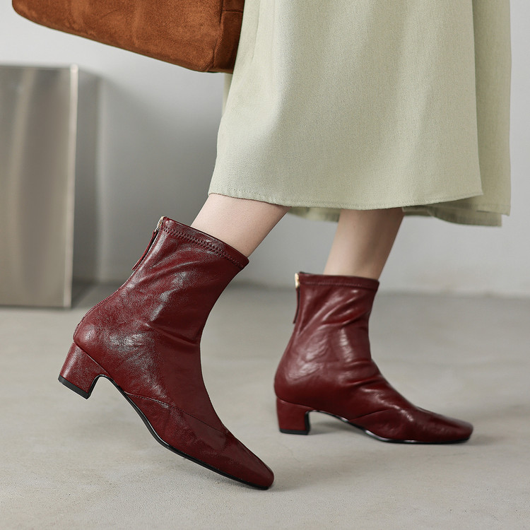 【预售5天】法式气质小踝靴秋冬方头粗跟拼接弹力短筒真皮瘦瘦靴WC&M3600