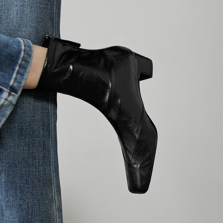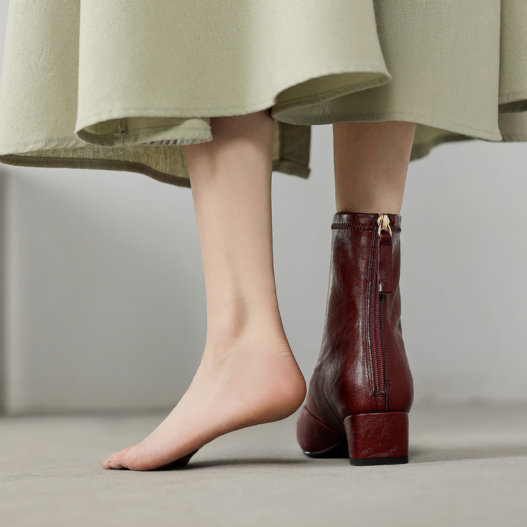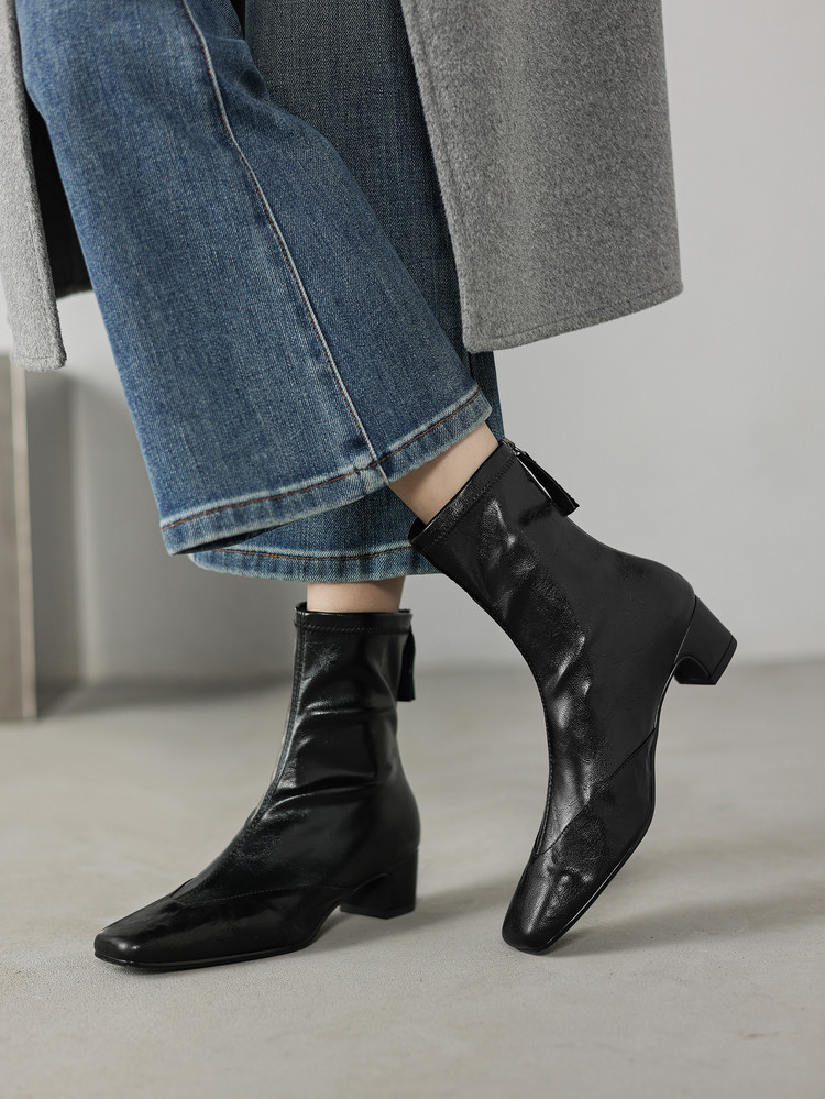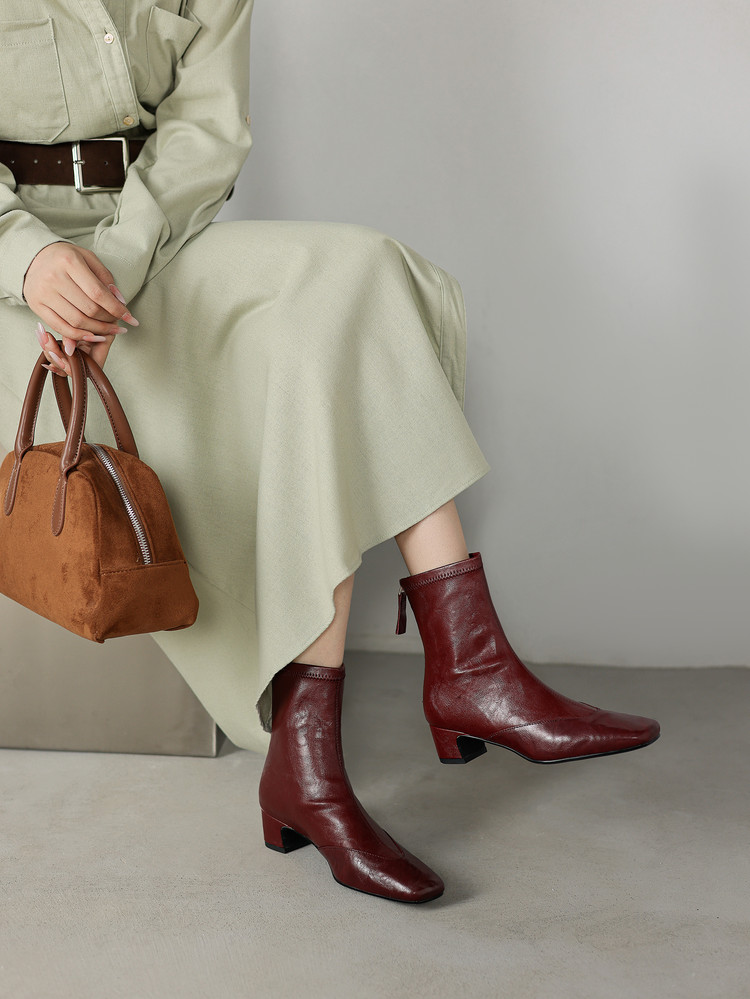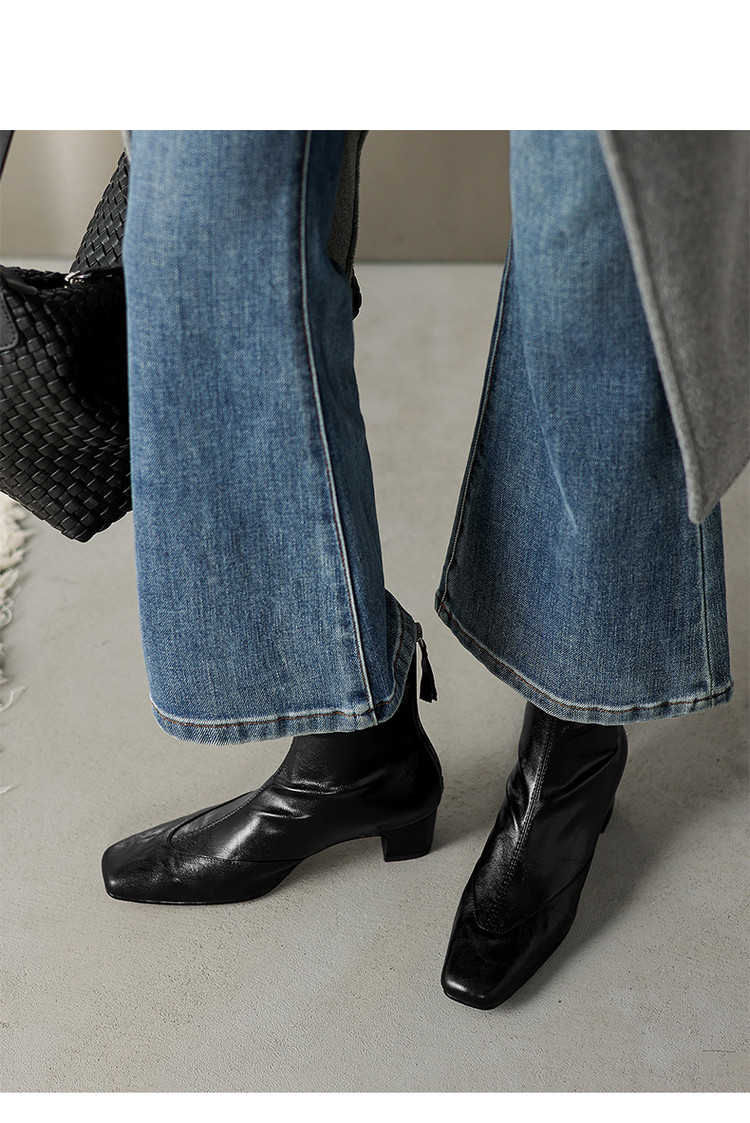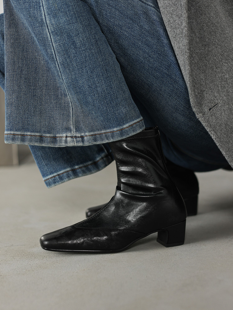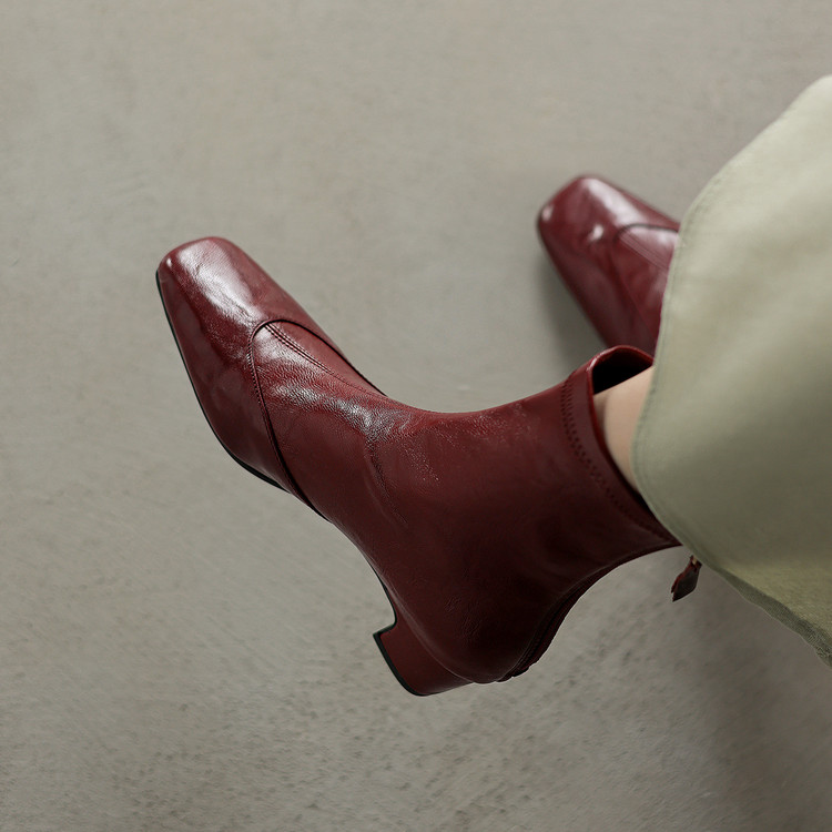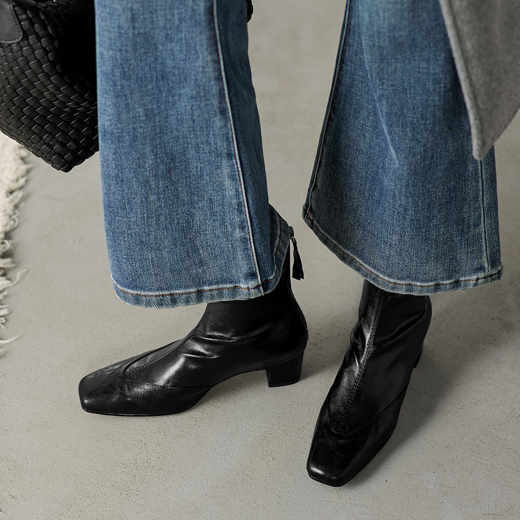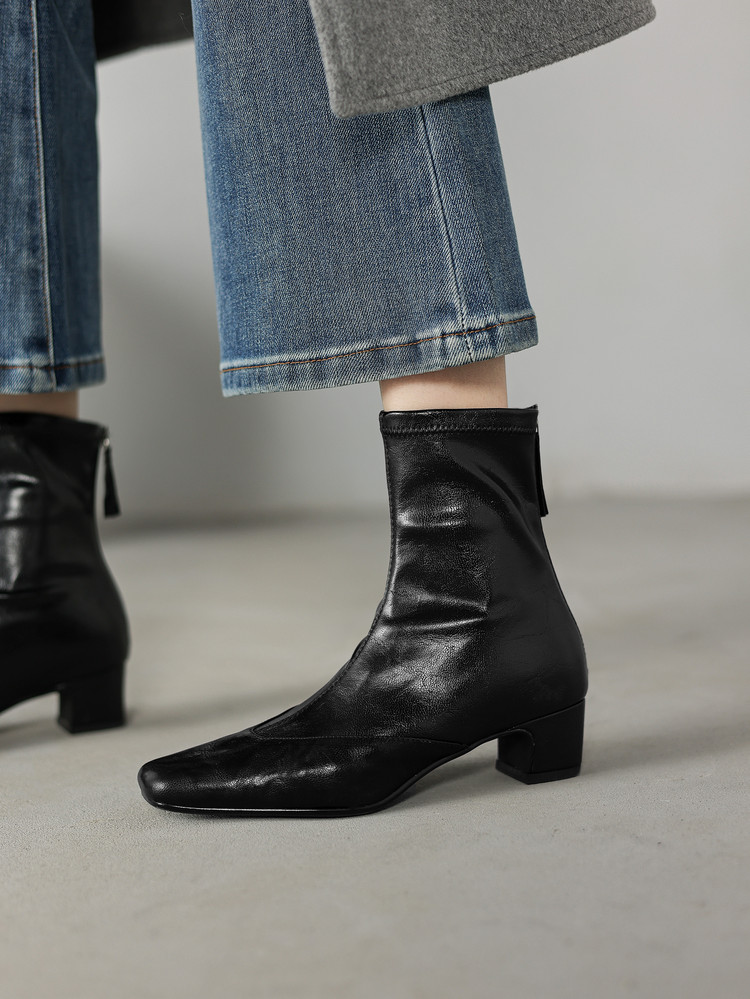 【预售5天】法式气质小踝靴秋冬方头粗跟拼接弹力短筒真皮瘦瘦靴WC&M3600