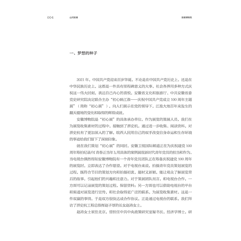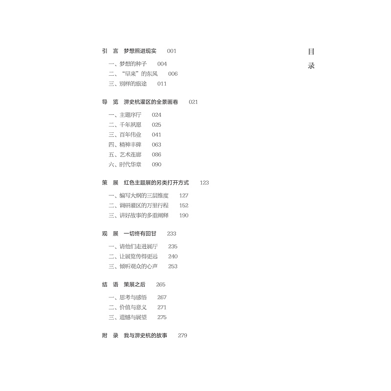 淠史杭灌区是新中国成立后建成的亩均投资最低、灌溉面积最大、唯一跨长江、淮河两大流域的特大型灌区,被誉为“新中国水利建设史上一颗光辉灿烂的明珠”。本书完整呈现了展览的缘起、策划过程,策展团队为推动展览落地走访调研接触的人和遇到的事,以及策展人员的一些思考和感悟。全书共分五章,其中第一章引言,介绍展览立项的契机和特色亮点;第二章导览,讲述展览的基本内容;第三章策展,重点介绍展览文本内容和形式设计的策划经过,策展团队为展览寻求资金、查找资料、寻访展品的过程及期间发生的故事;第四章观展,记录开展后引发的社会影响;第五章结语,分享策展团队对主题展策展的一些思考及展览的溢出价值。最后,附录部分策展团队成员的心路历程。