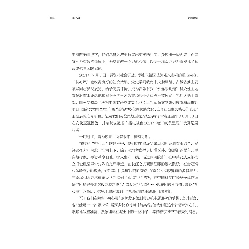 《山河安澜:安徽博物院“淠史杭灌区主题展”策展笔记》用通俗的语言、鲜活的事例、真挚的情感完整记录了展览从最初设想到落地实施的全过程,体现了作者对新时代博物馆职能定位的思考和探索。该笔记可读性强,既适合博物馆业内人士参考,也适合对策展感兴趣的观众阅读。