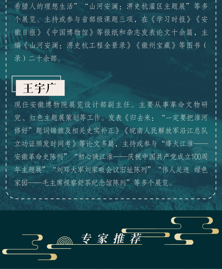 王宇广,现任安徽博物院展览设计部副主任。主要从事革命文物研究、红色主题展策划等工作。发表《归去来:“一定要把淮河修好”题词锦旗及相关史实补正》《皖南人民解放军沿江总队立功证颁发时间考》等论文多篇,主持或参与“烽火江淮——安徽革命史陈列”“初心映江淮——庆祝中国共产党成立100周年主题展”“刘邓大军刘家畈会议旧址陈列”“伟人足迹 绿色家园——毛主席视察舒茶纪念馆陈列”等多个展览。