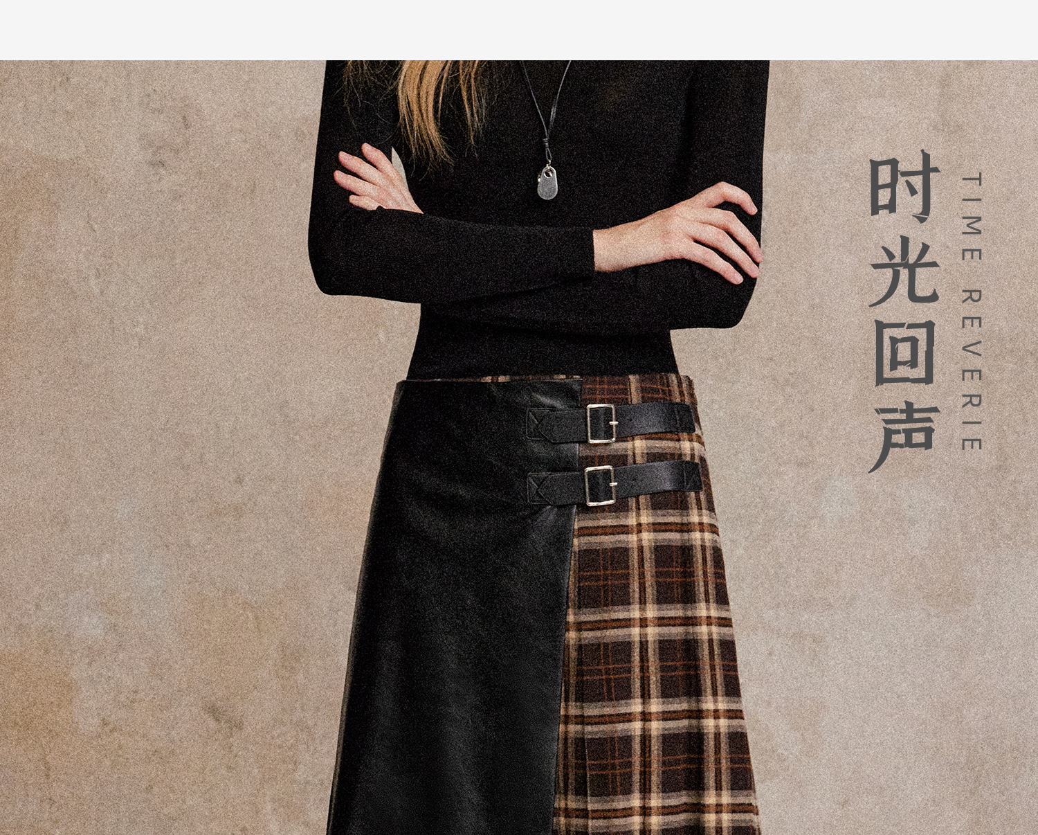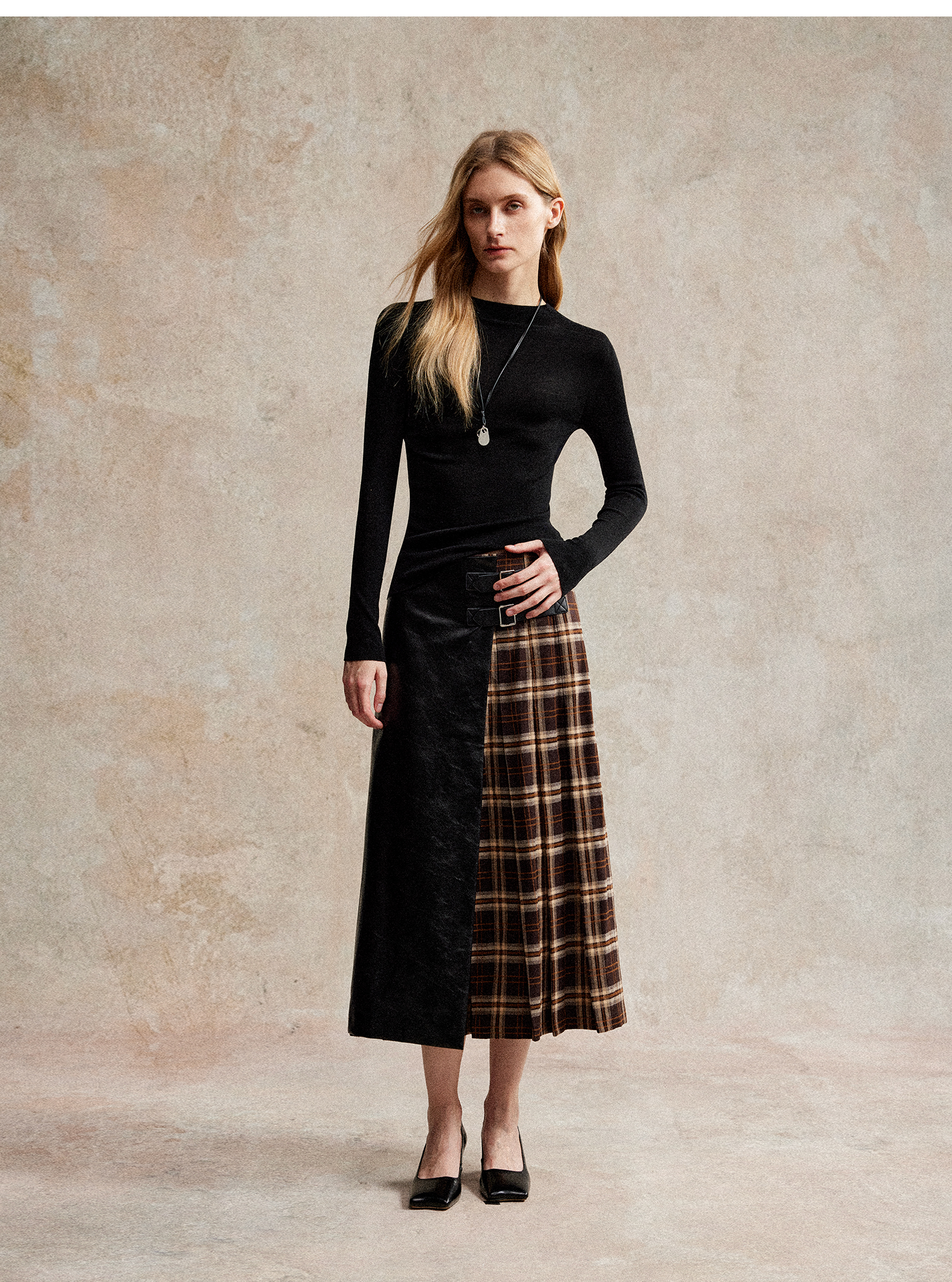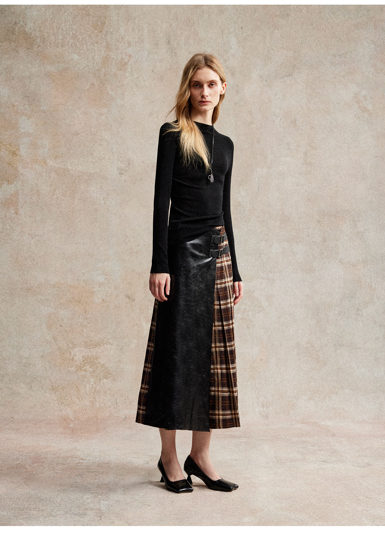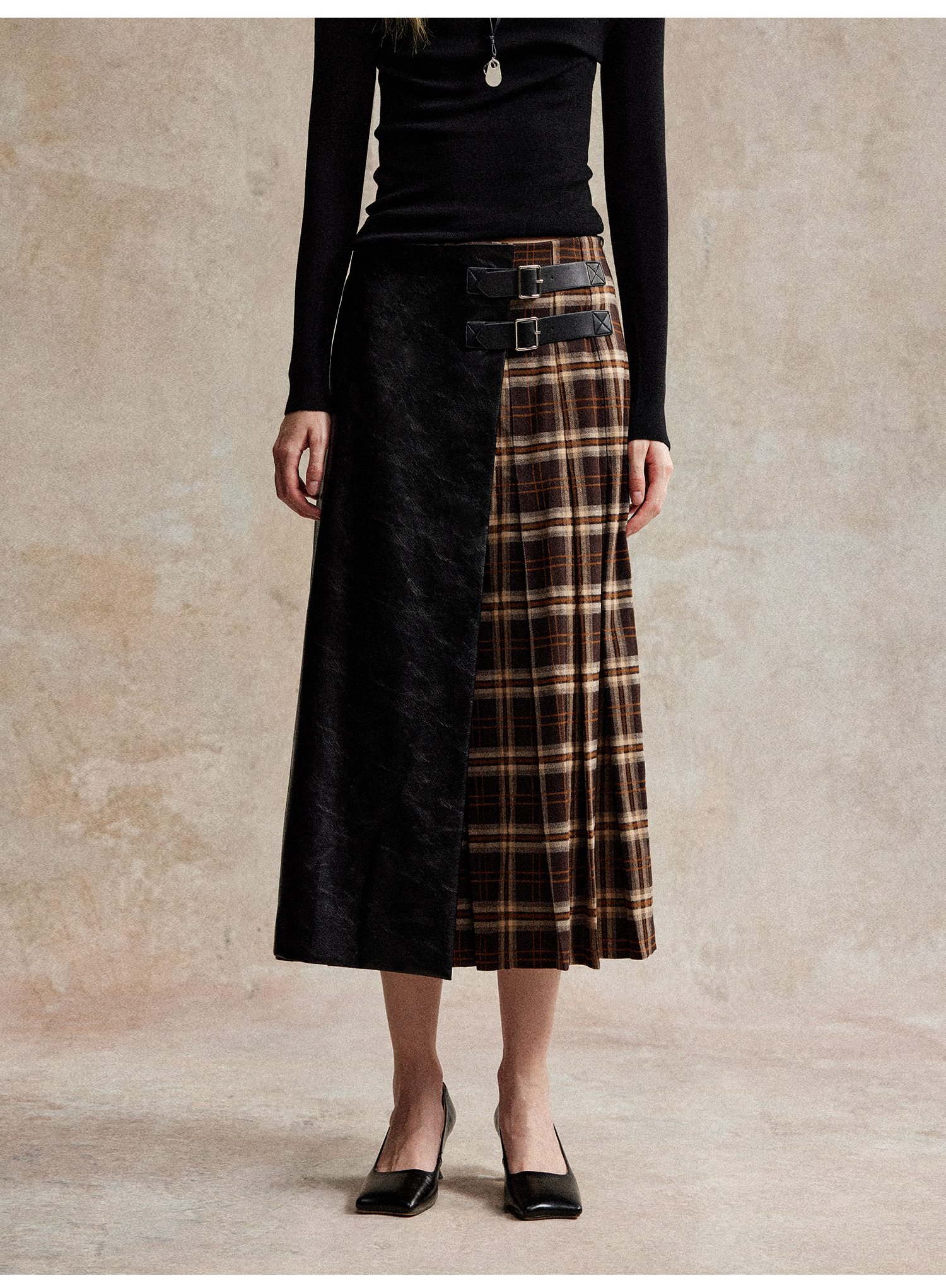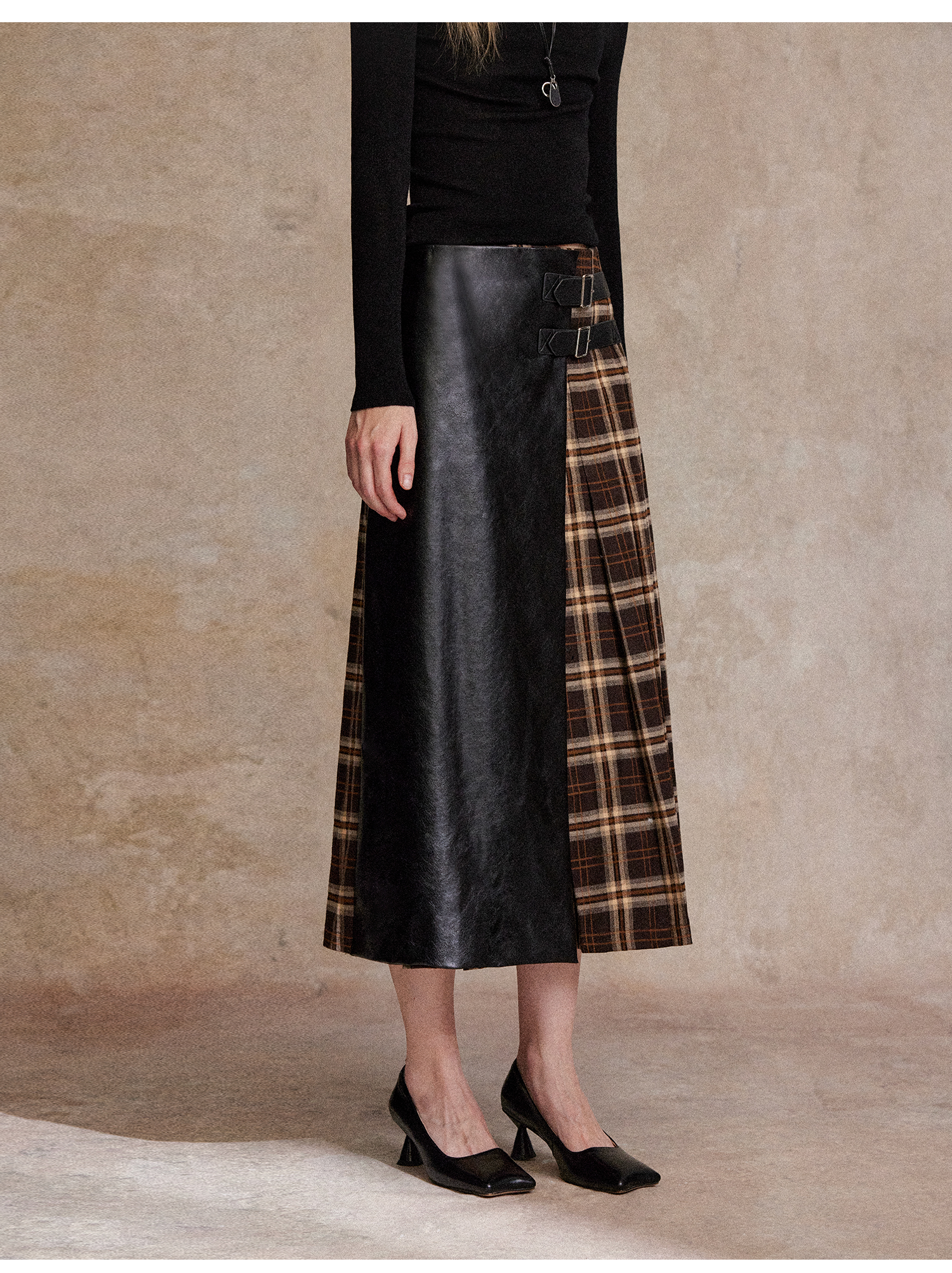 C+IMPRESS/西嘉复古格纹拼接PU皮半身裙女秋小众设计感高腰中长裙