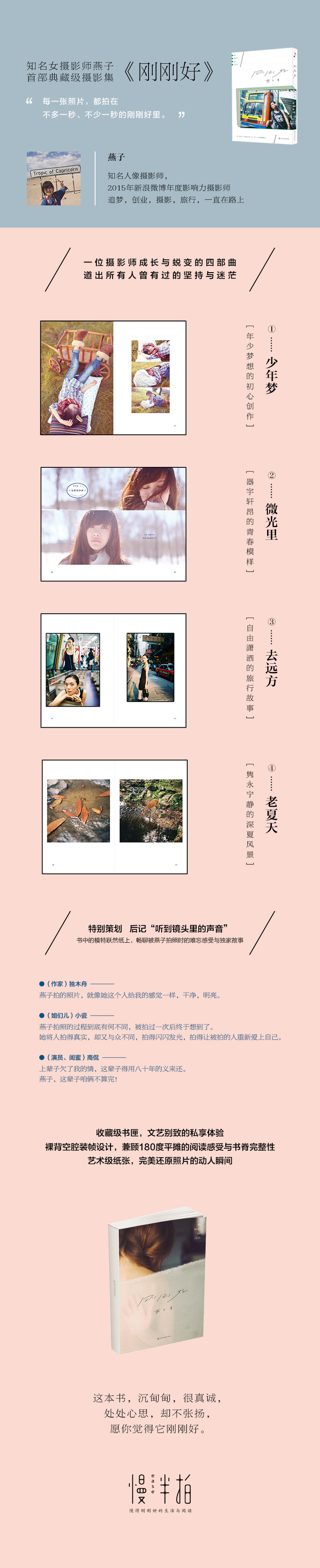 《刚刚好》是摄影师燕子镜头里的故事。 这里有关于年少的梦想,青春的模样,去远方的勇敢自由,以及心中永恒的风景。 每一张照片,都拍在不多一秒、不少一秒的刚刚好里。 在这本书中,燕子带你看她看到的世界, 也许和你的世界曾有重合, 也许是你不曾看过的景象, 也许帮你道出了你想说却说不出的执着与迷茫。
