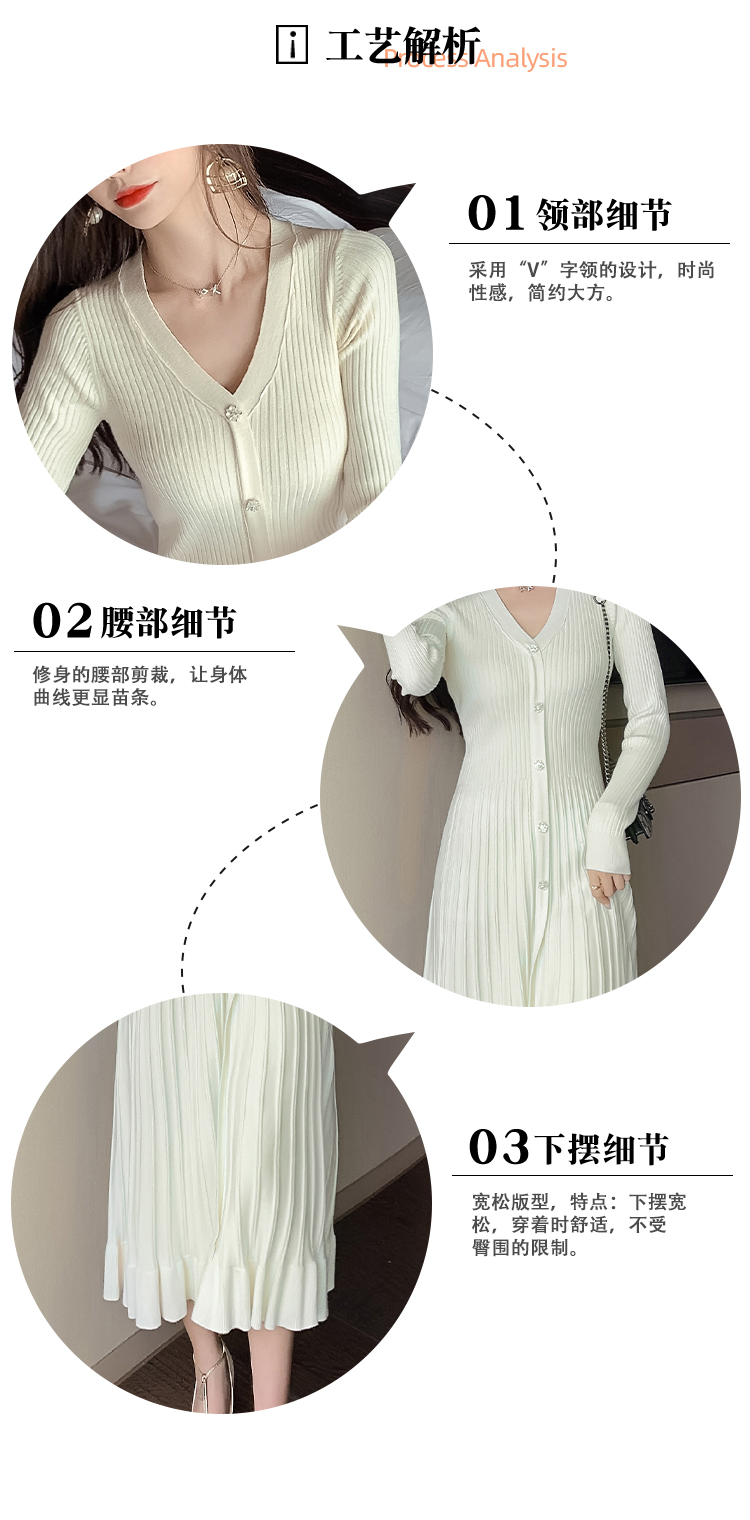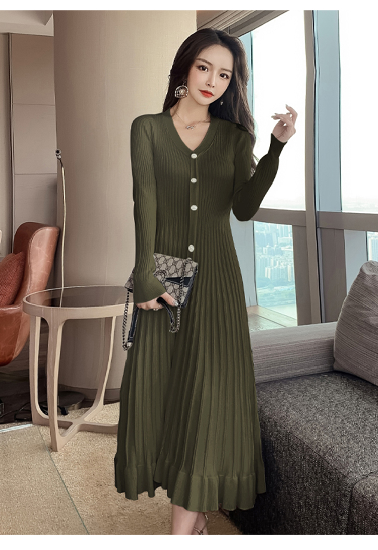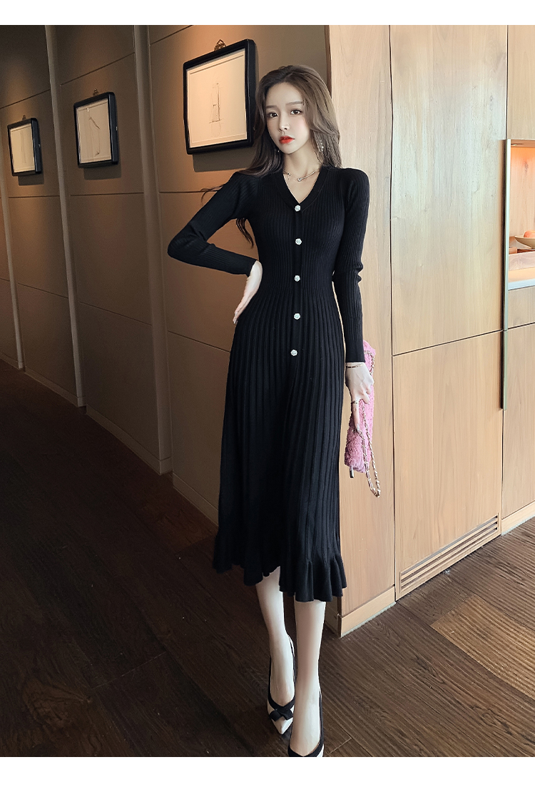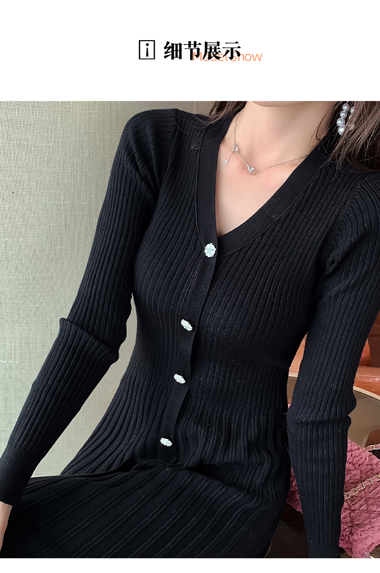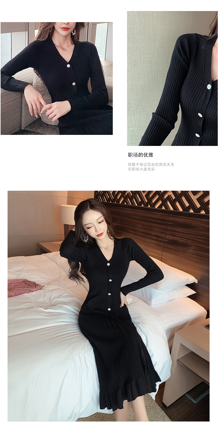 实拍冬季针织毛衣大v领长袖大摆形钻扣连衣裙女 NSM5211