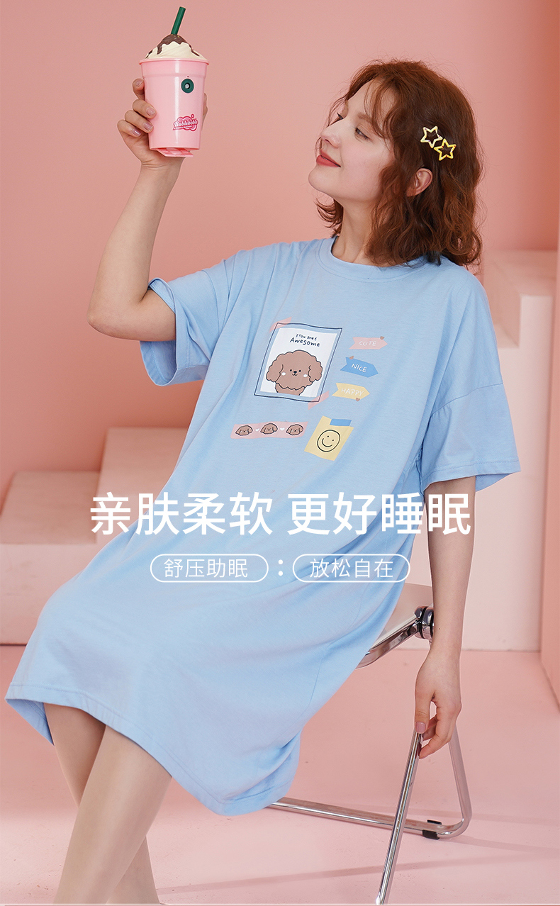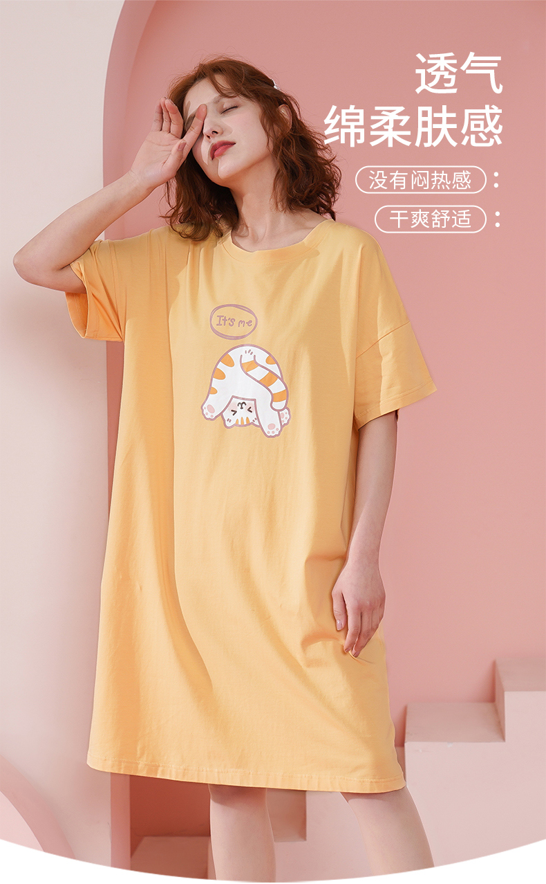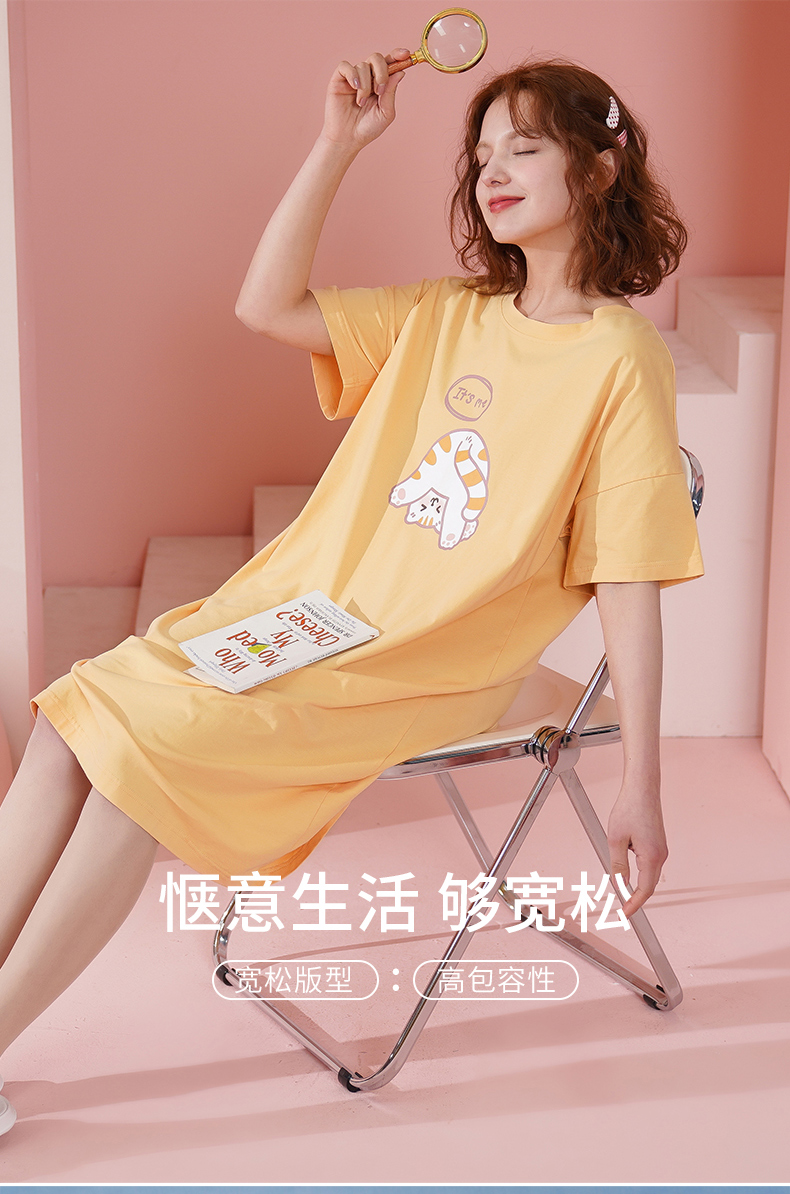 芬腾睡裙女纯棉春秋天夏季薄款休闲宽松可爱睡衣连衣裙子大码