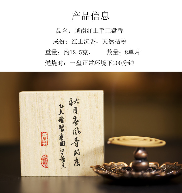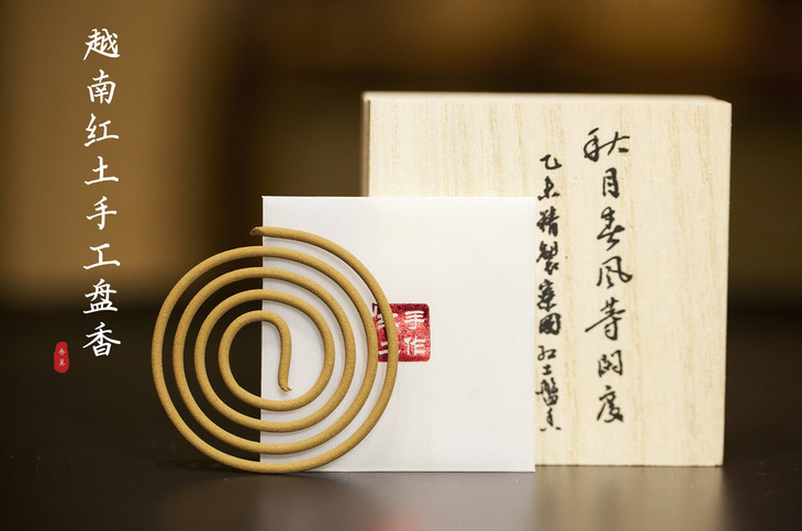 此款,越南红土古法手工盘香,原料选用越南芽庄天然野生沉香配以闻名世界的越南富森红土。经炮制后,择良辰吉日和香而成,是盘香中的上品。