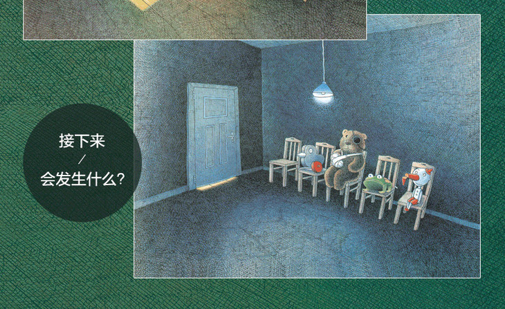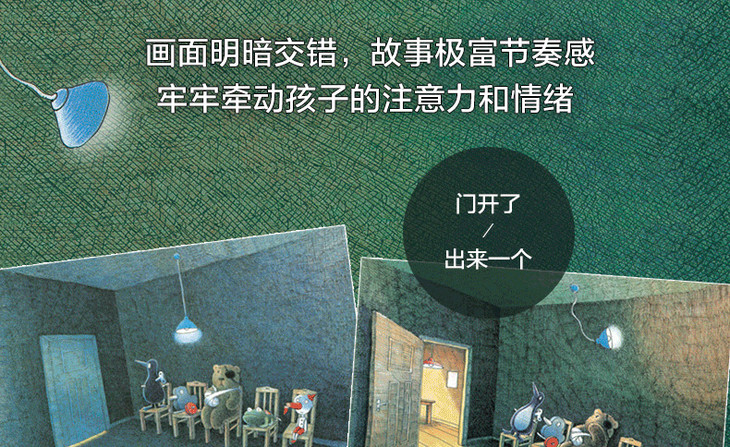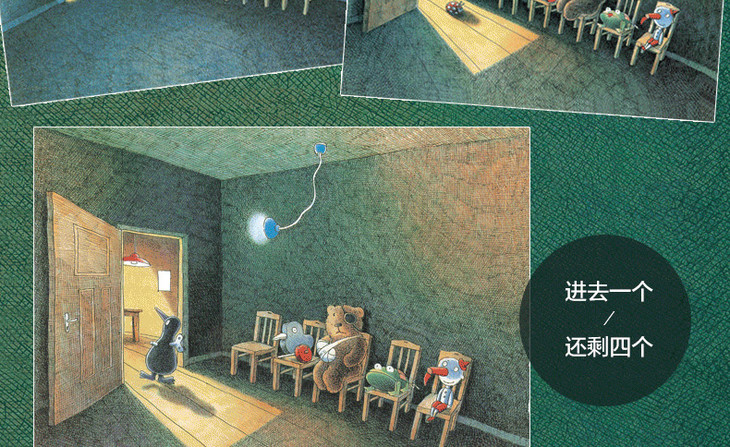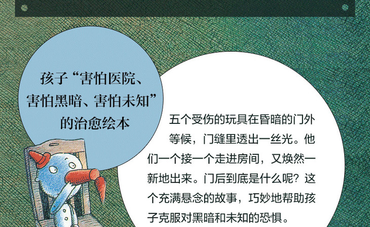 五个受伤的玩具在昏暗的门外等候着,门缝里透出暖暖的光。玩具们一个接一个地走进房间,又焕然一新地出来。排在后面一个的小木偶越来越害怕,门后面到底是什么呢?这个充满悬念的故事,巧妙地帮助孩子克服了对黑暗和未知的恐惧。