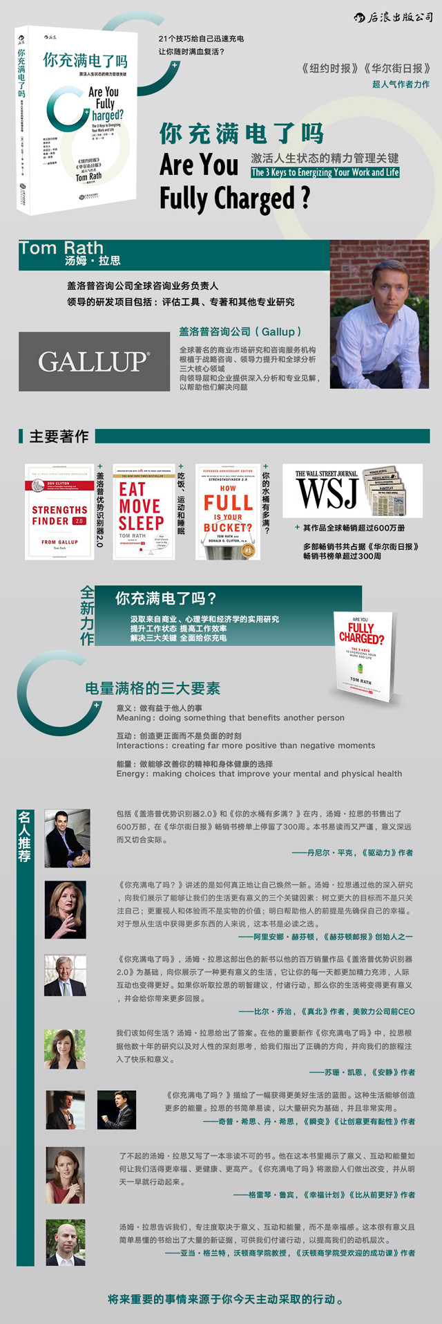 是不是每隔一段时间总有那么几天无心工作,也不愿与人交往,身心俱疲,找不到状态?你该充电了!身为盖洛普咨询公司高管的本书作者,利用手头的海量资源进行了大范围的调查研究,结合来自商业、心理学和经济学的最新研究成果,提炼出让你精神饱满、能量满格的三大关键因素,并从数千条备选策略中,精选了21个让你快速充电的方法。翻开本书,开启“电力十足”的自己,为自己和他人创造更充实的一天吧!