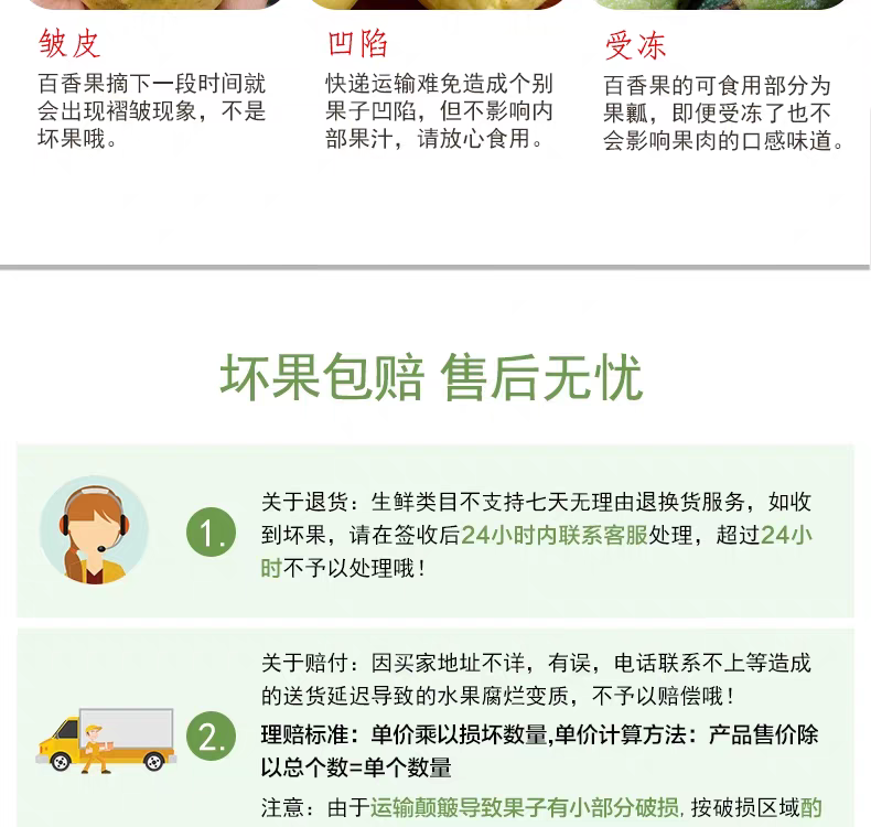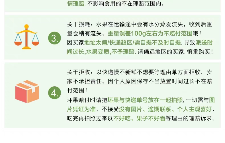 3、非质量问题,例如:品相/口感不影响食用,不予赔付,介意勿拍。