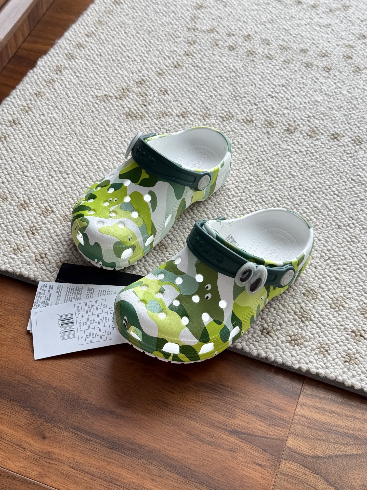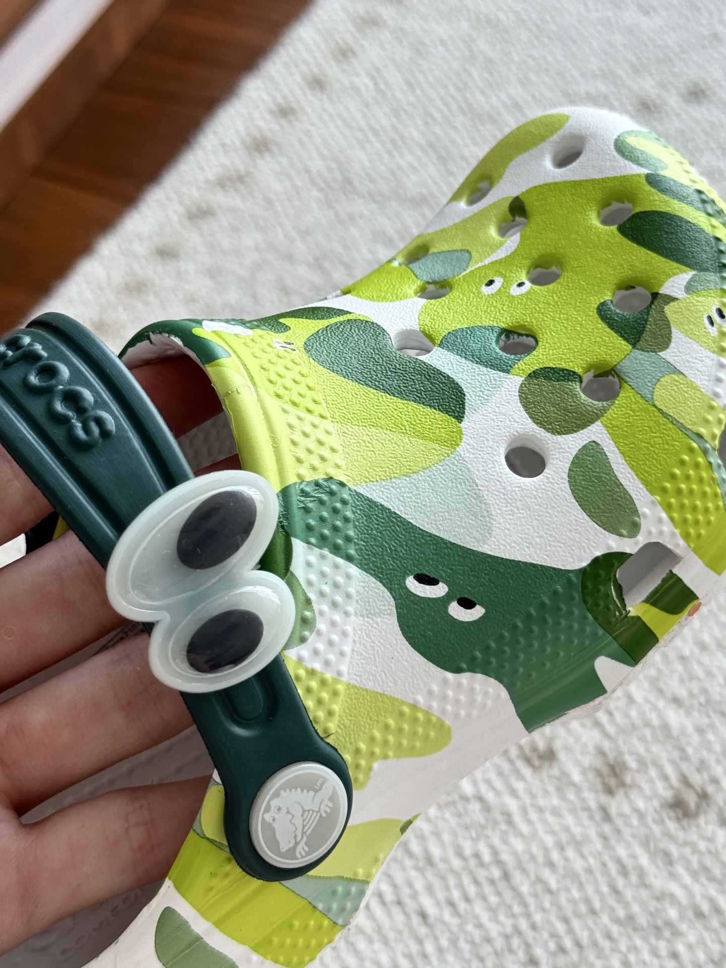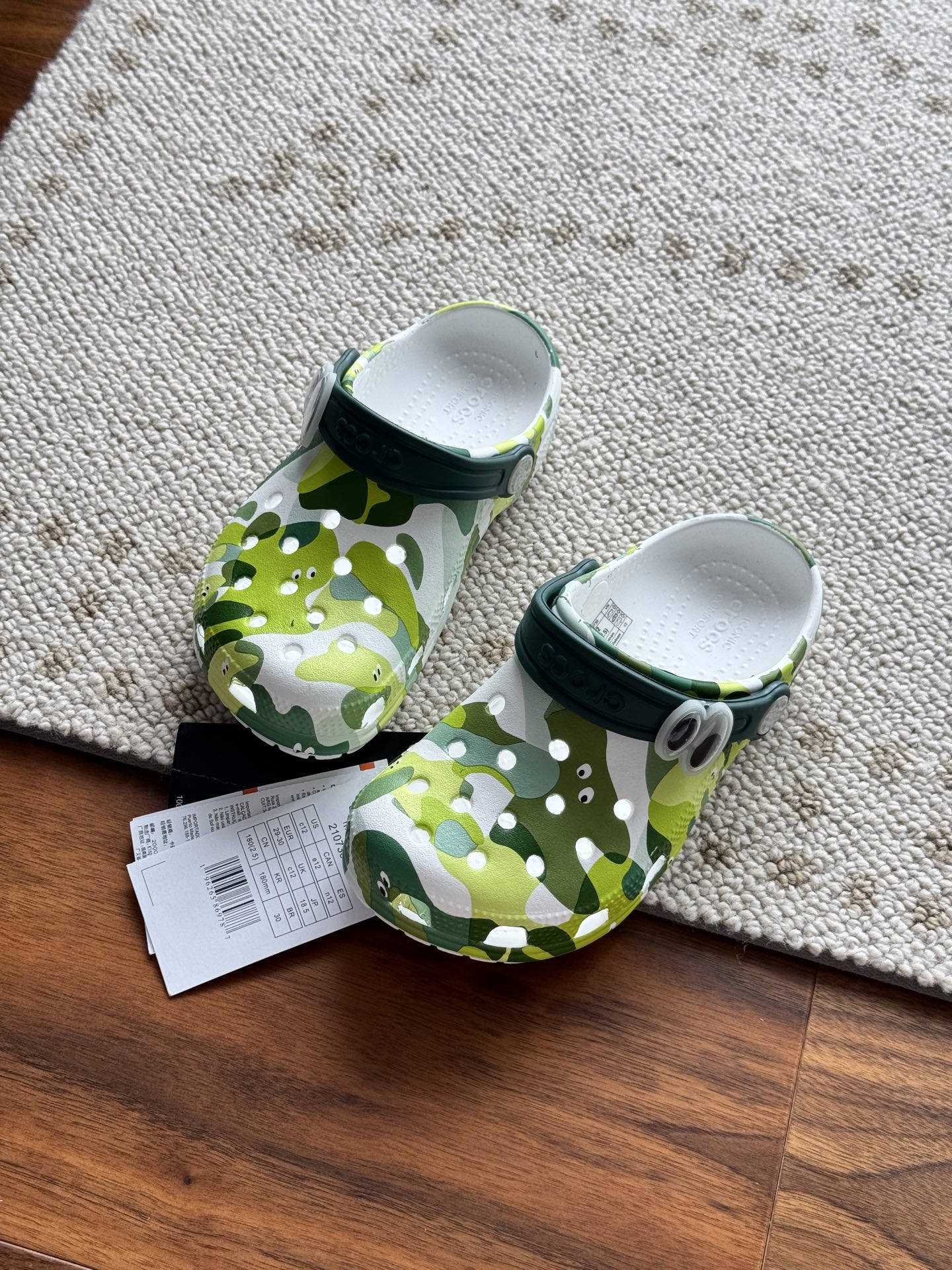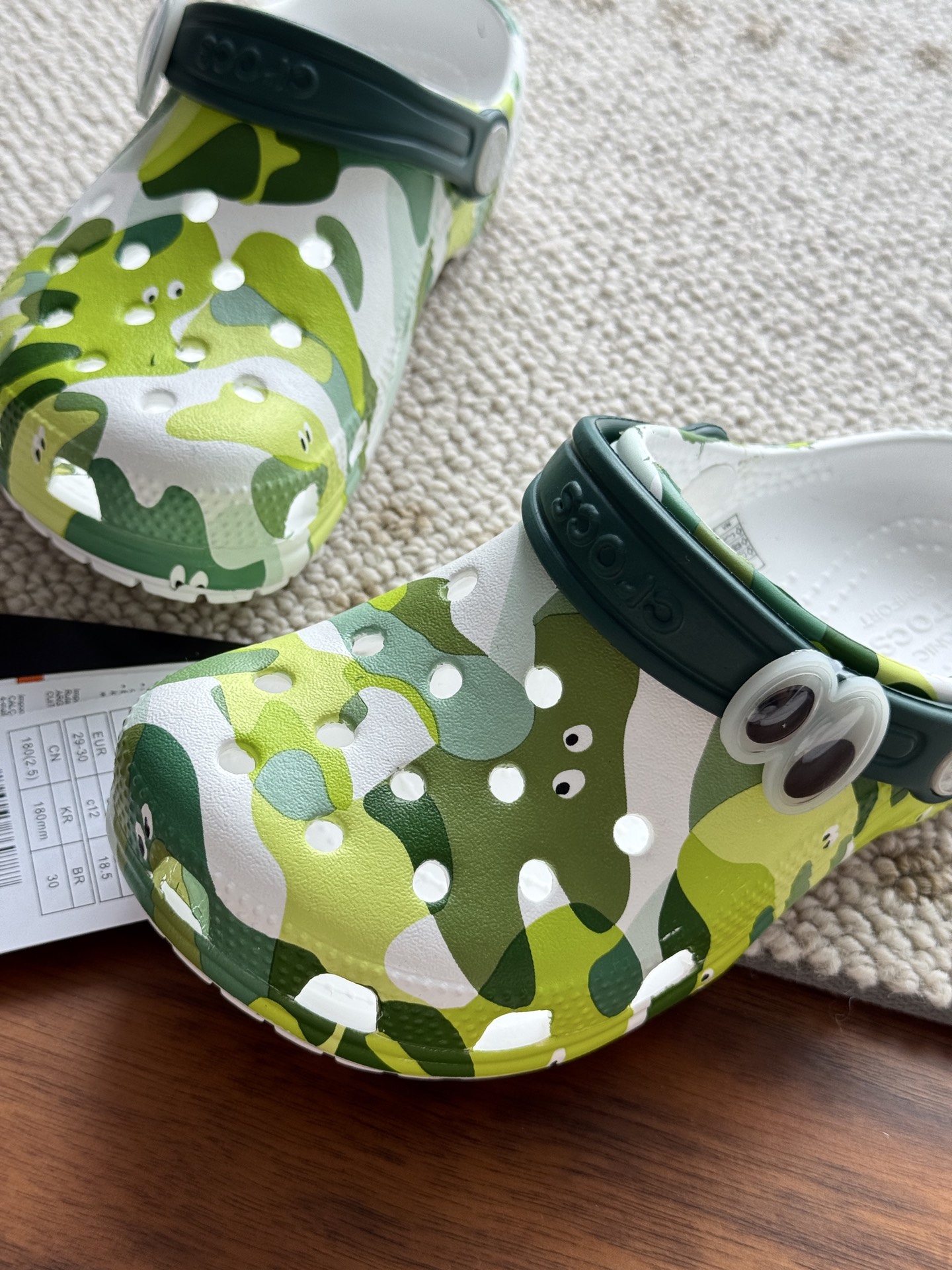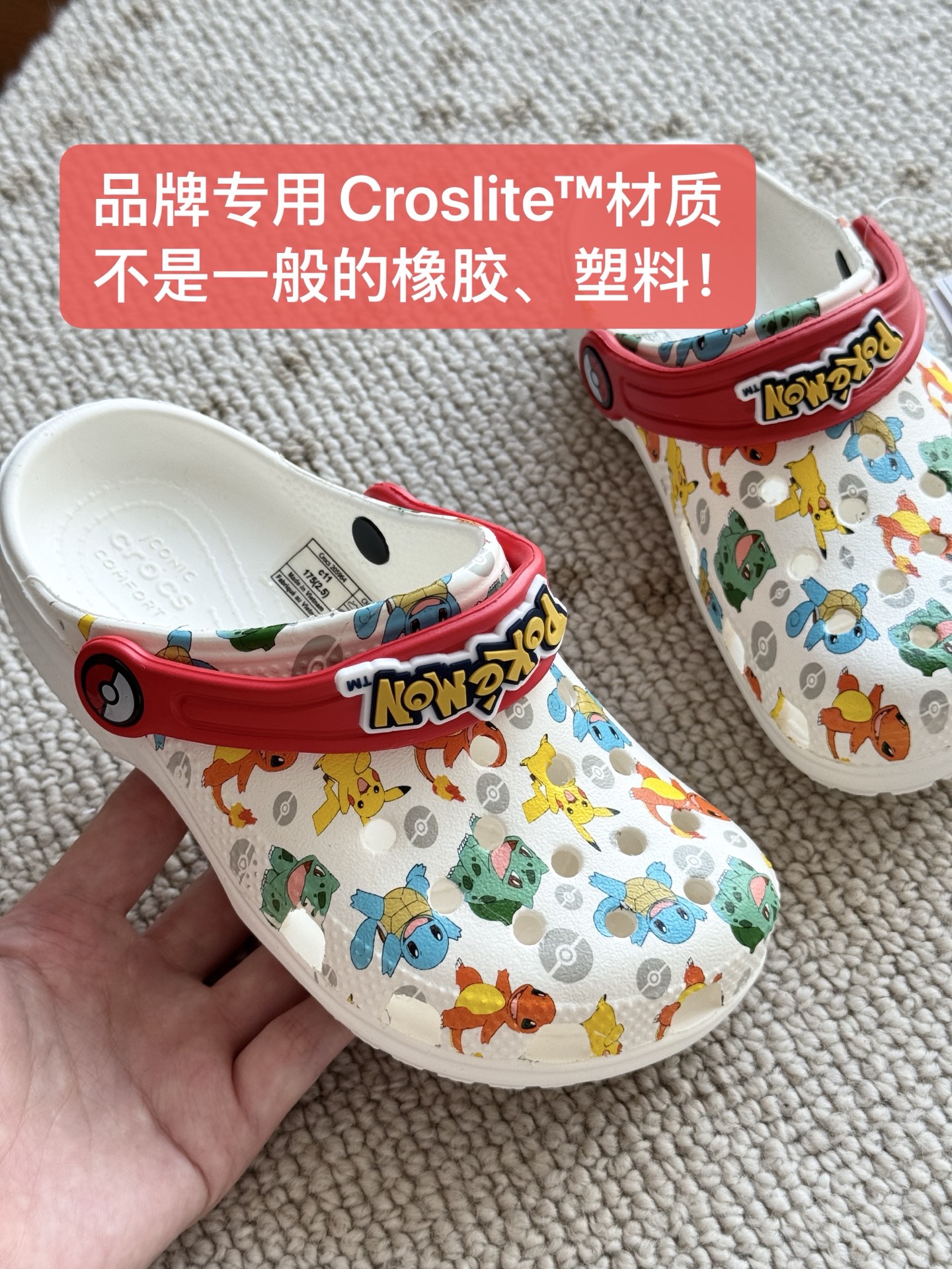 给宝贝的东西, 都是用的环保Croslite材料,封闭式细胞树脂, 能够在体温作用下自动变形以适应脚部形状。 提供轻质缓冲和舒适性,易于清洁,抓地力强, 不易打滑符合人体工学,鞋垫软弹有支撑注意看鞋内纹理,好不好自己去感受每一个都值得你细品 真材实料!很柔软鞋身全是通风洞洞,夏天脚丫秒散热,搭配可调后跟带,当凉拖或踩跟穿都行,一鞋两穿超灵活!Croslite™特殊的封闭式细胞树脂材质,能够在体温作用下自动变形以适应脚部形状,这也是洞洞鞋最好穿的细节!