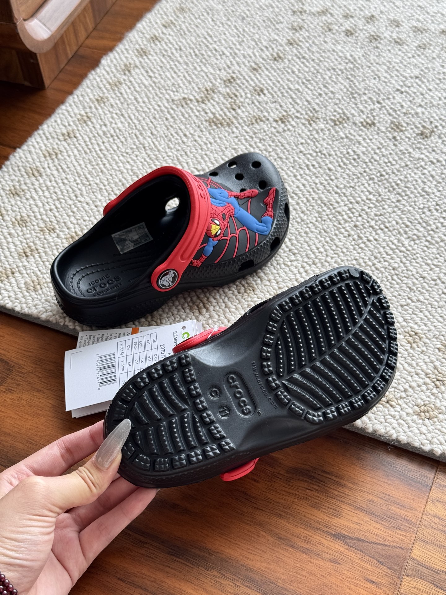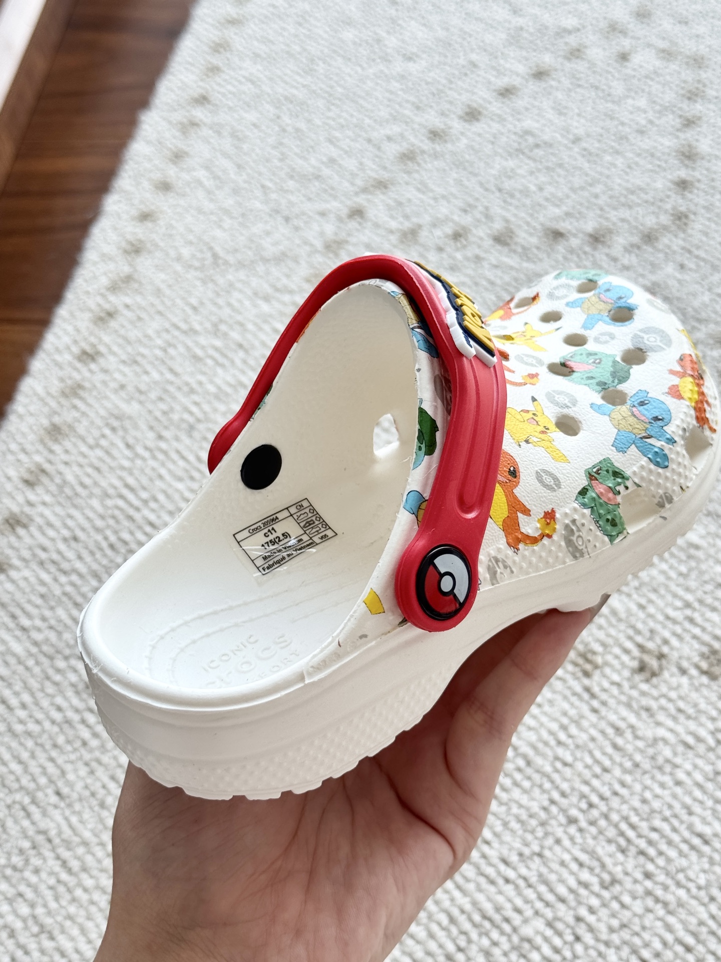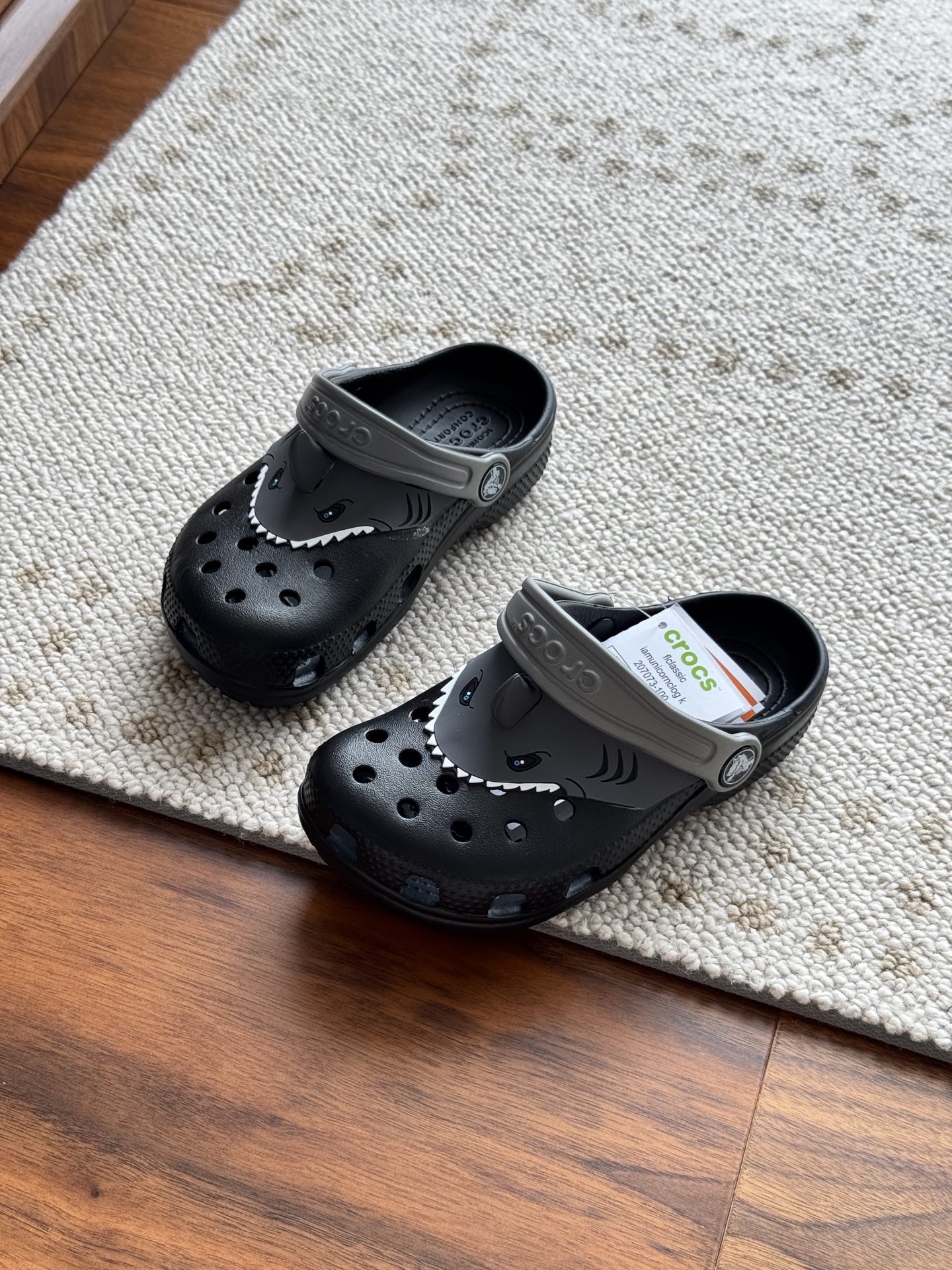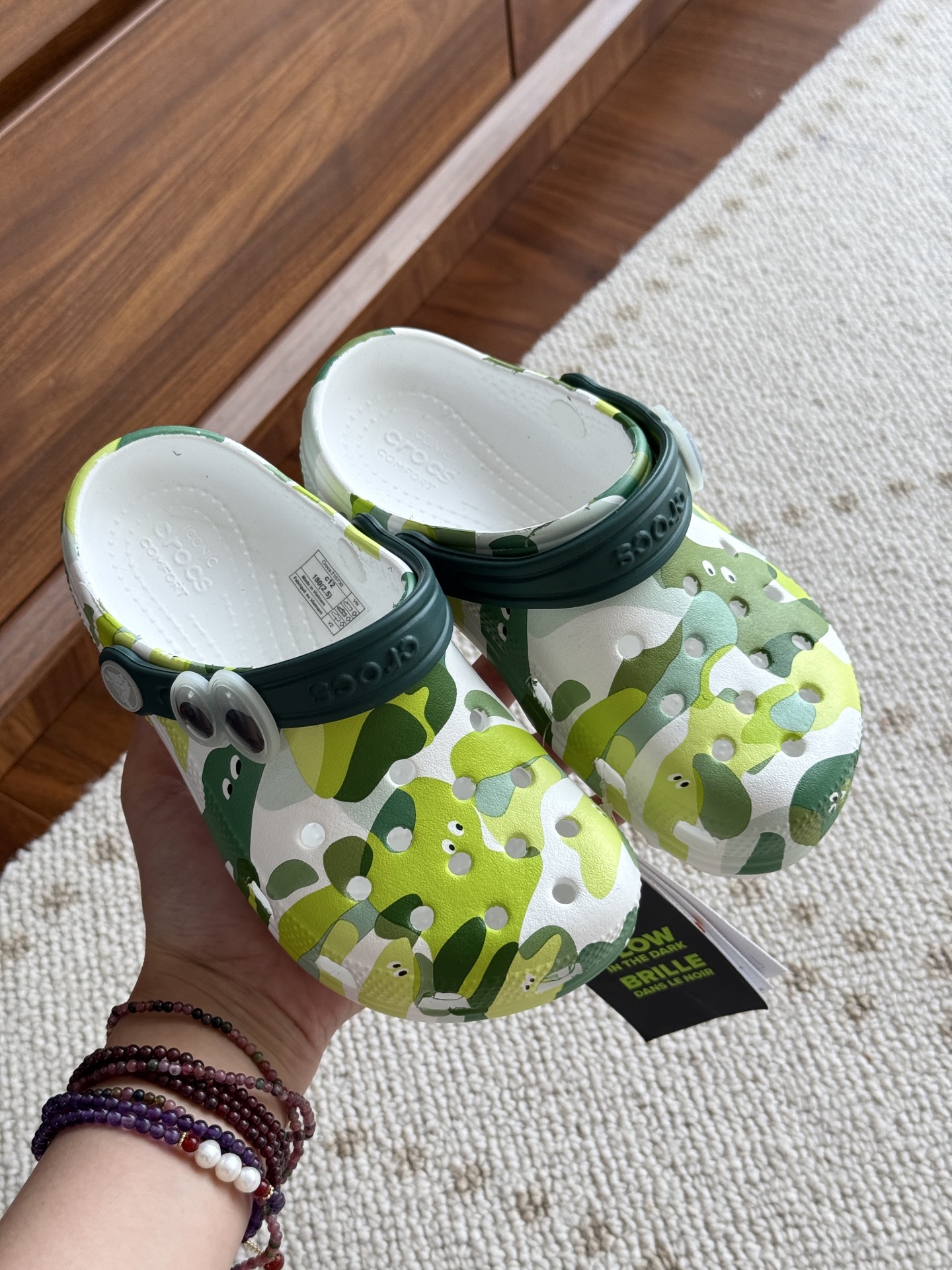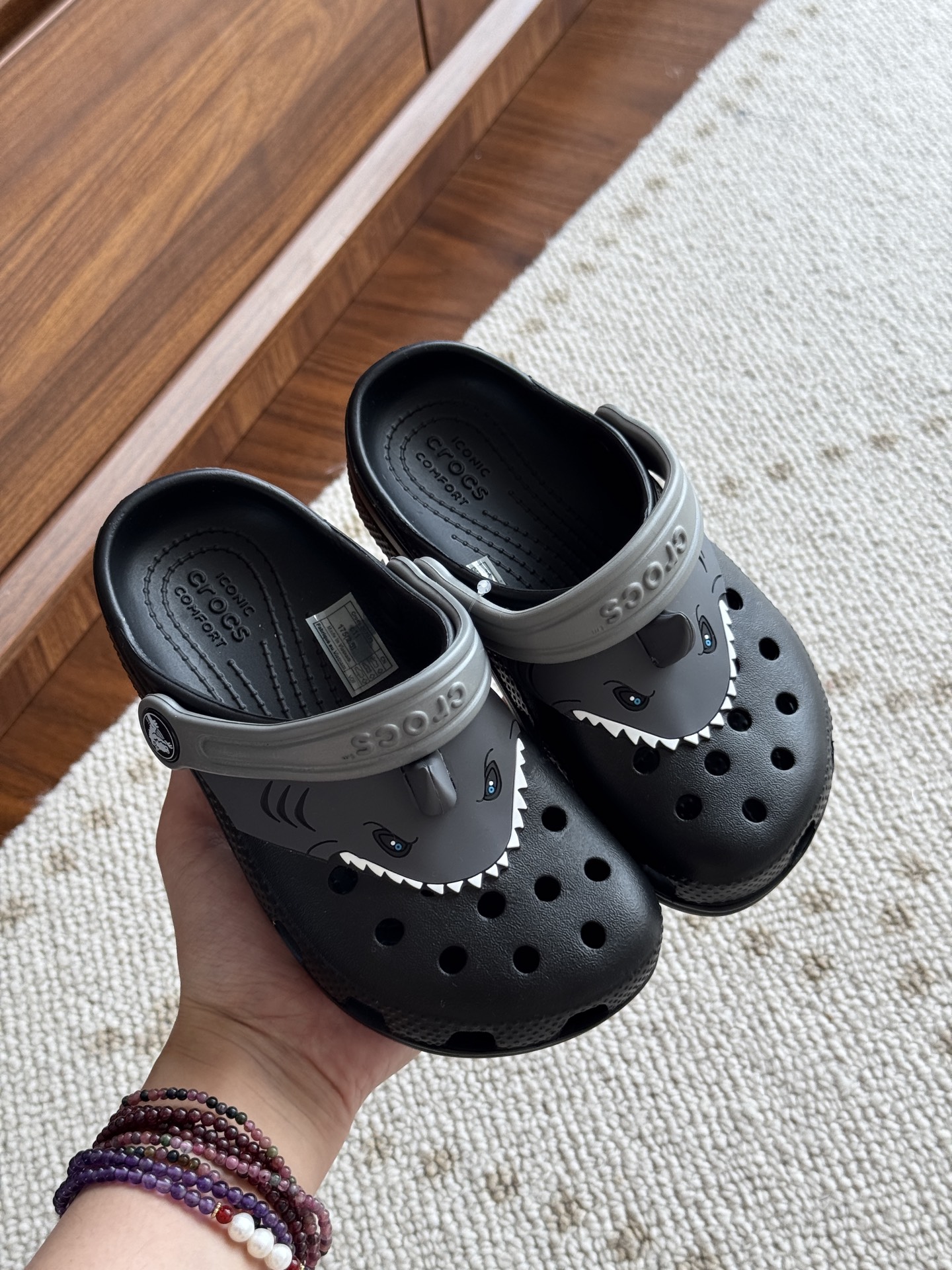 给宝贝的东西, 都是用的环保Croslite材料,封闭式细胞树脂, 能够在体温作用下自动变形以适应脚部形状。 提供轻质缓冲和舒适性,易于清洁,抓地力强, 不易打滑符合人体工学,鞋垫软弹有支撑注意看鞋内纹理,好不好自己去感受每一个都值得你细品 真材实料!很柔软鞋身全是通风洞洞,夏天脚丫秒散热,搭配可调后跟带,当凉拖或踩跟穿都行,一鞋两穿超灵活!Croslite™特殊的封闭式细胞树脂材质,能够在体温作用下自动变形以适应脚部形状,这也是洞洞鞋最好穿的细节!