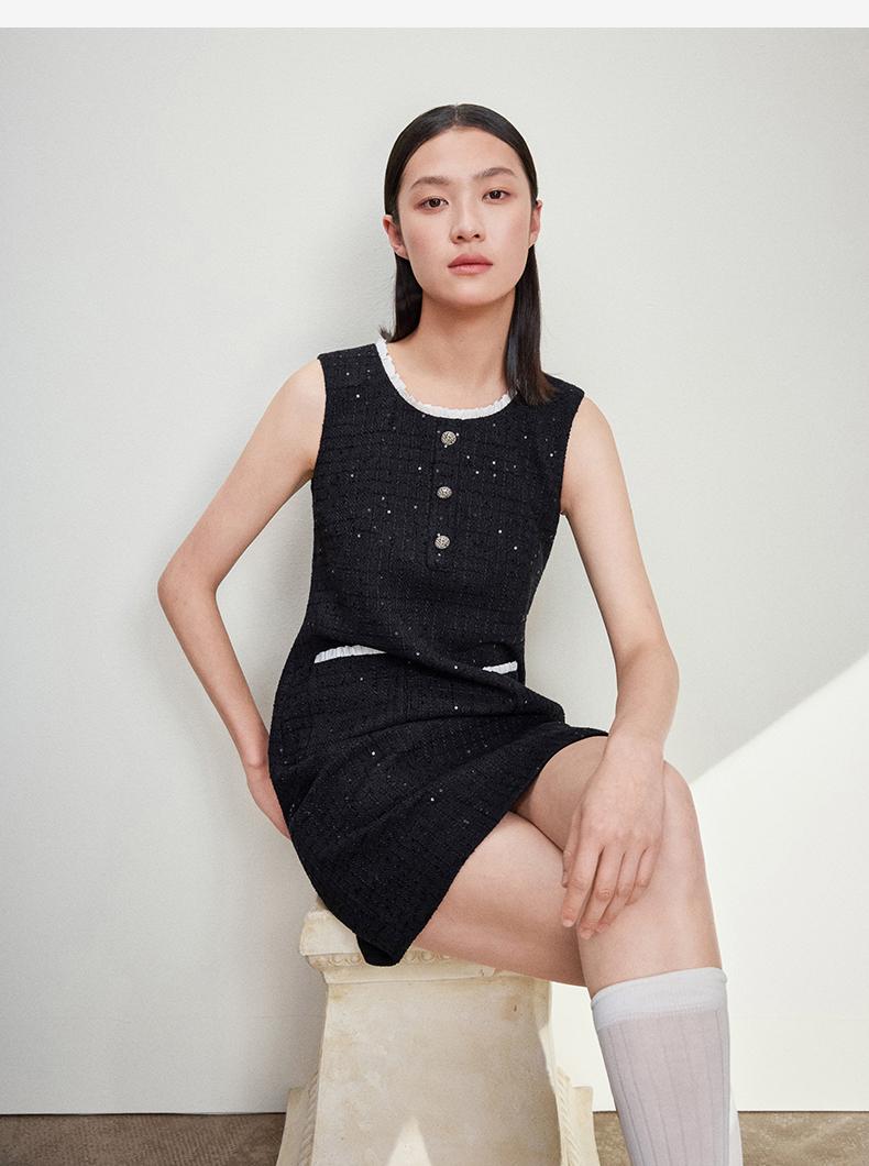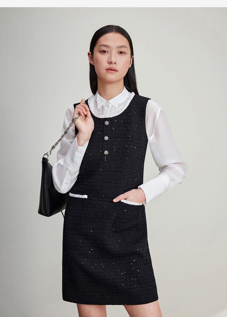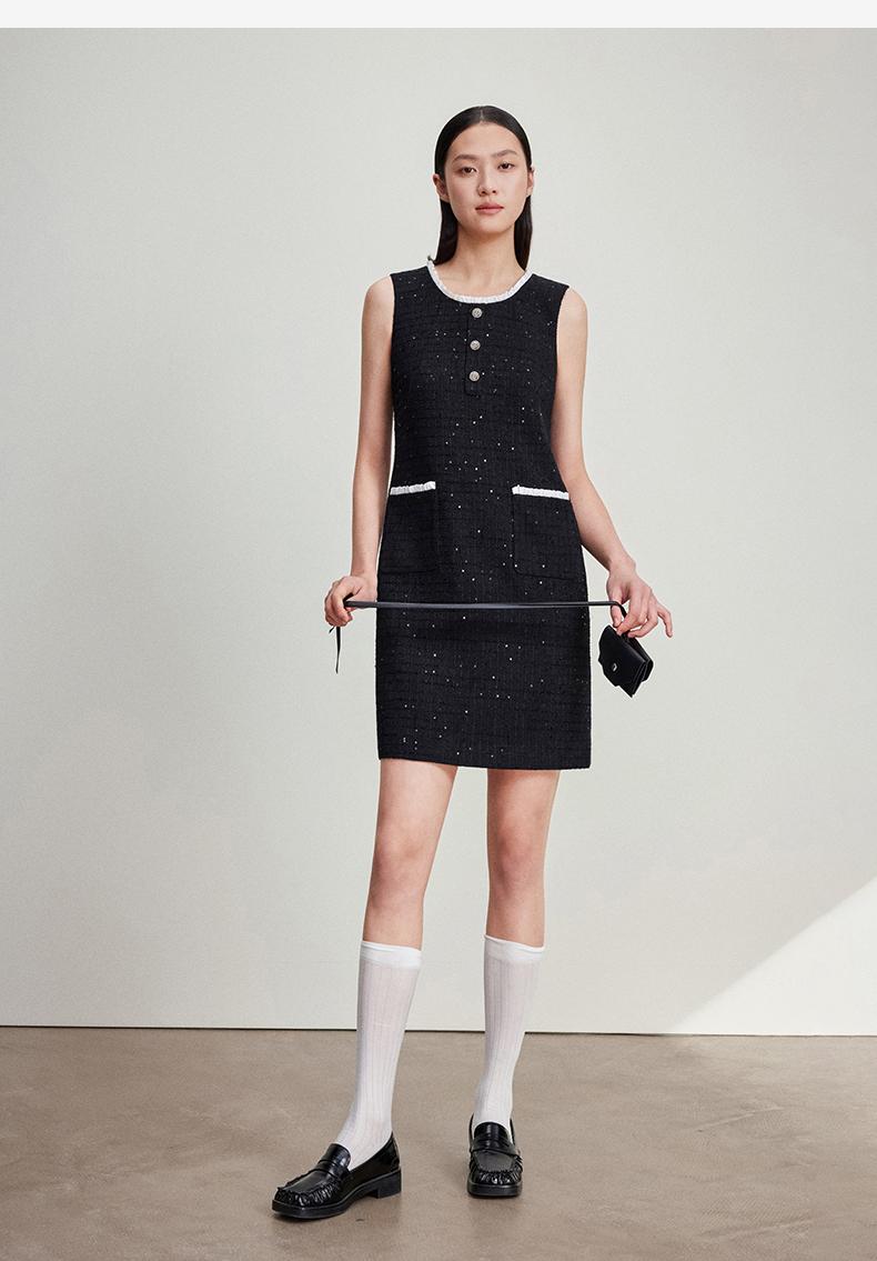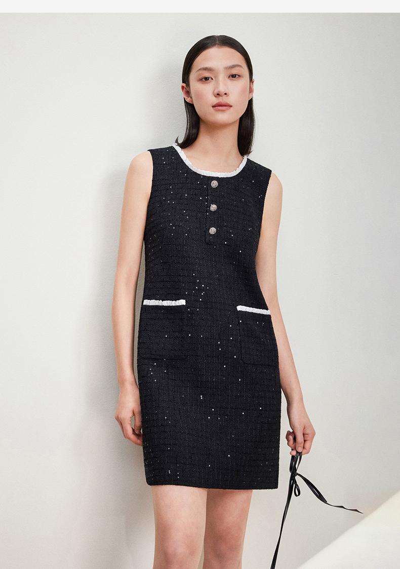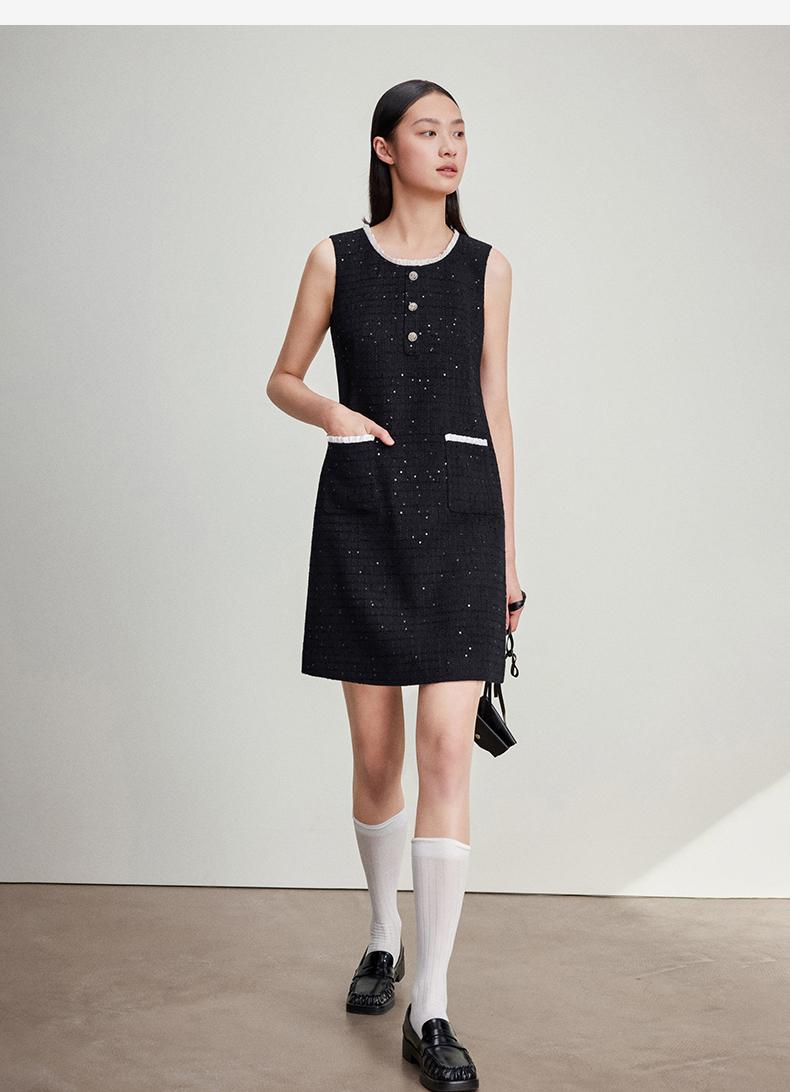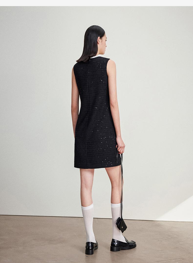 西嘉C+IMPRESS/西嘉暗格肌理亮片黑色小香风背心裙女荷叶边领口连衣裙LYQ2401066