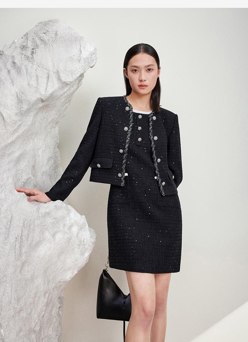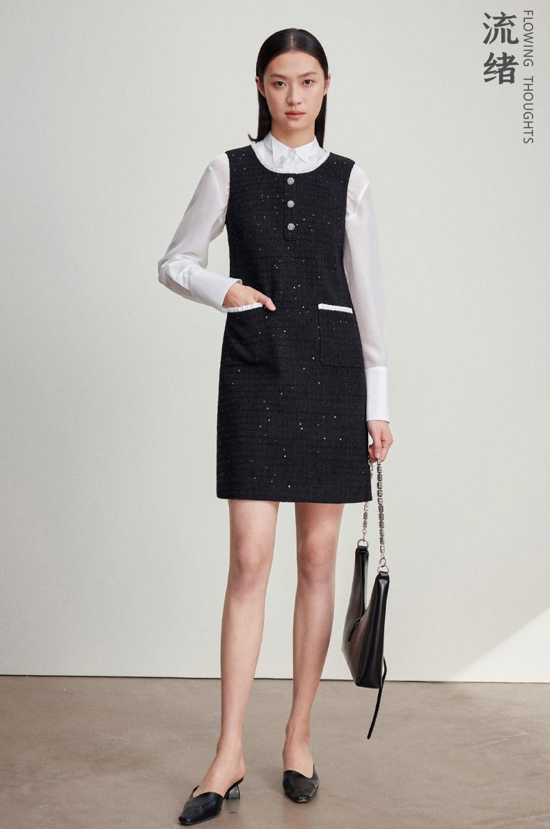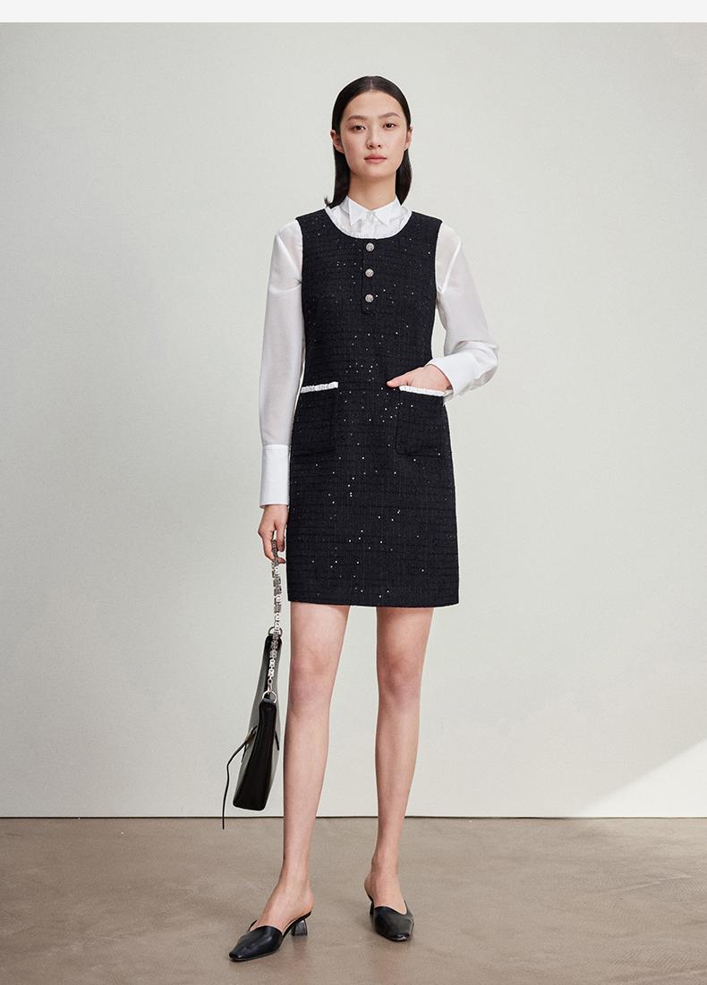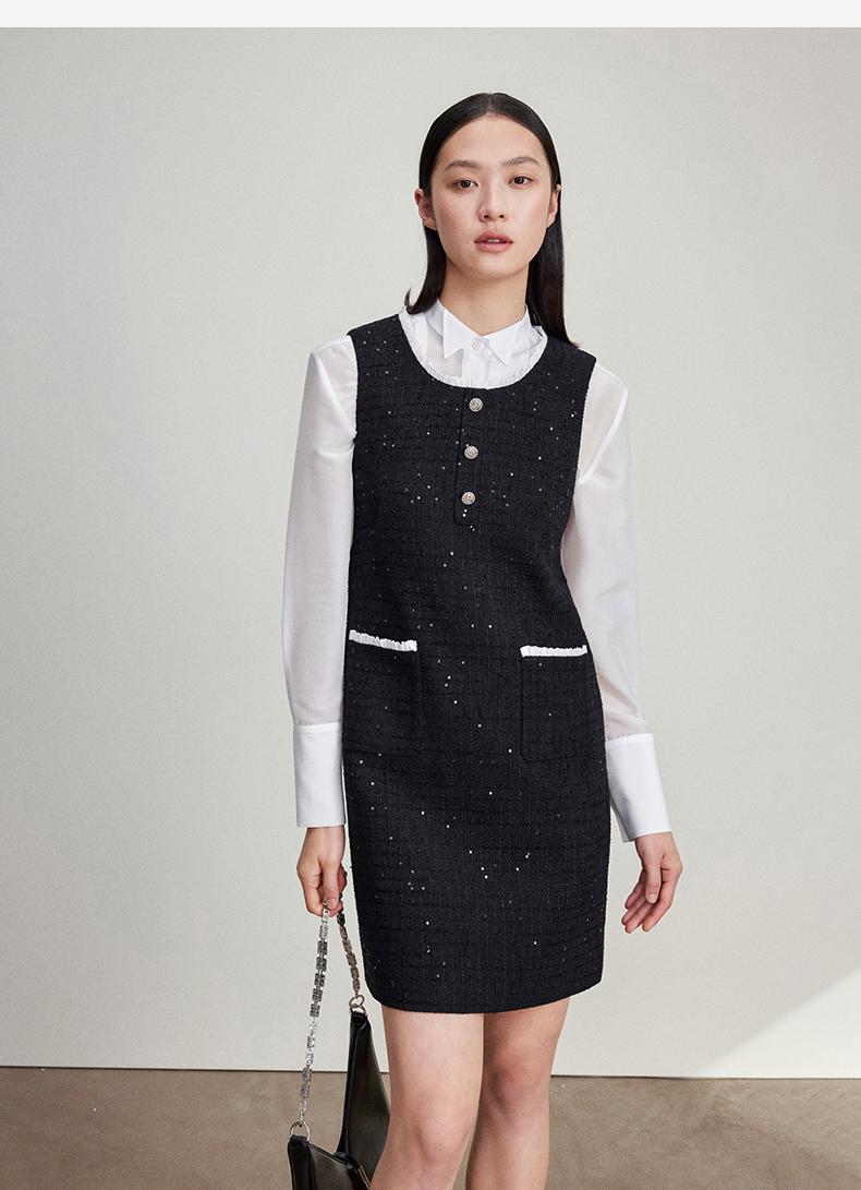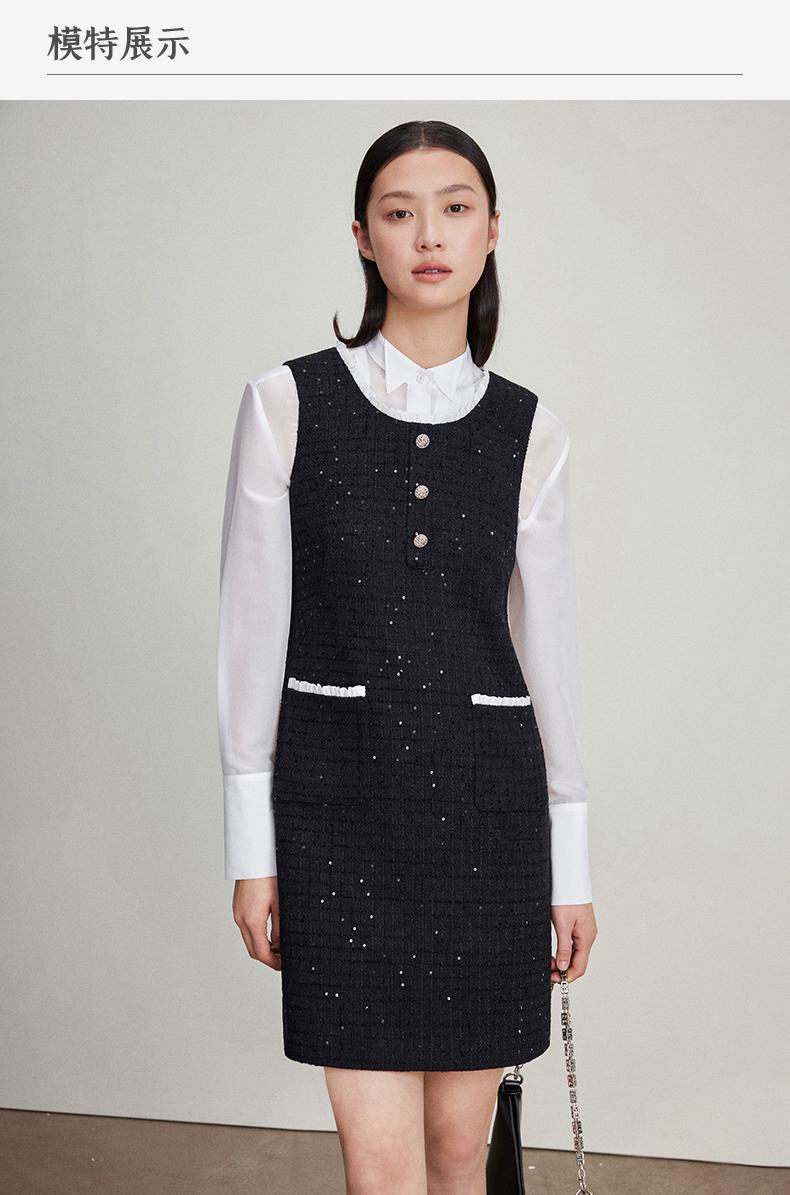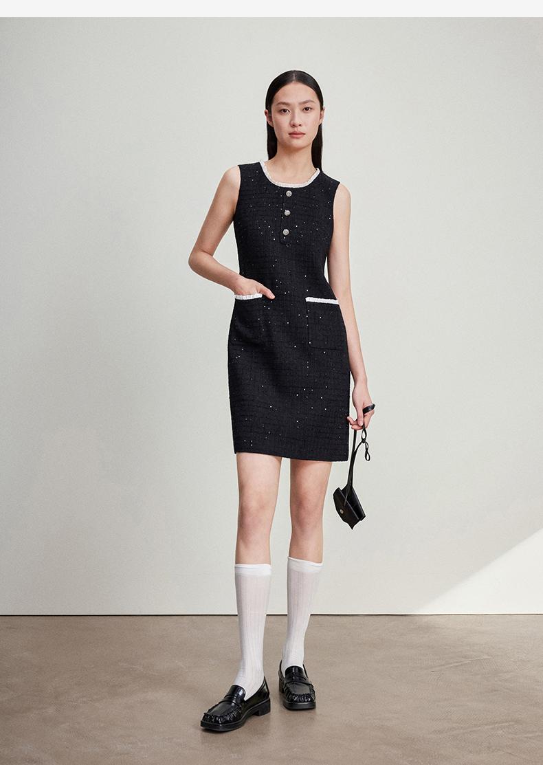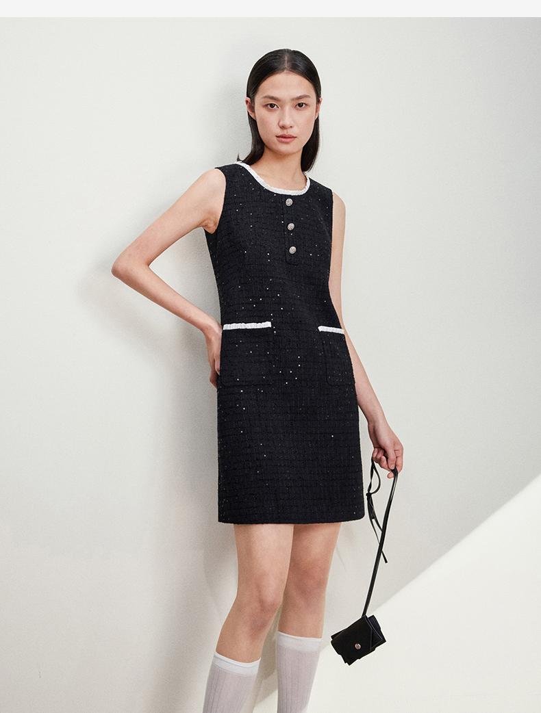 西嘉C+IMPRESS/西嘉暗格肌理亮片黑色小香风背心裙女荷叶边领口连衣裙LYQ2401066