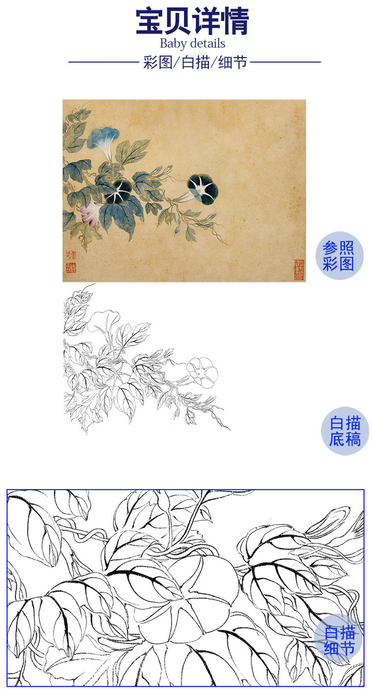 【有步骤、大彩图】王震工笔画白描底稿博古斗方小品《清供(春)》花瓶猫初学者临摹花鸟线稿WZ30