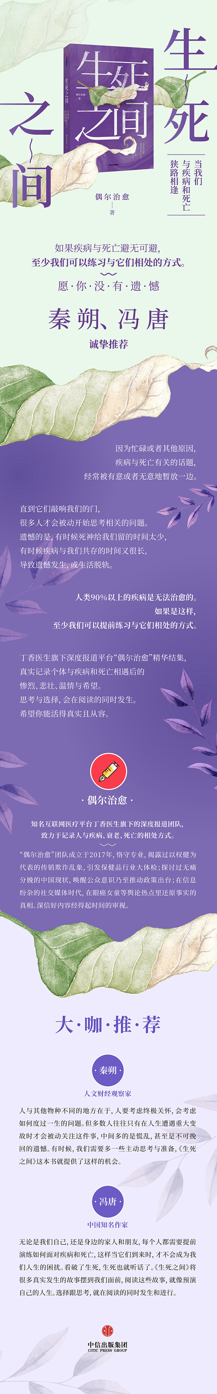“偶尔治愈”,知名互联网医疗平台丁香医生旗下的深度报道团队,曾经用笔尖将权健拉下神坛。在《生死之间》一书中,他们将现实生活中发生的人们与疾病和死亡相逢后的温情、悲壮、惨烈与伤痛真实展现在我们面前。阅读这些故事,就像预演自己的人生,思考与选择,也在阅读的同时发生和进行。