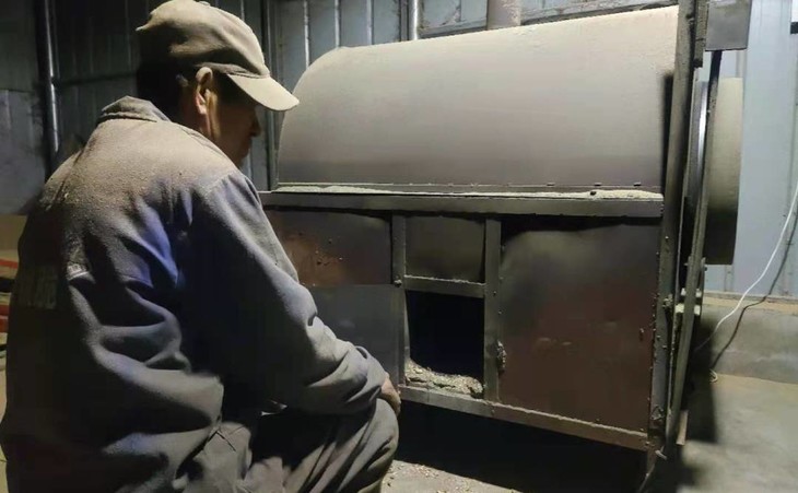 花生采用专用的炒干货小机器柴火炒制,和刘震一起炒花生的师傅是他一远房姐夫,临近年底,他们经常得加班到11点半,守在柴火面前。由于花生未进清洗会带着些灰尘,花生炒制完,老师傅也就像一个活生生的刚出土的兵马俑。