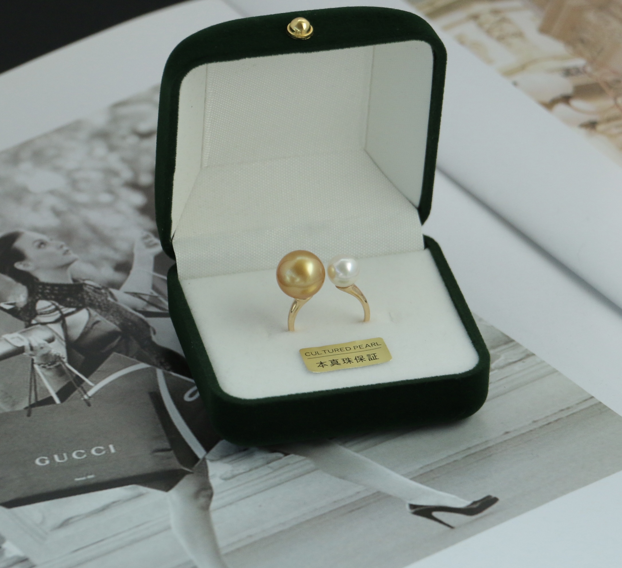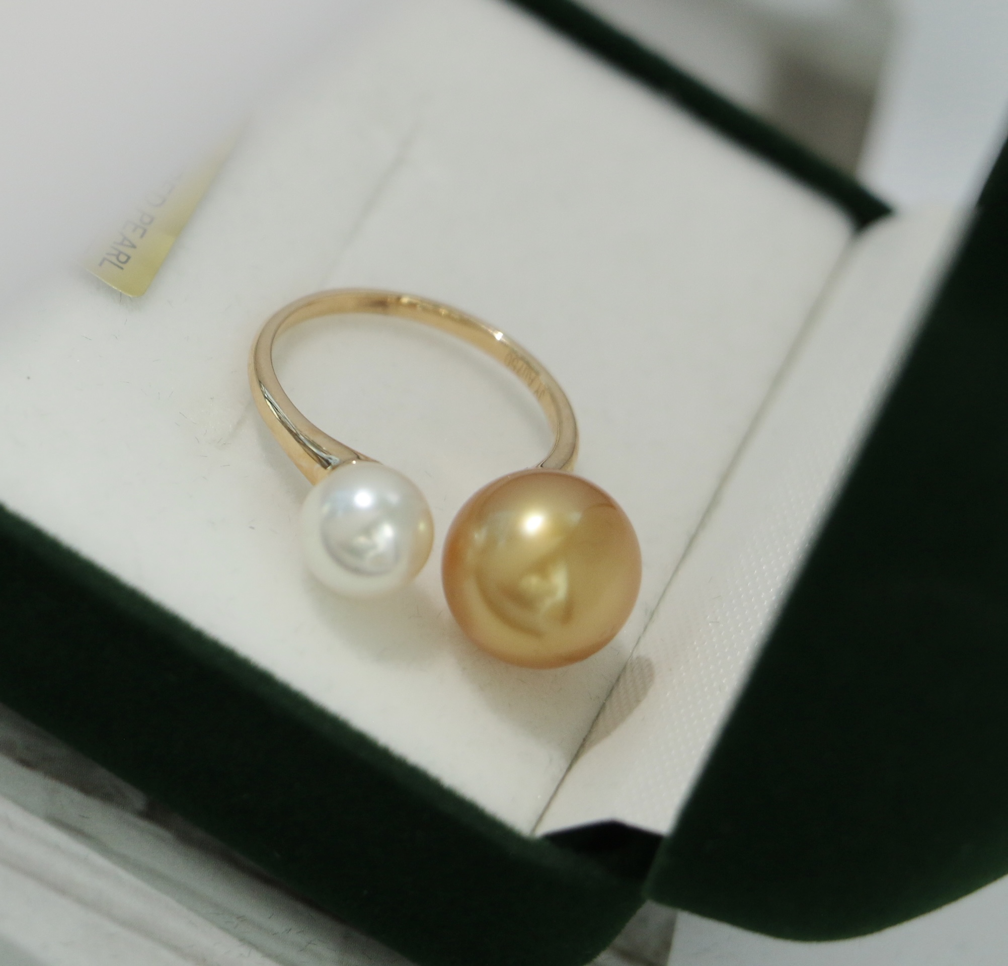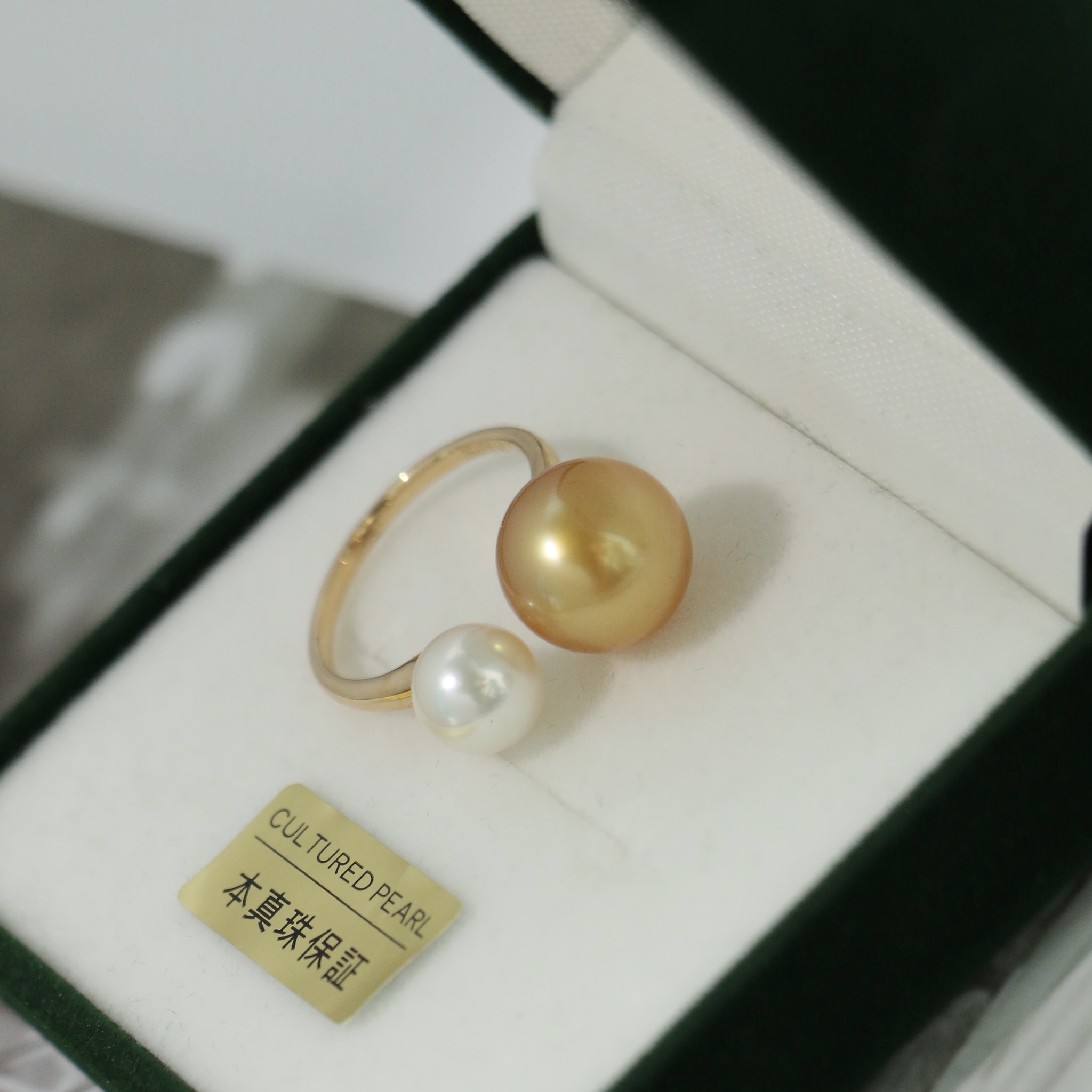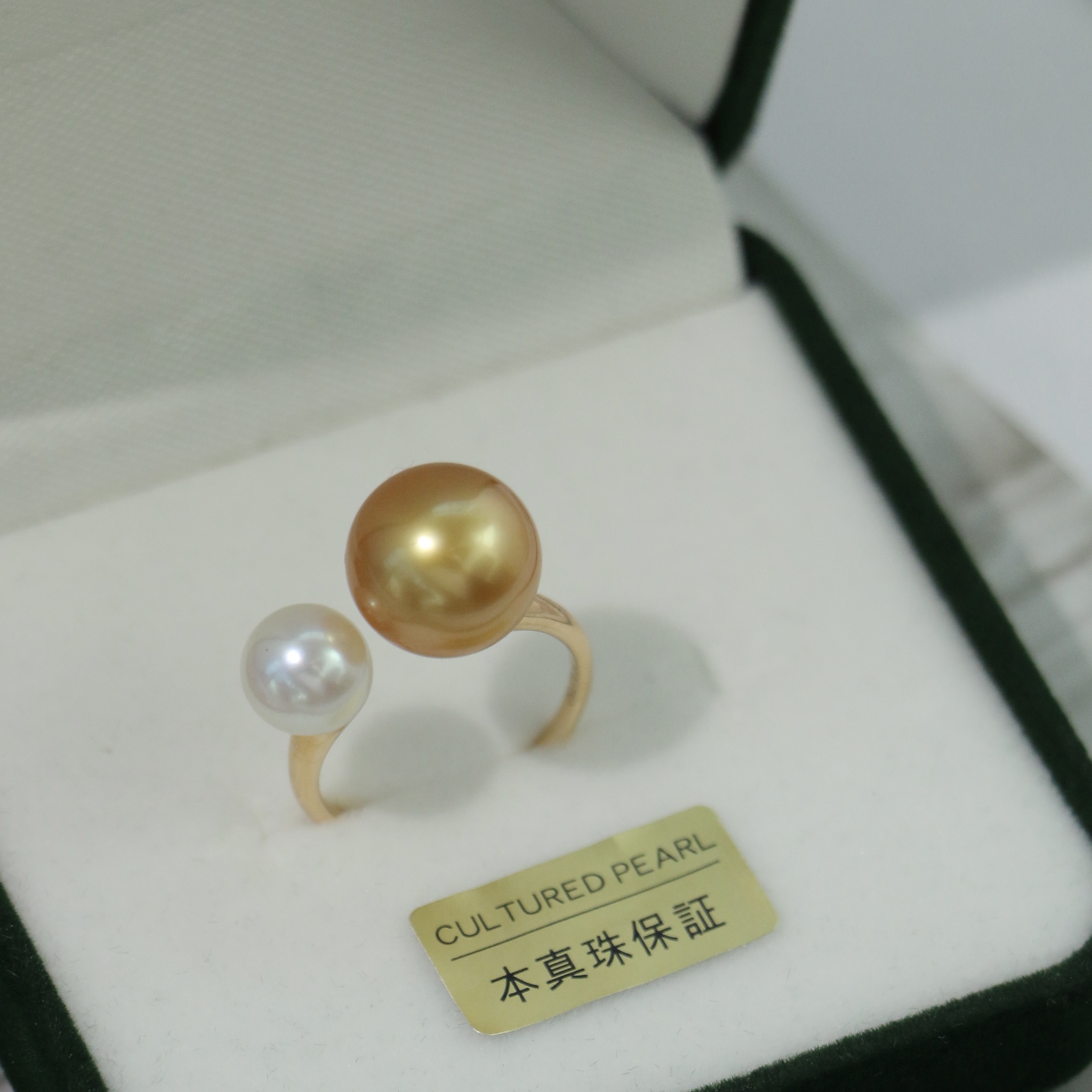 甄珠贝 贵气迷人的海水双珠戒指 倪妮同款 极强光镜面akoya 7-8mm + 金珠正圆11-12mm 简洁大气设计 惊艳的让人移不开眼 底部可能微微瑕 不影响佩戴