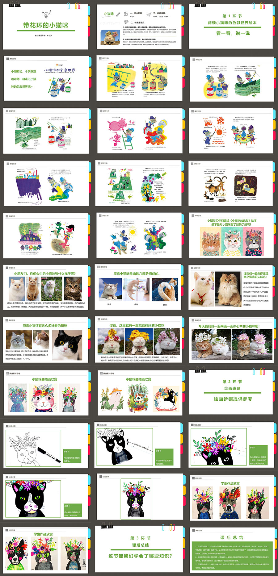 小猫长什么样子的呢?它的脑袋是怎样的呢?在画小猫咪的时候,除了表现小猫的特点,还可以展开丰富大胆的想象,为小猫设计毛发的花纹、花衣裳、花环、有趣的神态等,锻炼了小朋友的观察与创造能力。