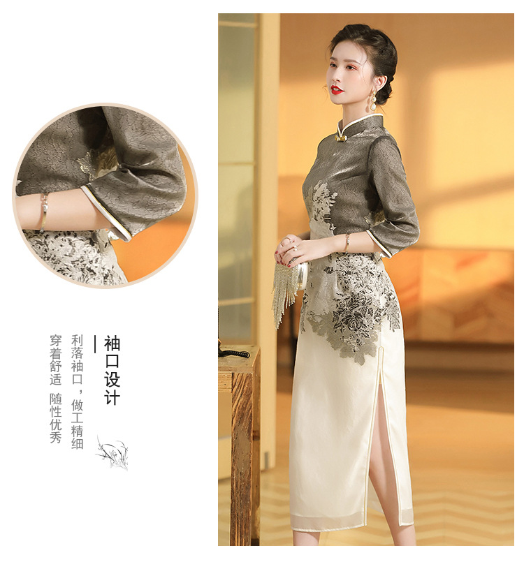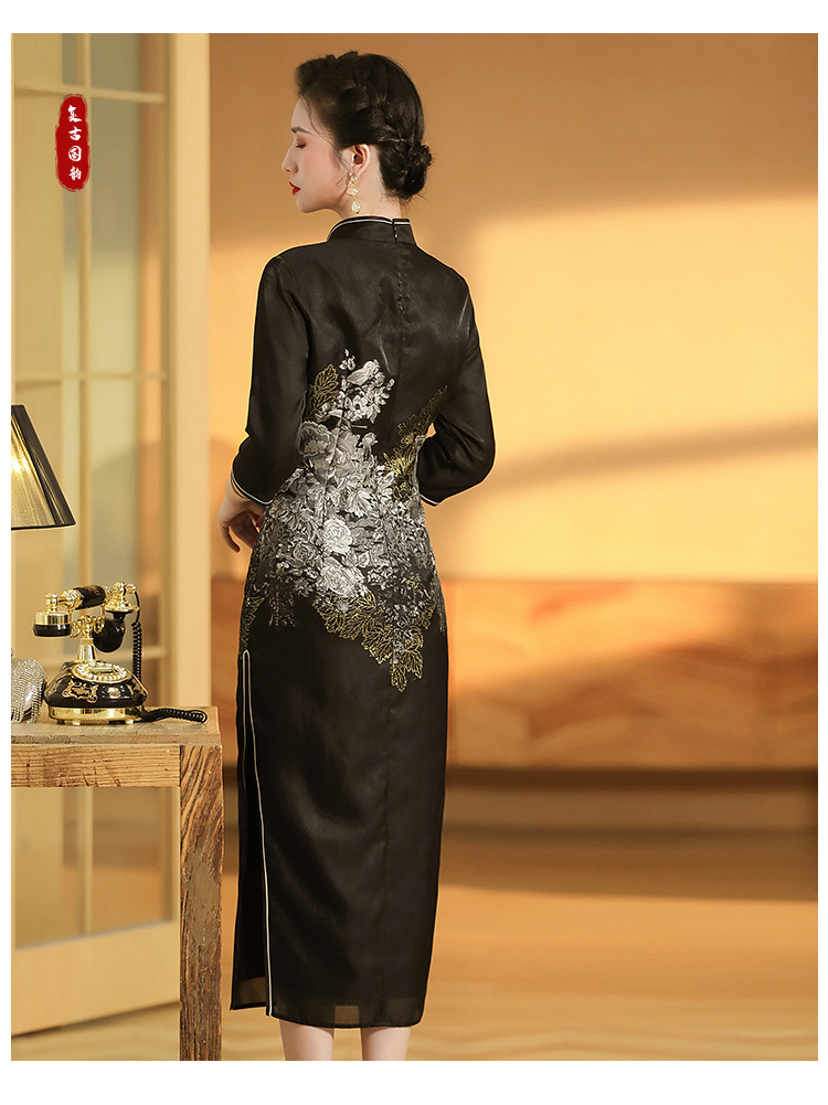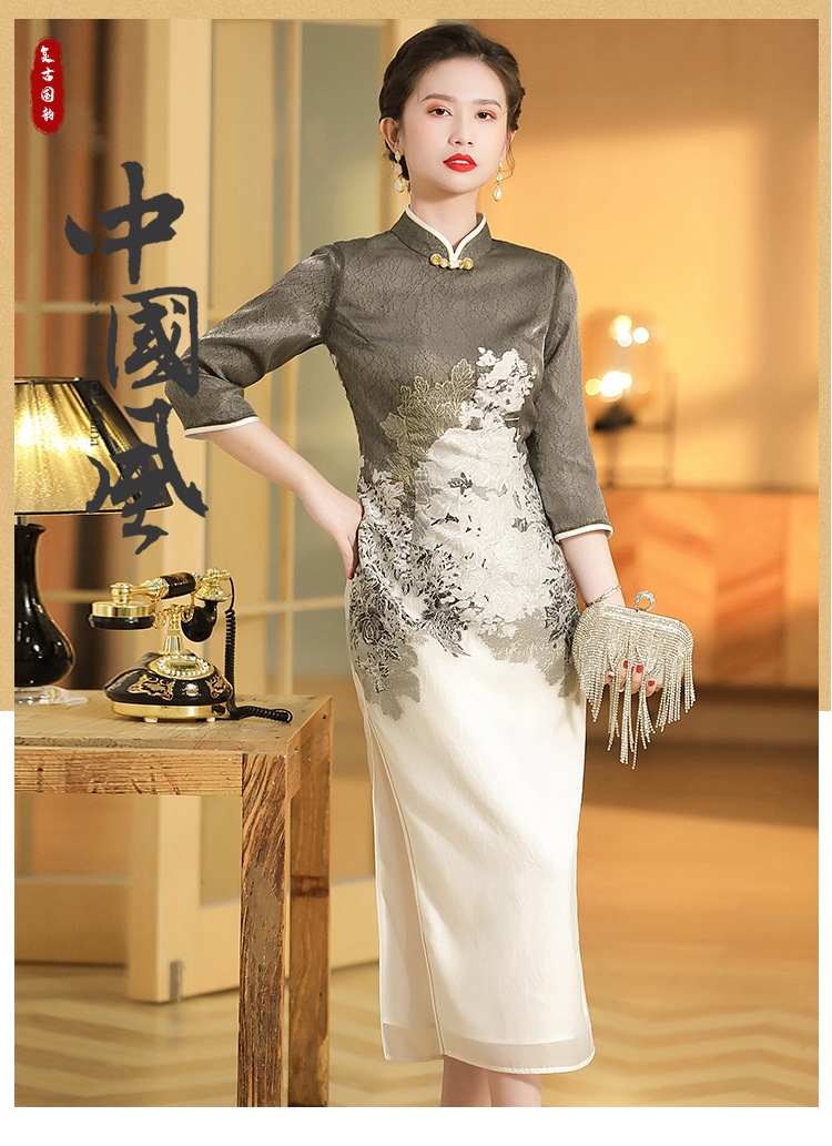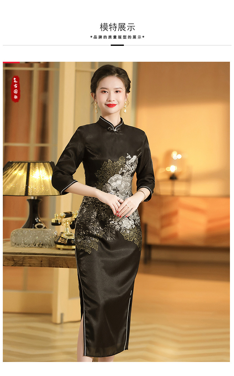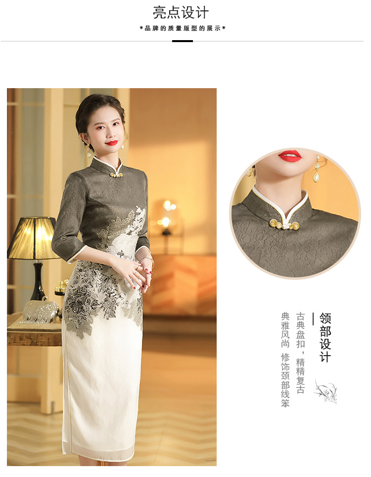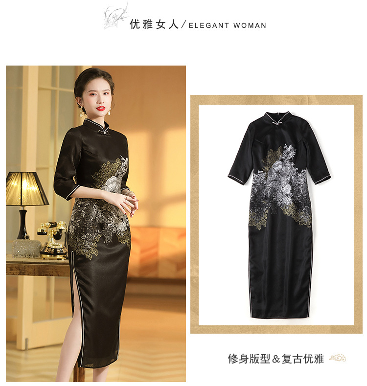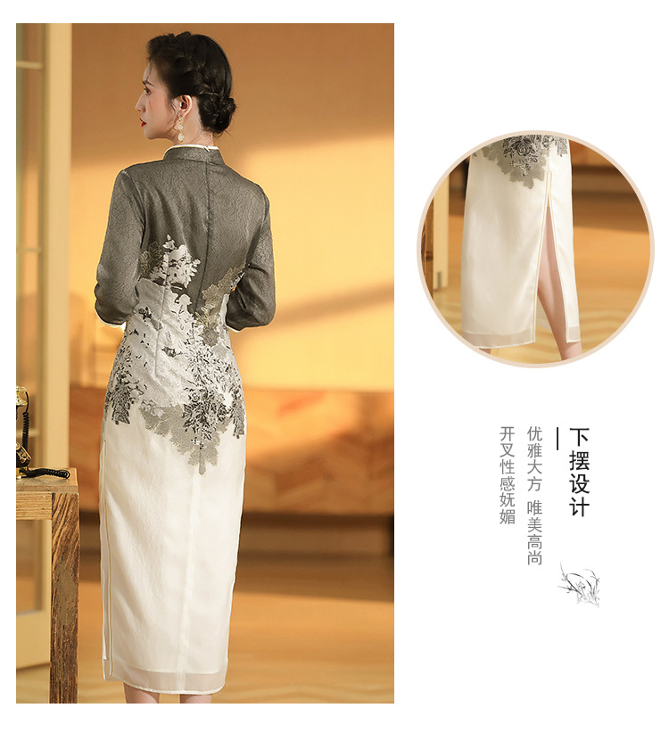 上海旗袍厂AYK-QF-200617提花鸟修身长款旗袍改良国风拼接撞色连衣裙秋季女装