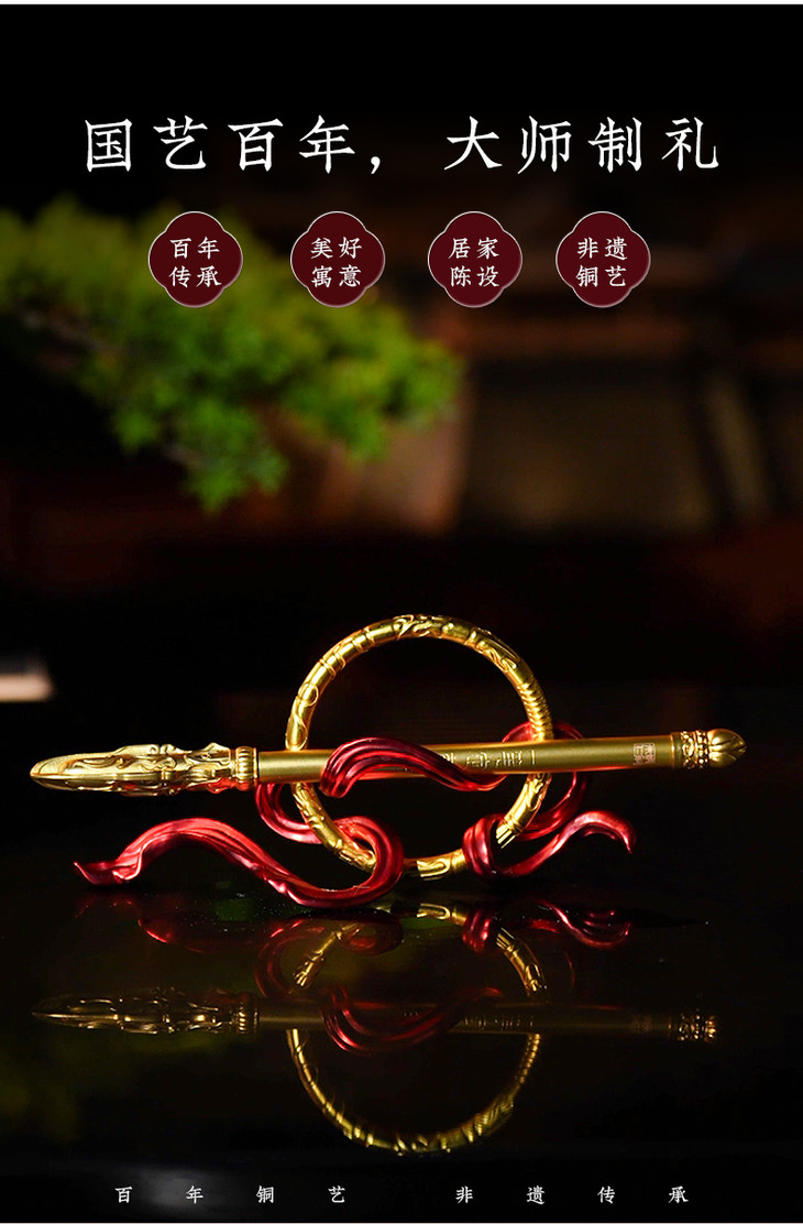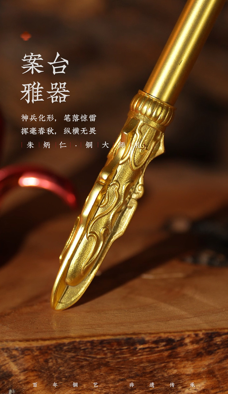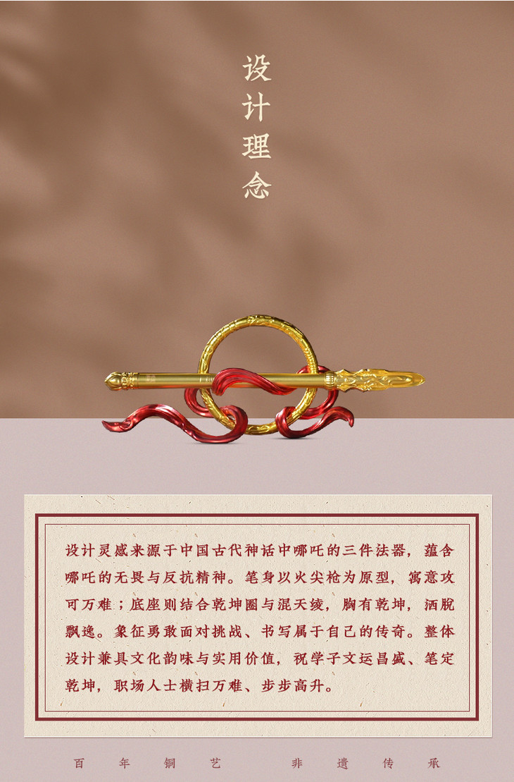 风火轮:哪吒的“坐骑”,载着哪吒腾上云霄、潜入大海。乾坤圈:金黄色的圆环,可变化大小,帮助哪吒击退敌人。混天绫:一条红绫,长七尺,随风而动,能自动捆绑敌人,力量强大。火尖枪:一把非常锋利的长枪,威力无比,是哪吒手中不可或缺的利器。朱炳仁·铜,把“火尖枪”化作铜笔,寓意着使用者拥有如哪吒般披荆斩棘的勇气,在知识海洋中探索,不惧困难,用手中的笔书写属于自己的精彩篇章,开启智慧与灵感的源泉。
