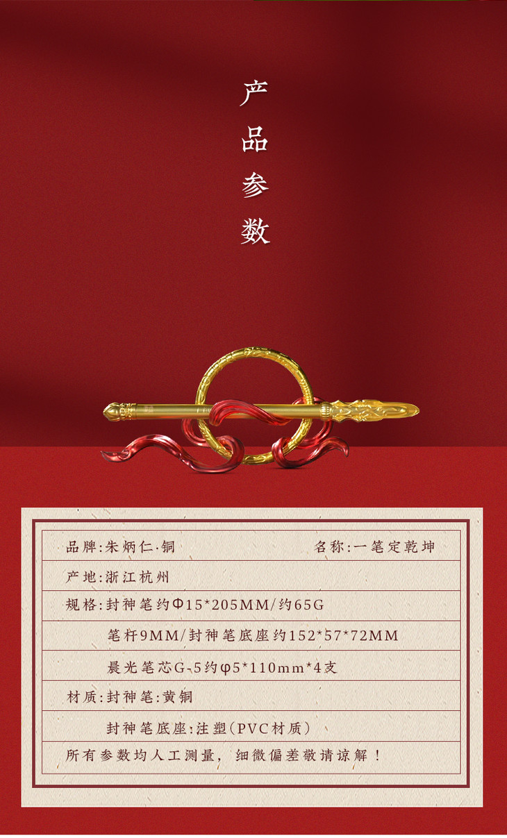 规格:封神笔约φ15×205mm/约65g,笔杆φ9mm,底座约152×57×72mm,晨光笔芯G-5约φ5×110mm×4支