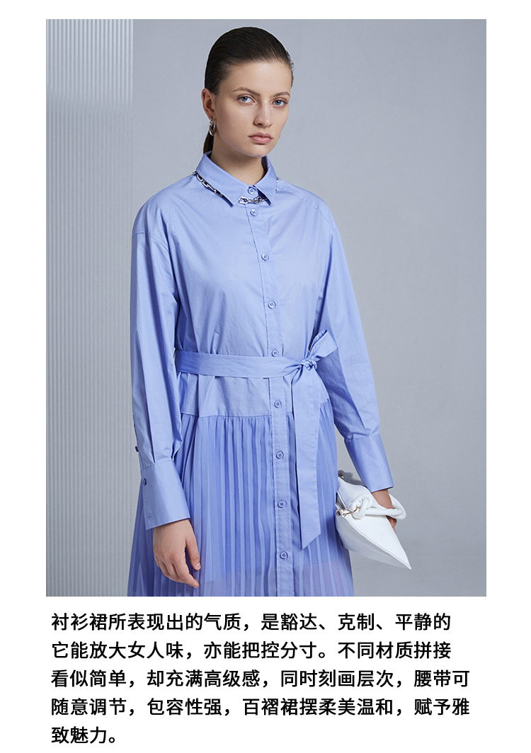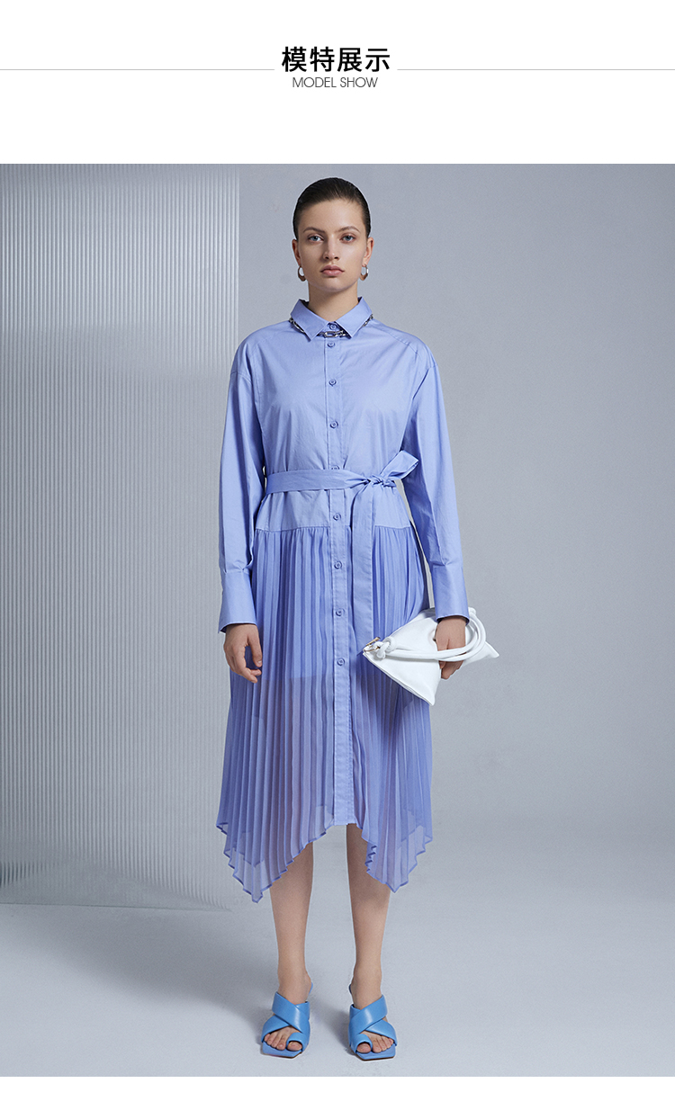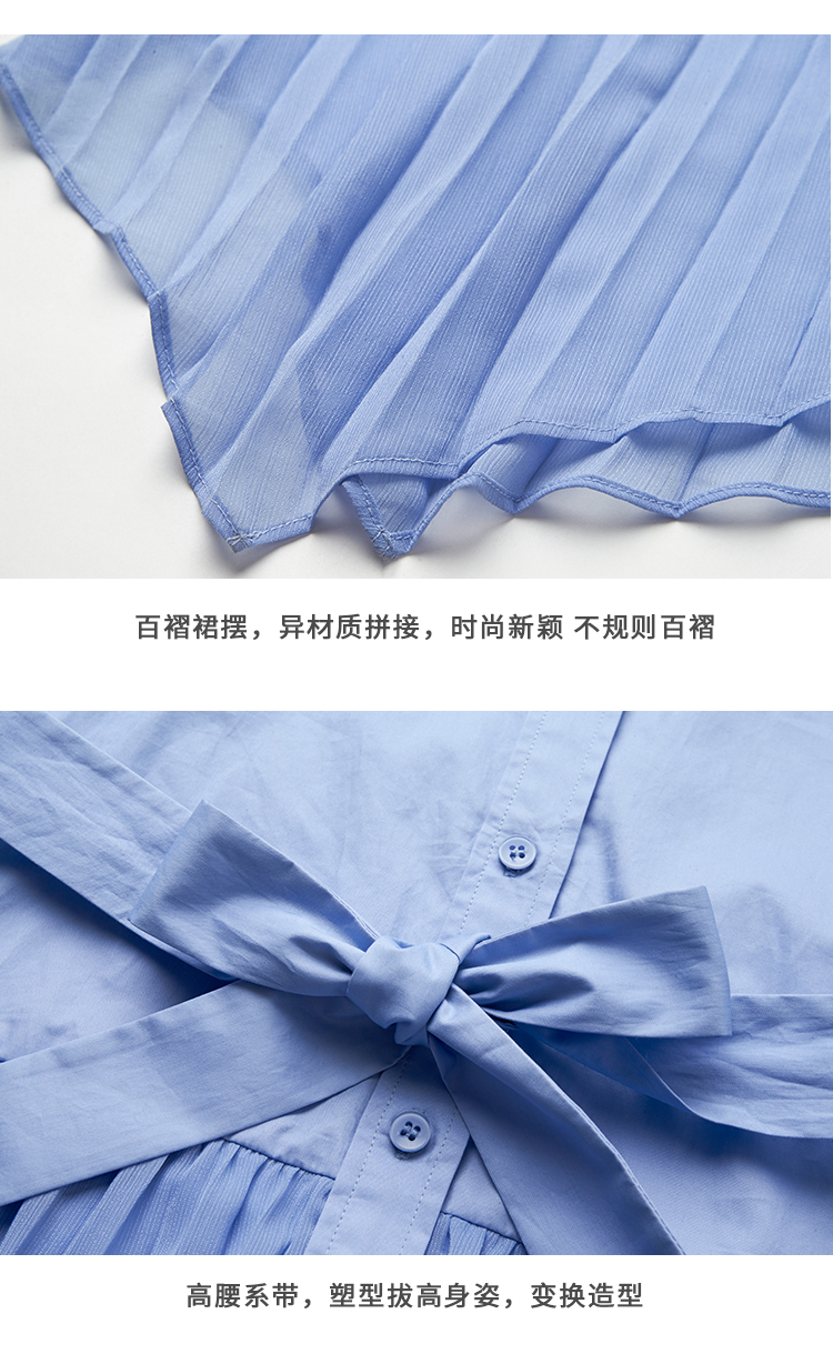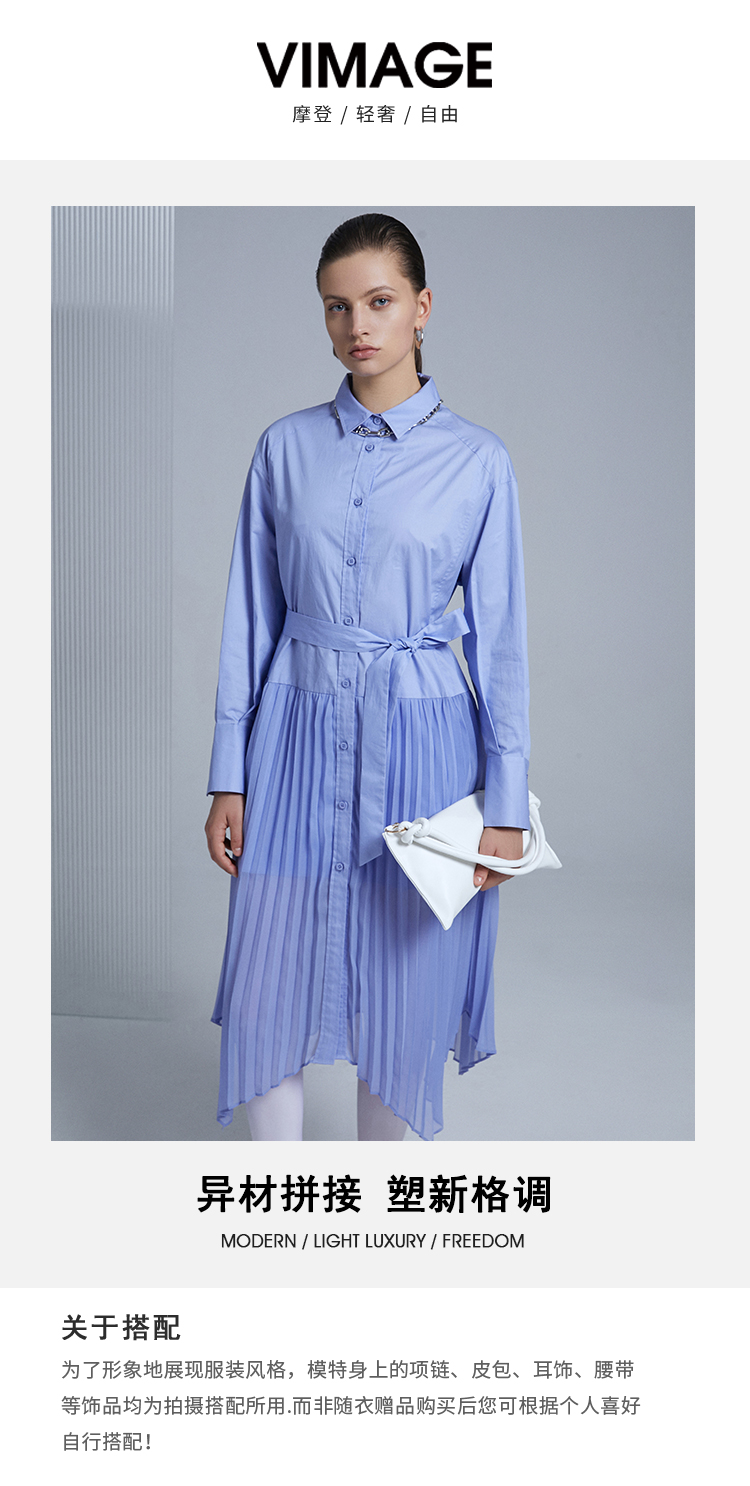 VIMAGE纬漫纪夏季纯色翻领拼接温柔气质百褶衬衫裙高腰绑带显瘦衬衣V1509106