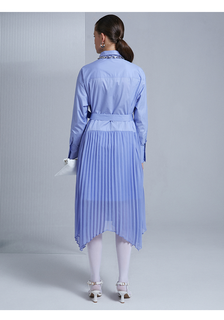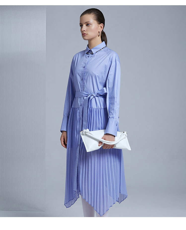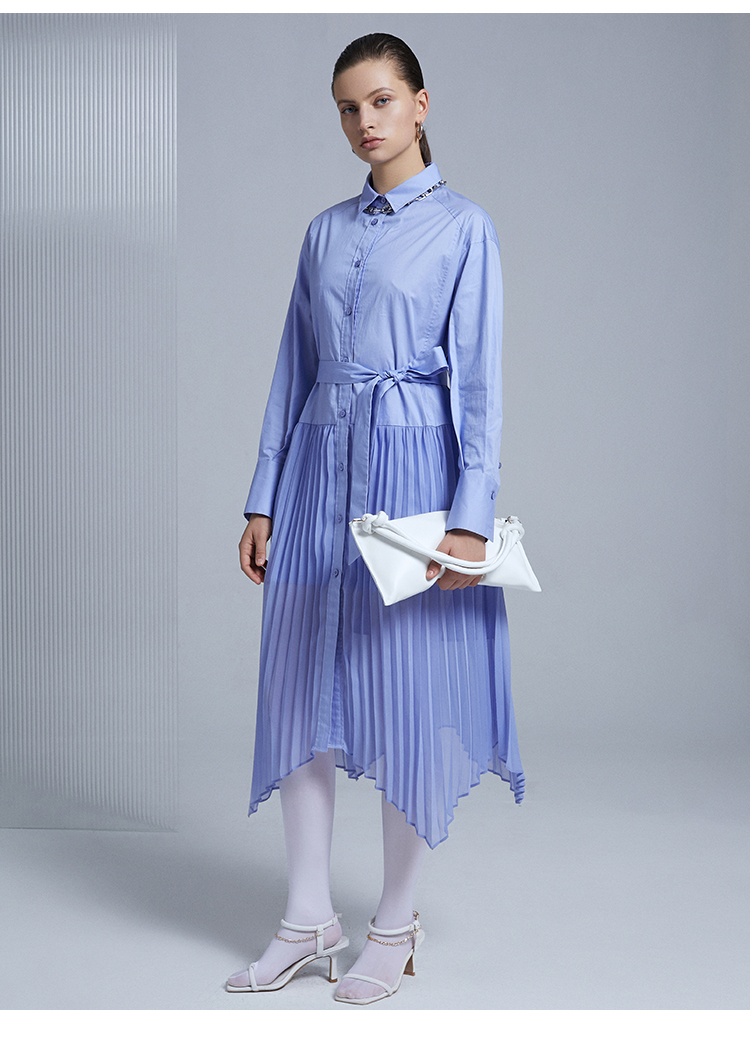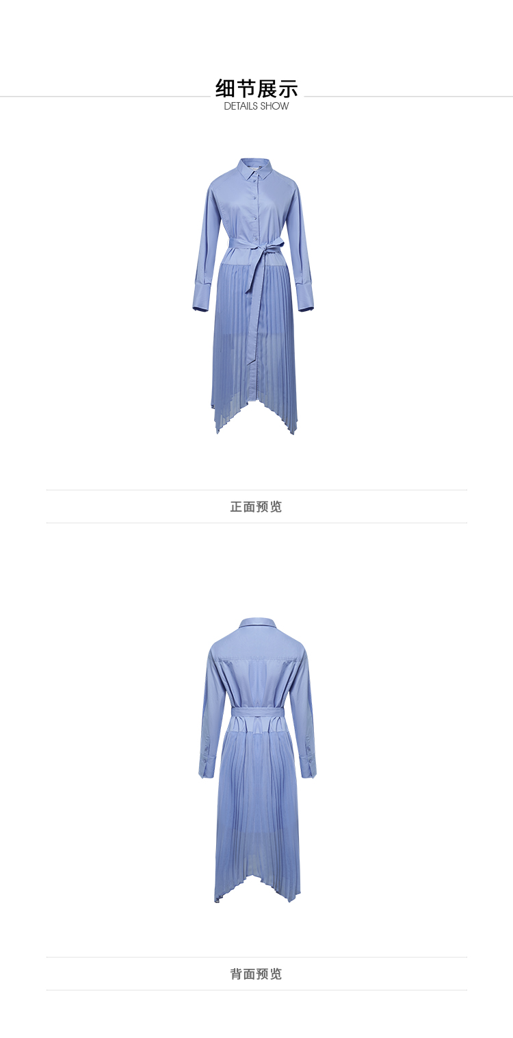 VIMAGE纬漫纪夏季纯色翻领拼接温柔气质百褶衬衫裙高腰绑带显瘦衬衣V1509106
