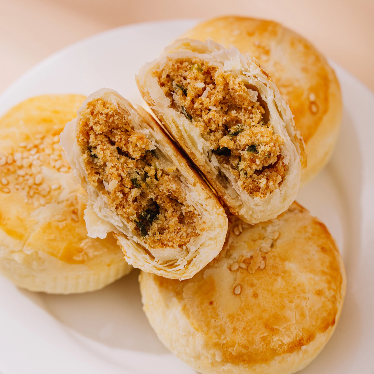 金黄酥皮多层饼壳上点缀粒粒提香的白芝麻,层层叠叠的酥脆,轻轻一咬就碎在嘴里,柔软蓬松的内馅嚼起来就像鲜美的肉松,丝丝入味。