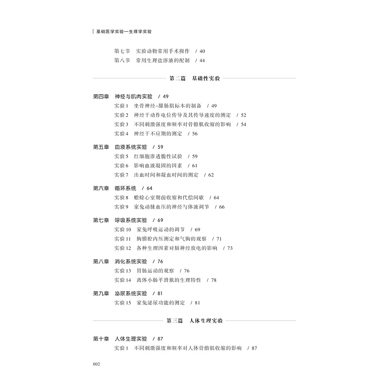 本书内容包括基本实验技术、基础性实验、综合性实验三部分。基本实验技术部分系统介绍常用仪器、实验动物、动物实验技术的基本知识和应用拓展。基础性实验以经典实验为主线,从六大系统精选22项动物实验和人体机能实验。综合性实验为基础性实验的延伸。课后附有习题及临床知识拓展。本书为浙江省“十四五”新医科重点建设教材。根据新医科建设的要求,以培养学生动手能力和主动探索为目标,以“基础-综合-应用”为框架进行编写。优化实验内容,保留经典的动物实验,引入更多的人体机能实验;形式上植入二维码,融入数字化资源,精选原创实验视频和教学资料,注重思政元素和医学发展前沿的相关知识拓展,有利于培养学生的实践能力、知识应用能力和创新性思维。