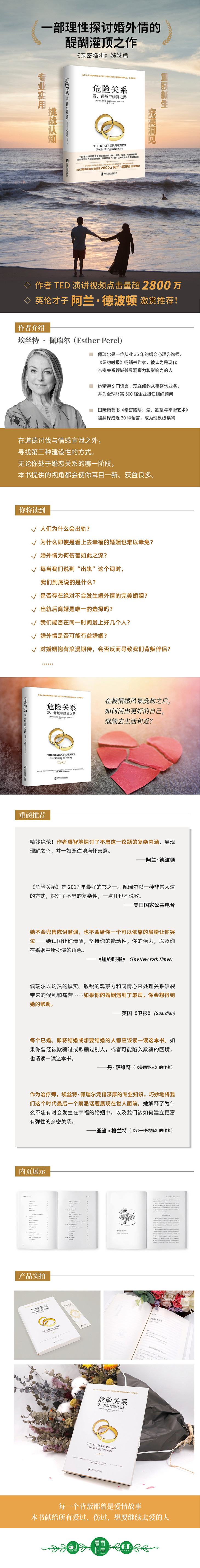 作者还认为,婚外情让我们对现代婚姻关系所学甚多——认识到我们在期望什么,想要什么,觉得自己应当得到什么。婚外情打开了一个独特的窗口,我们从中可窥见自己内心与文化中有关爱情、诱惑与承诺的观点。她从多个角度探讨犯禁之爱,与读者对形形色色的现代婚姻共同展开一场诚实袒露、启迪人心及趣味盎然的探索之旅。《危险关系》充满闪亮的智慧,并提出一个大胆的架构,让我们对错综复杂的爱情与渴望有所洞悉。正如作者所说:“爱都是纠缠不清的,外遇更是如此。然而,外遇也是一个无可比拟的窗口,让我们能够窥见人类心中的裂缝。